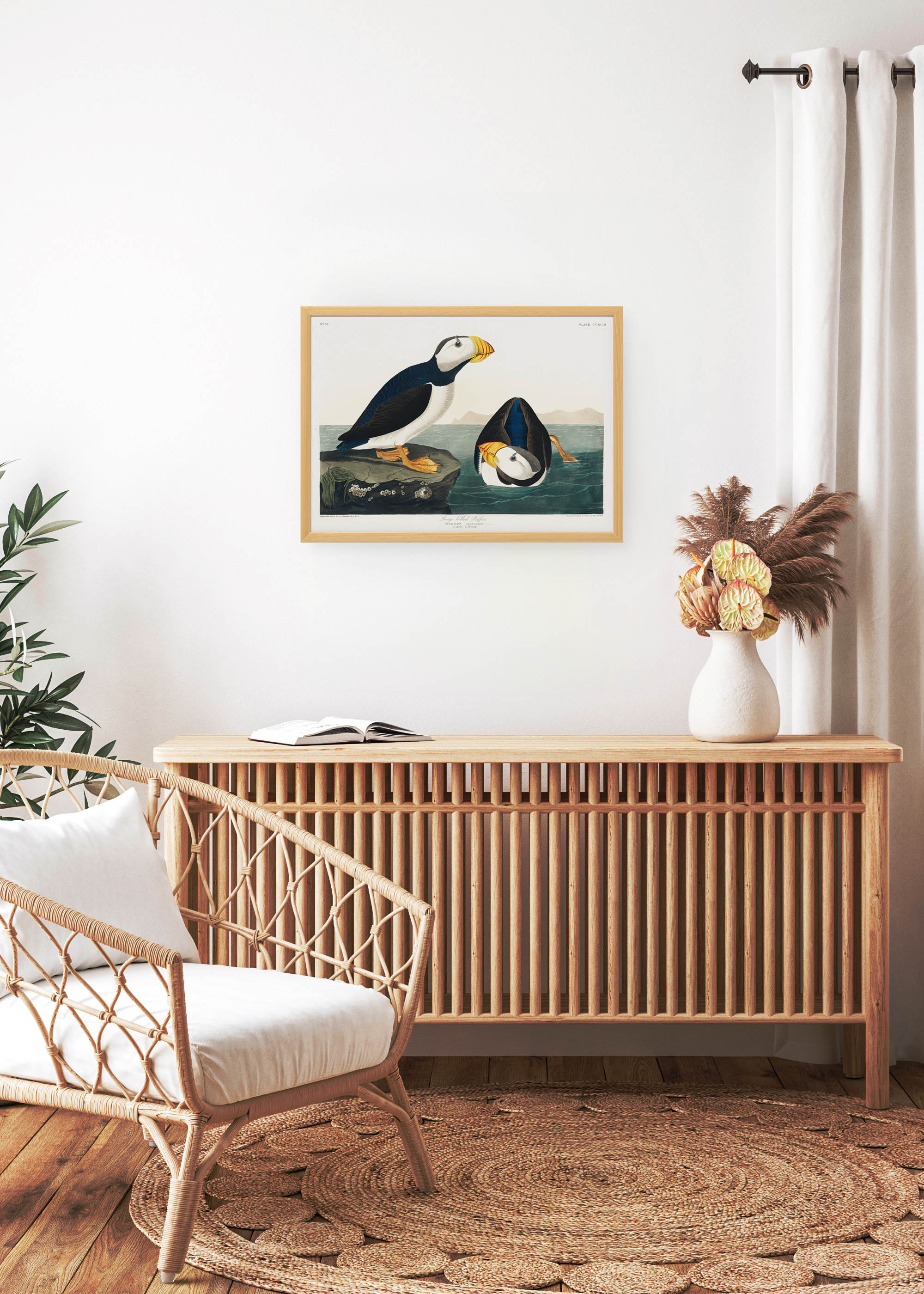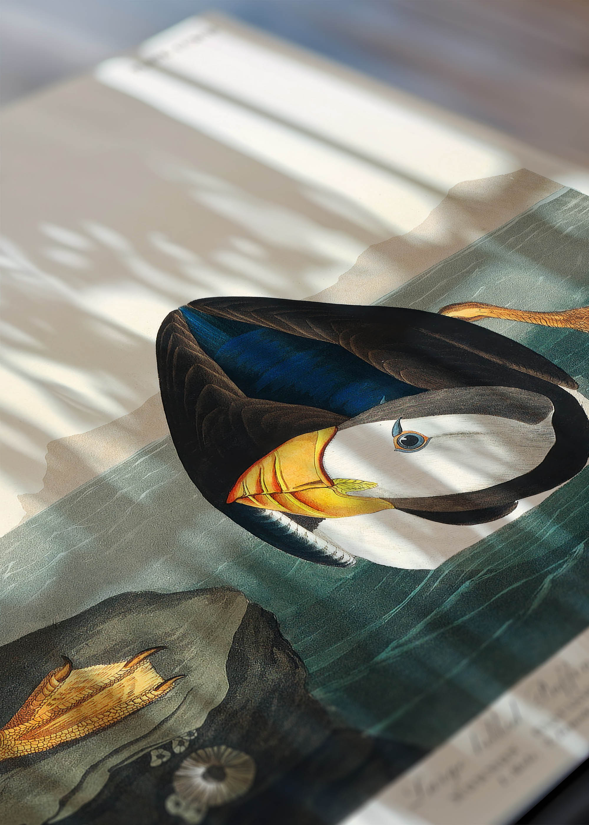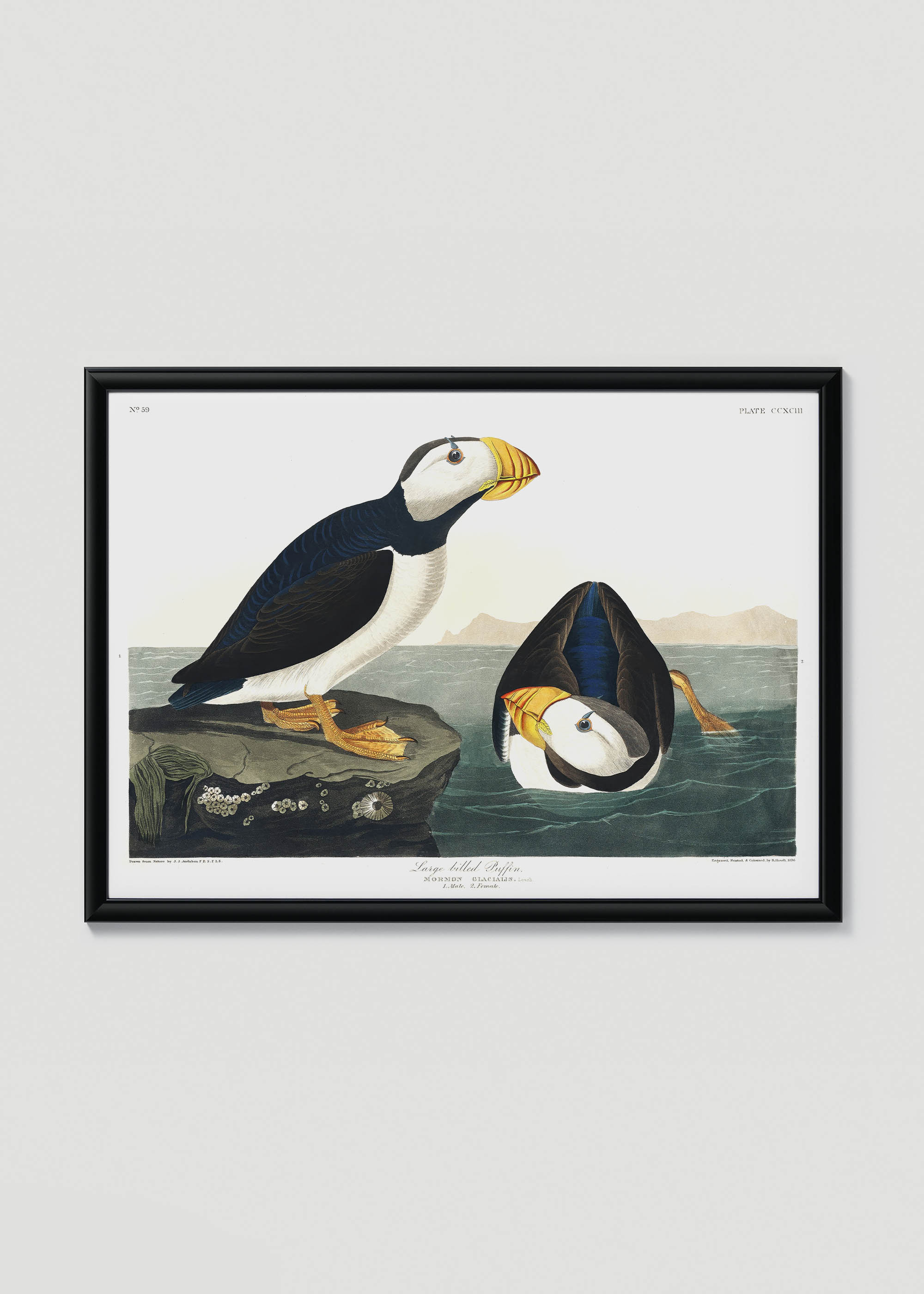 Plakat prezentuje wspaniałą ilustrację maskonura czarnogłowego, pochodzącą z monumentalnego dzieła Johna Jamesa Audubona „Birds of America”. To opus magnum amerykańskiego ornitologa i artysty powstało w latach 1827-1838 i do dziś uznawane jest za jedno z najwspanialszych osiągnięć w historii ilustracji przyrodniczej. Audubon, który spędził lata na obserwowaniu ptaków w ich naturalnym środowisku, stworzył 435 akwarel przedstawiających północnoamerykańskie gatunki w skali 1:1 – niektóre plansze osiągały rozmiary niemal metra!