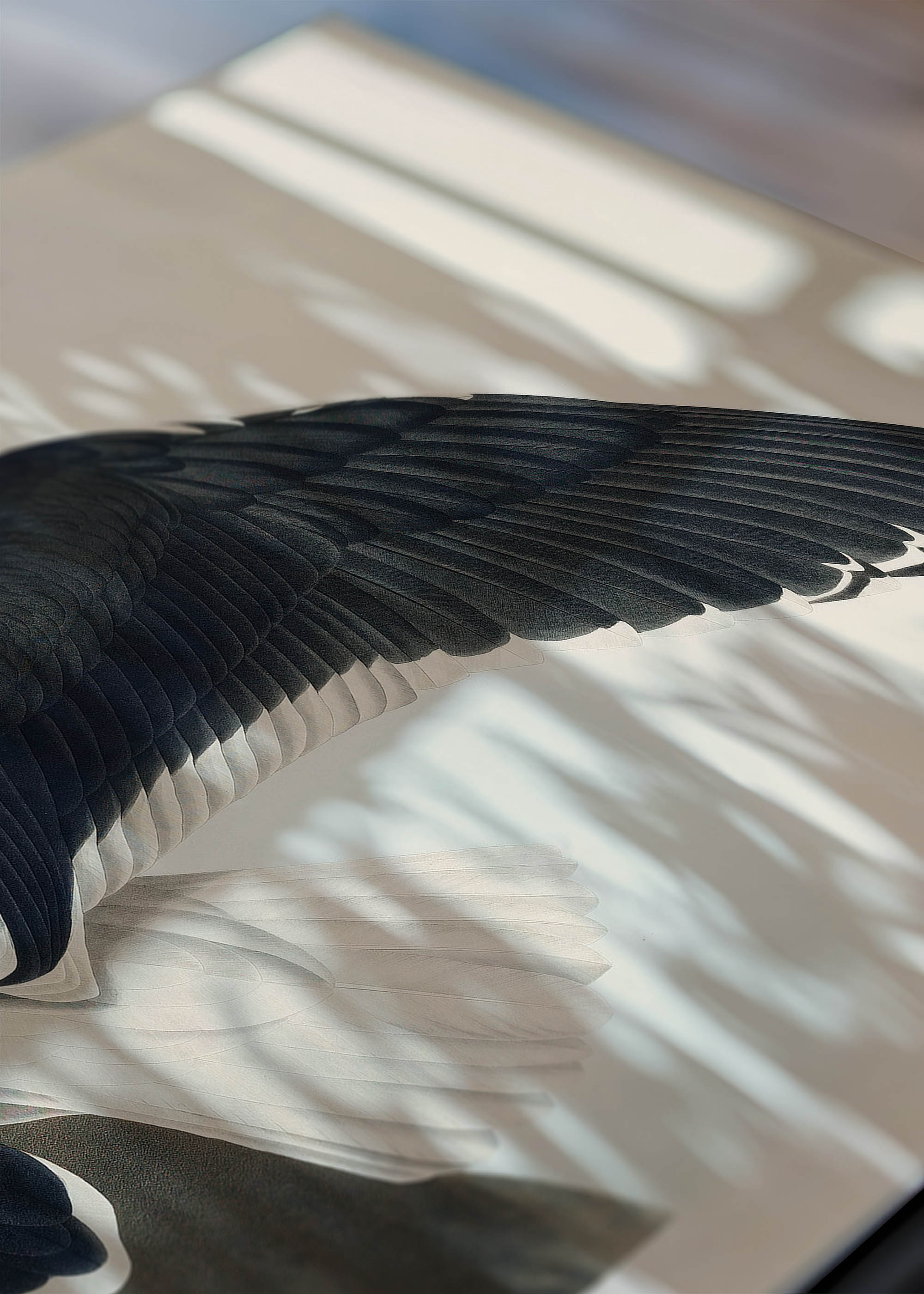 Prezentowany plakat ukazuje mewę czarnogłową w dramatycznym ujęciu, gdy ptak rozpościera potężne skrzydła, szykując się do wzlotu z kamienistego brzegu. Kolorystyka dzieła opiera się na kontrastowej palecie – dominują głębokie, niemal grafitowe tony czerni skrzydeł, które przechodzą w śnieżnobiałe pióra brzucha i ogona. Akcenty karminowej czerwieni widoczne na nogach i dziobie ptaka ożywiają kompozycję, podczas gdy tło utrzymane jest w stonowanych barwach zbliżonych do sepii i oliwkowej zieleni.