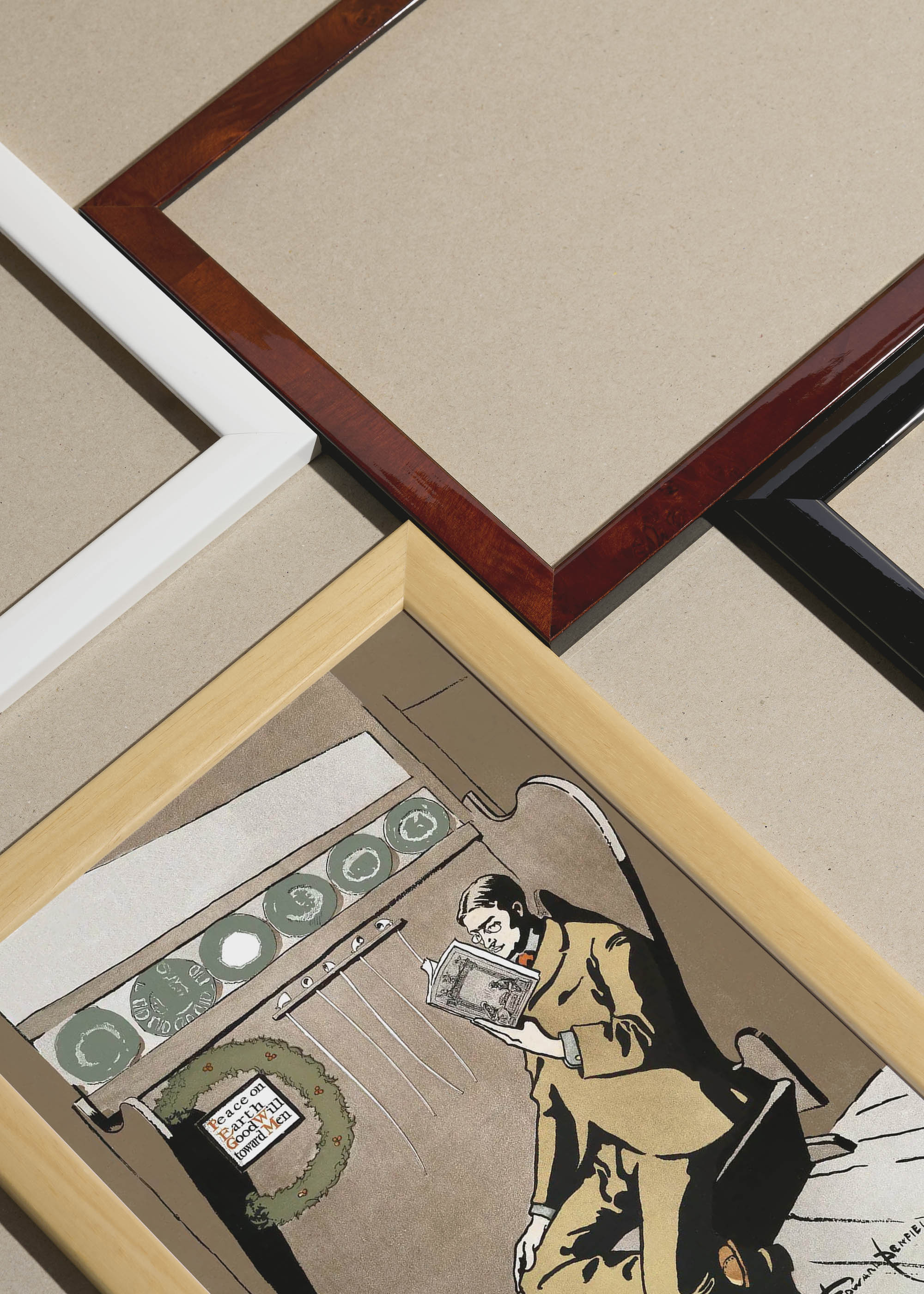 Packshot ramek Plakatello® wykonanych z włoskich i polskich listew ramiarskich. Ramy tworzone ręcznie w pracowni w Lublinie z wykorzystaniem tradycyjnych manualnych narzędzi. Każda rama jest indywidualnie wykańczana i kontrolowana przed wysyłką. Szeroka paleta kolorów pozwala dobrać idealną oprawę do plakatów i obrazów.