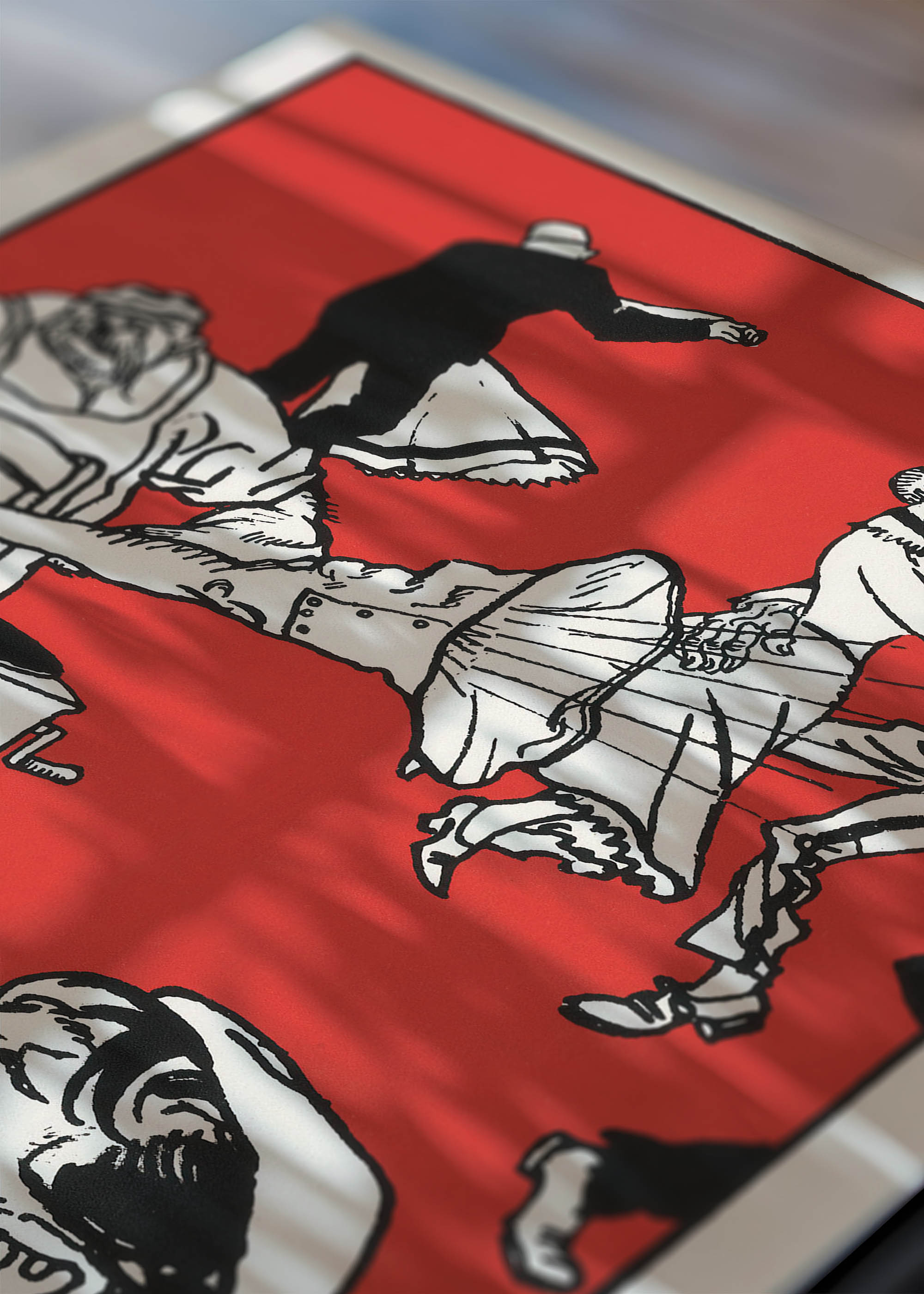 Kompozycja ukazuje dynamiczną scenę pełną ruchu i napięcia. Centralna postać – jeździec na koniu – zdaje się wyrywać z kadru, podczas gdy pozostałe figury tworzą teatralną, niemal cyrkową scenografię. Artysta wykorzystał kontrastową paletę barw: intensywną cynobrowoczerwoną płaszczyznę tła zestawił z czernią i bielą postaci, tworząc efekt graficzny przypominający drzeworyt. Te śmiałe tony nadają całości dramatycznego charakteru, podkreślając groteskowy wymiar przedstawienia.