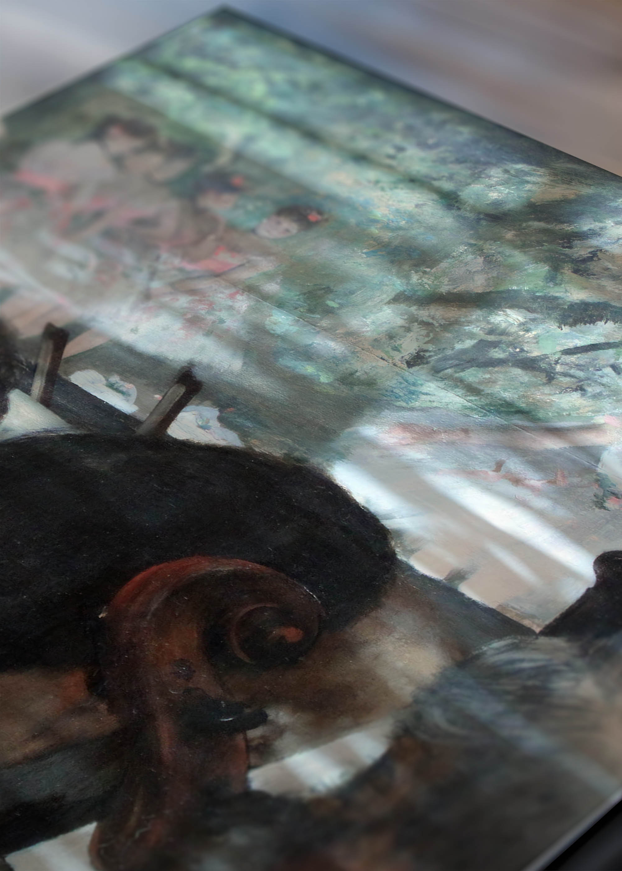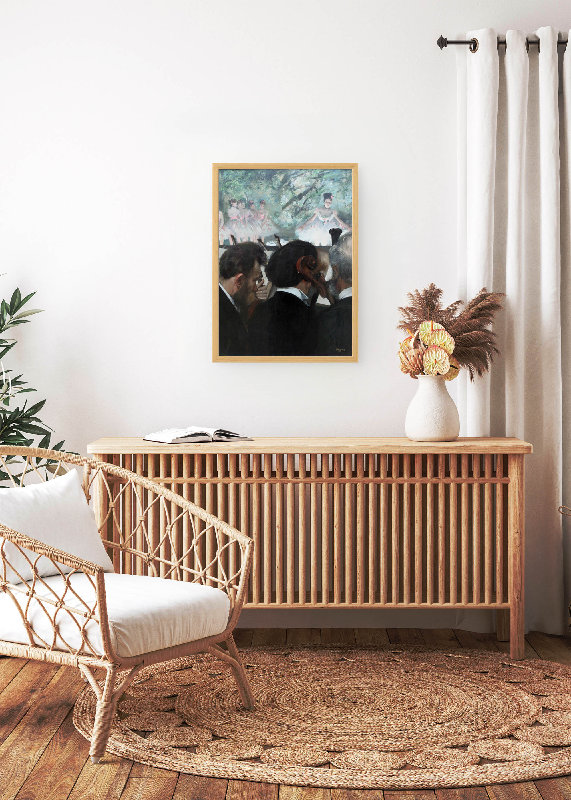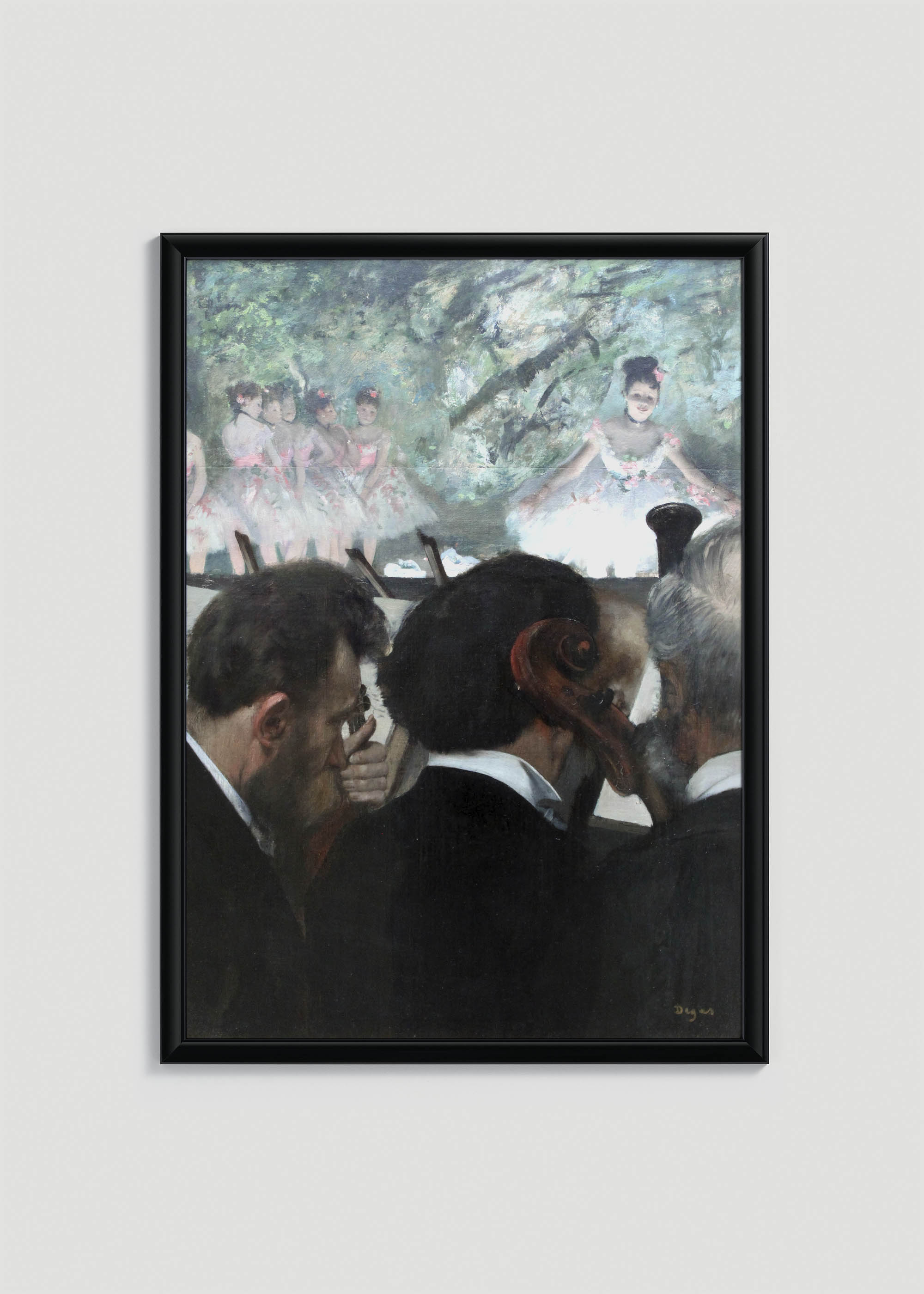 Ten wyjątkowy plakat przedstawia reprint słynnego dzieła Edgara Degasa „Muzycy w orkiestrze”, powstałego około 1872 roku. Degas, mistrz impresjonizmu i fascynat paryskiego życia kulturalnego, stworzył to dzieło obserwując spektakle w Operze Paryskiej. Artysta znany był z niekonwencjonalnych kompozycji i umiejętności uchwycenia spontanicznych momentów – tutaj genialnie zestawił świat muzyków z baletnicami na scenie w tle.