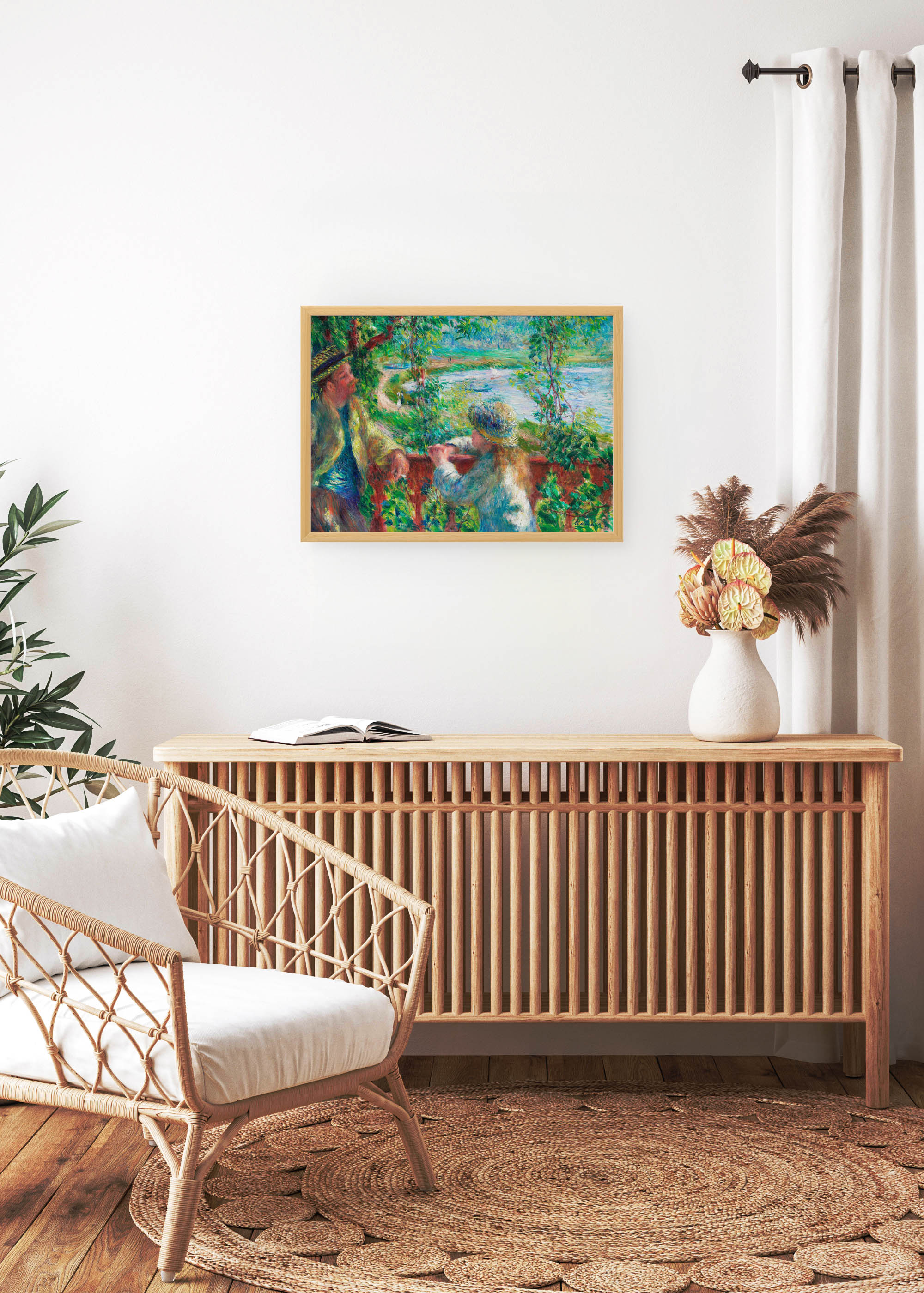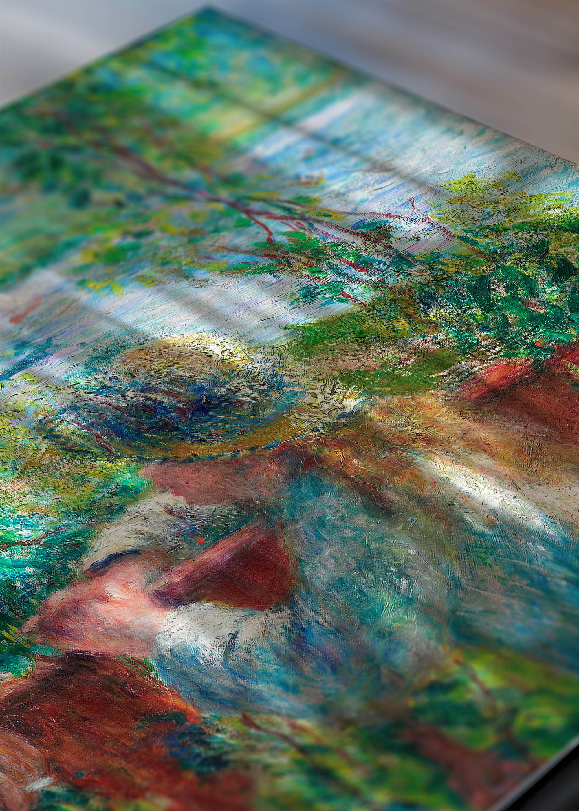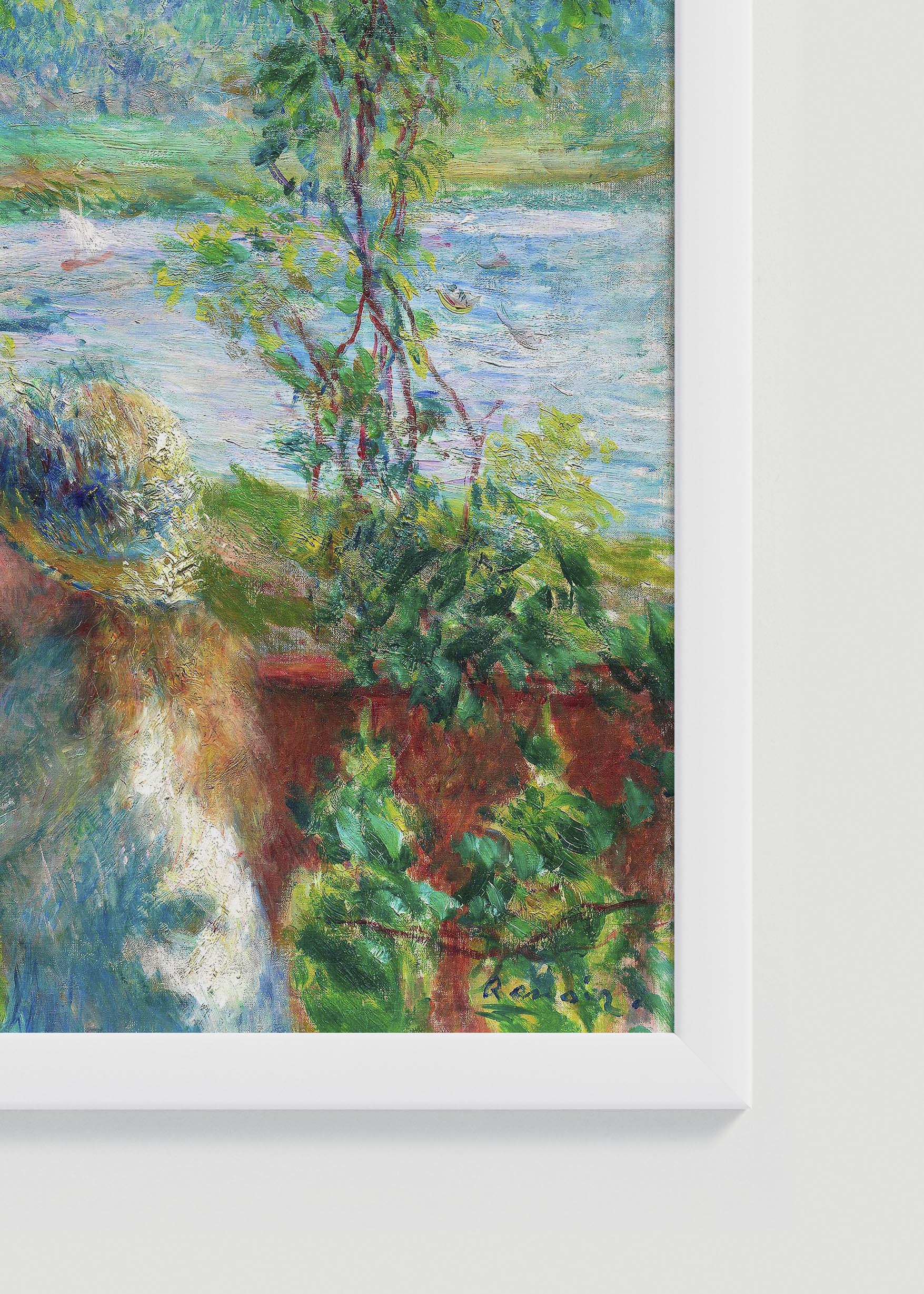 Ten fascynujący plakat przedstawia obraz Nad jeziorem (fr. Près du Lac) Pierre’a-Auguste’a Renoira, mistrza francuskiego impresjonizmu, który swoją twórczością na zawsze odmienił oblicze światowego malarstwa. Obraz ten został namalowany przez mistrza ok. 1880 r. Renoir, żyjący w latach 1841-1919, słynął z oddawania radosnych momentów codziennego życia, a jego pędzle zdawały się tańczyć wraz z uchwyconym światłem.