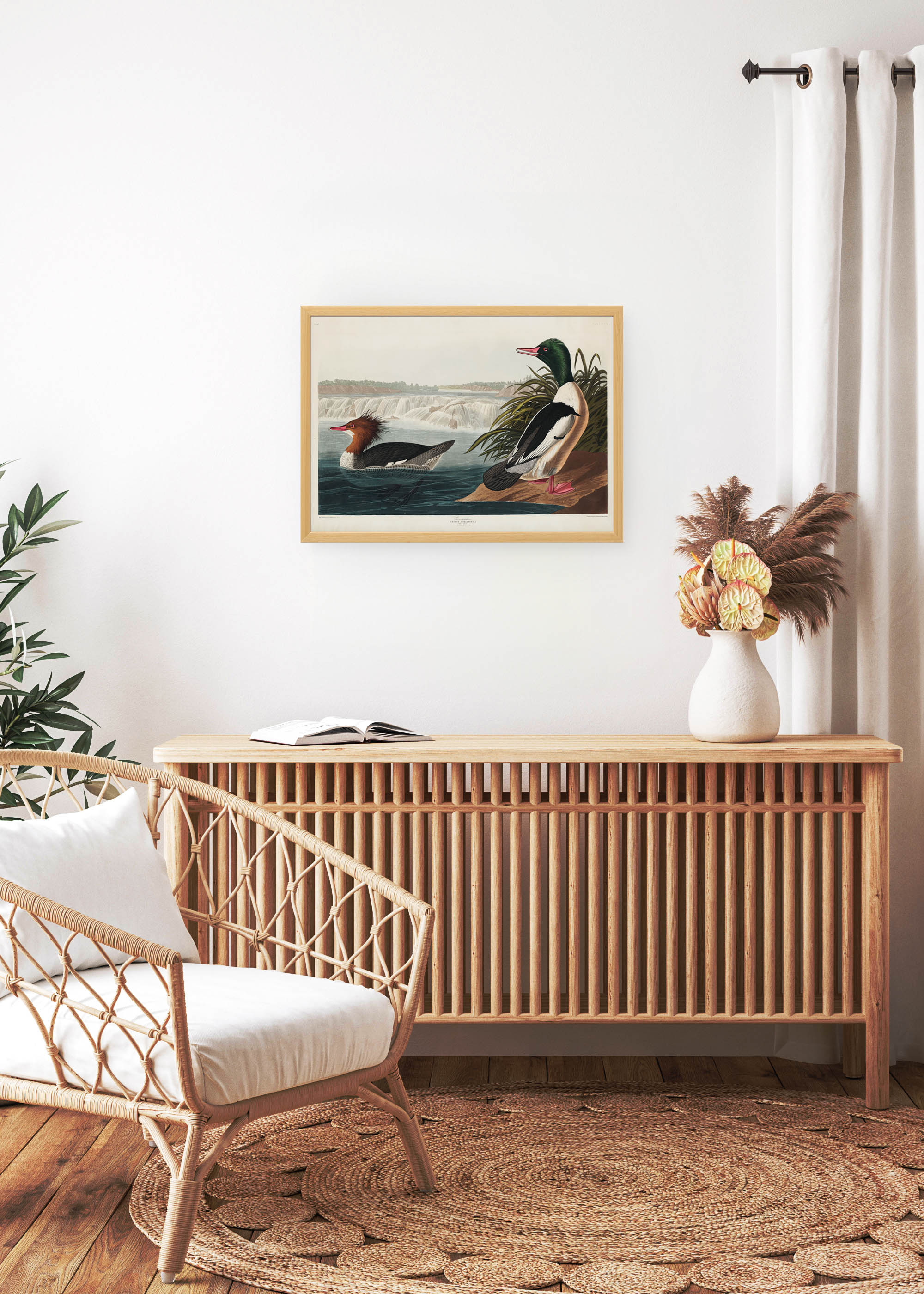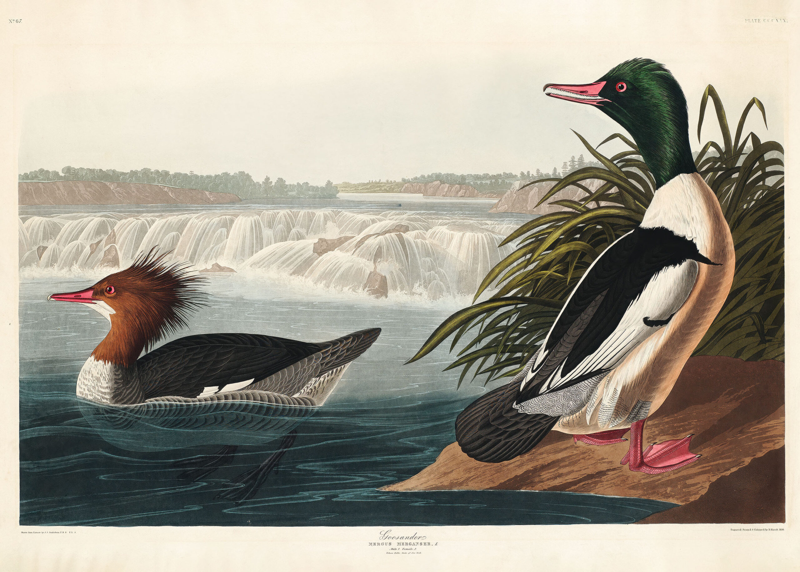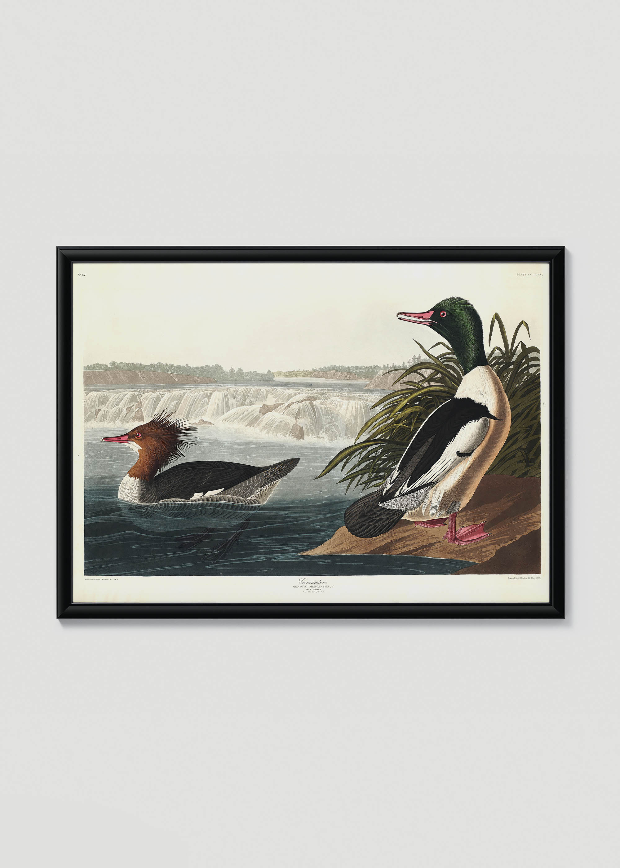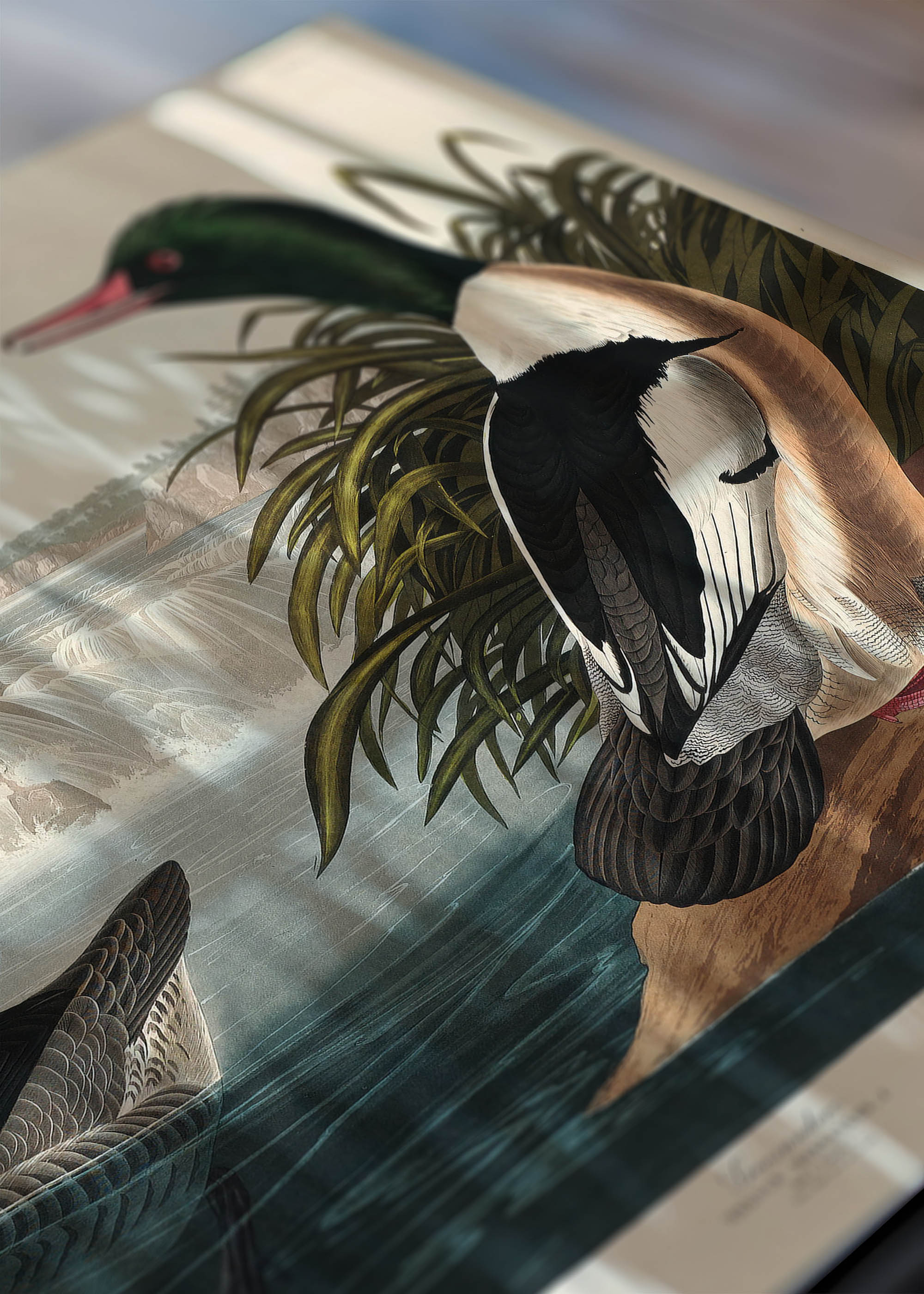 Przed nami jedno z arcydzieł z monumentalnego dzieła „Birds of America” autorstwa Johna Jamesa Audubona – ilustracja przedstawiająca majestatyczne nurogęsi (Mergus merganser). Ten wspaniały plakat powstał w latach 1827-1838, gdy Audubon przemierzał dzikie tereny Ameryki Północnej, dokumentując ptasie życie z niespotykaną wcześniej precyzją. Artysta-przyrodnik osobiście obserwował każdy gatunek w naturalnym środowisku, co nadaje jego pracom niepowtarzalny realizm i dynamikę.