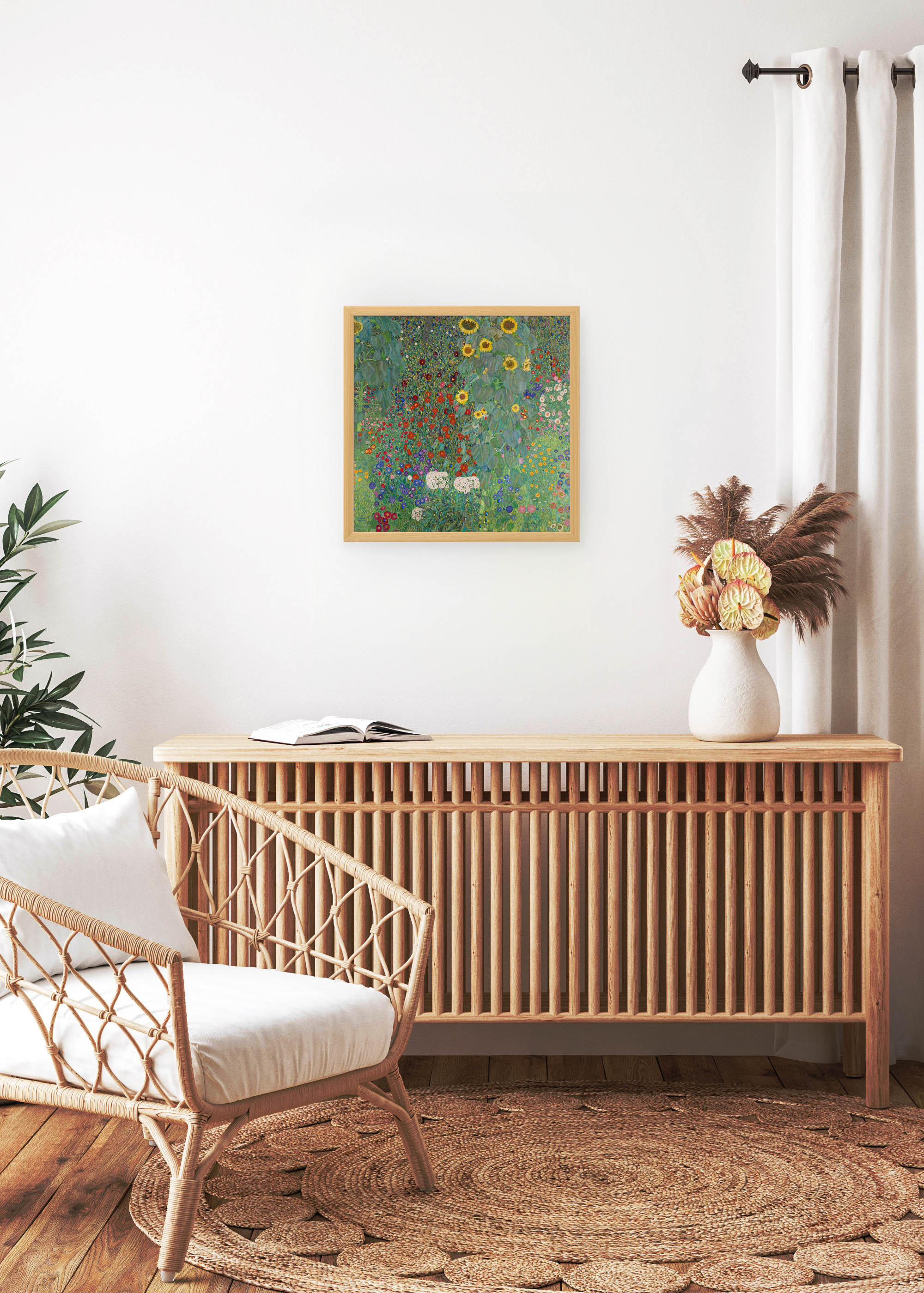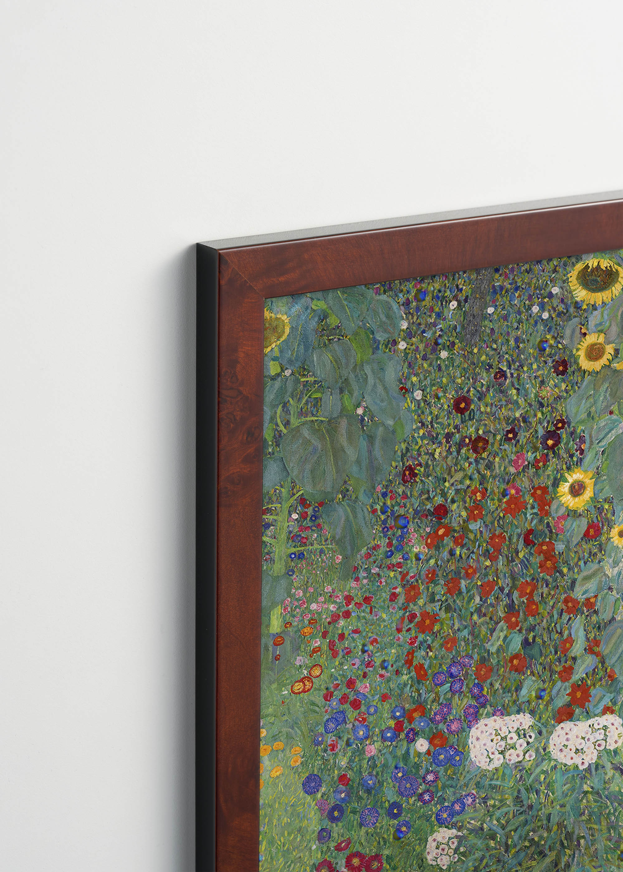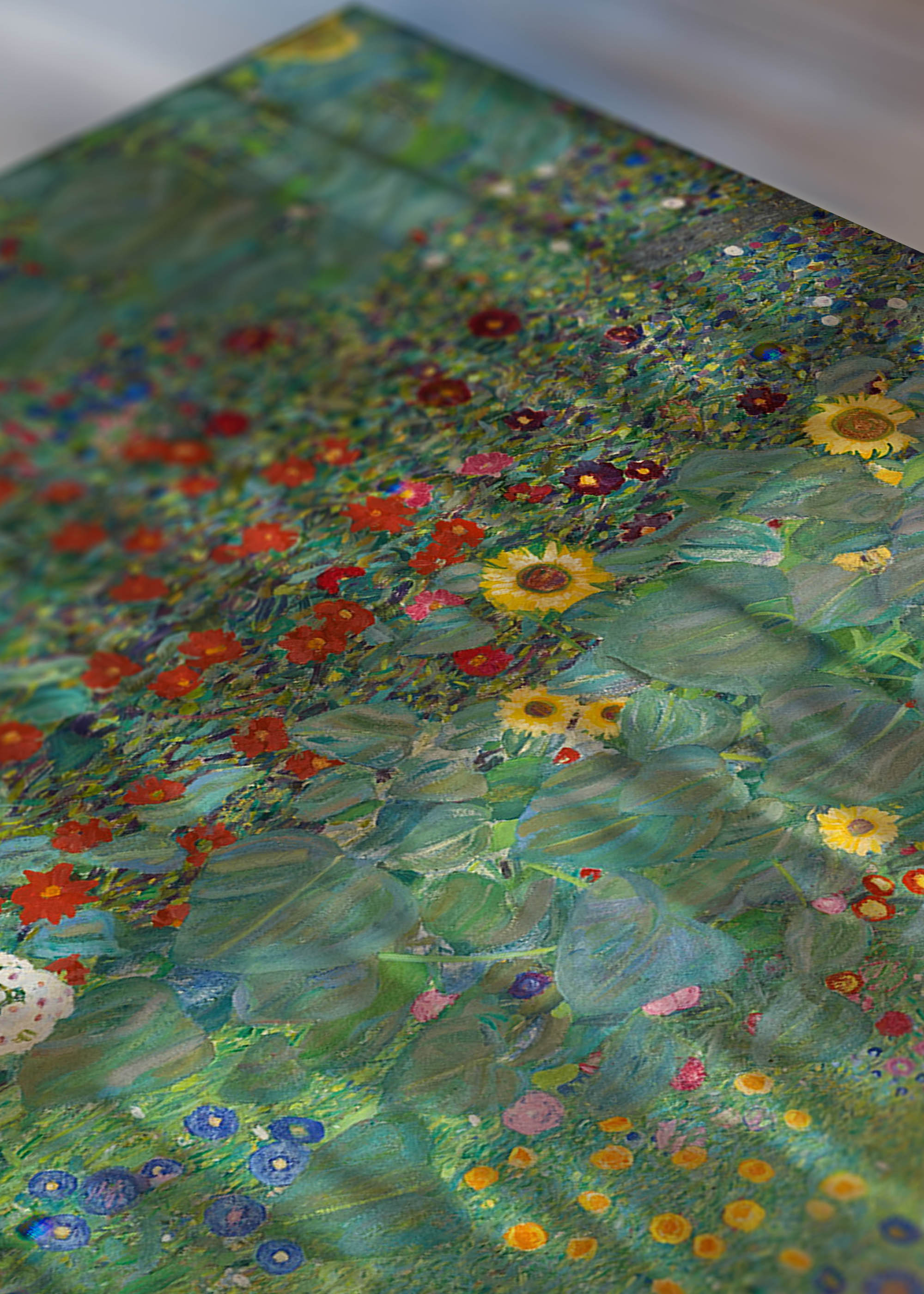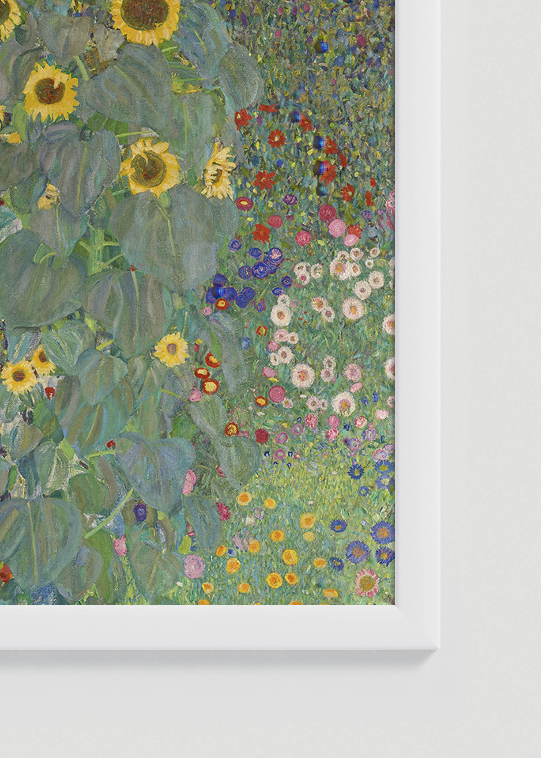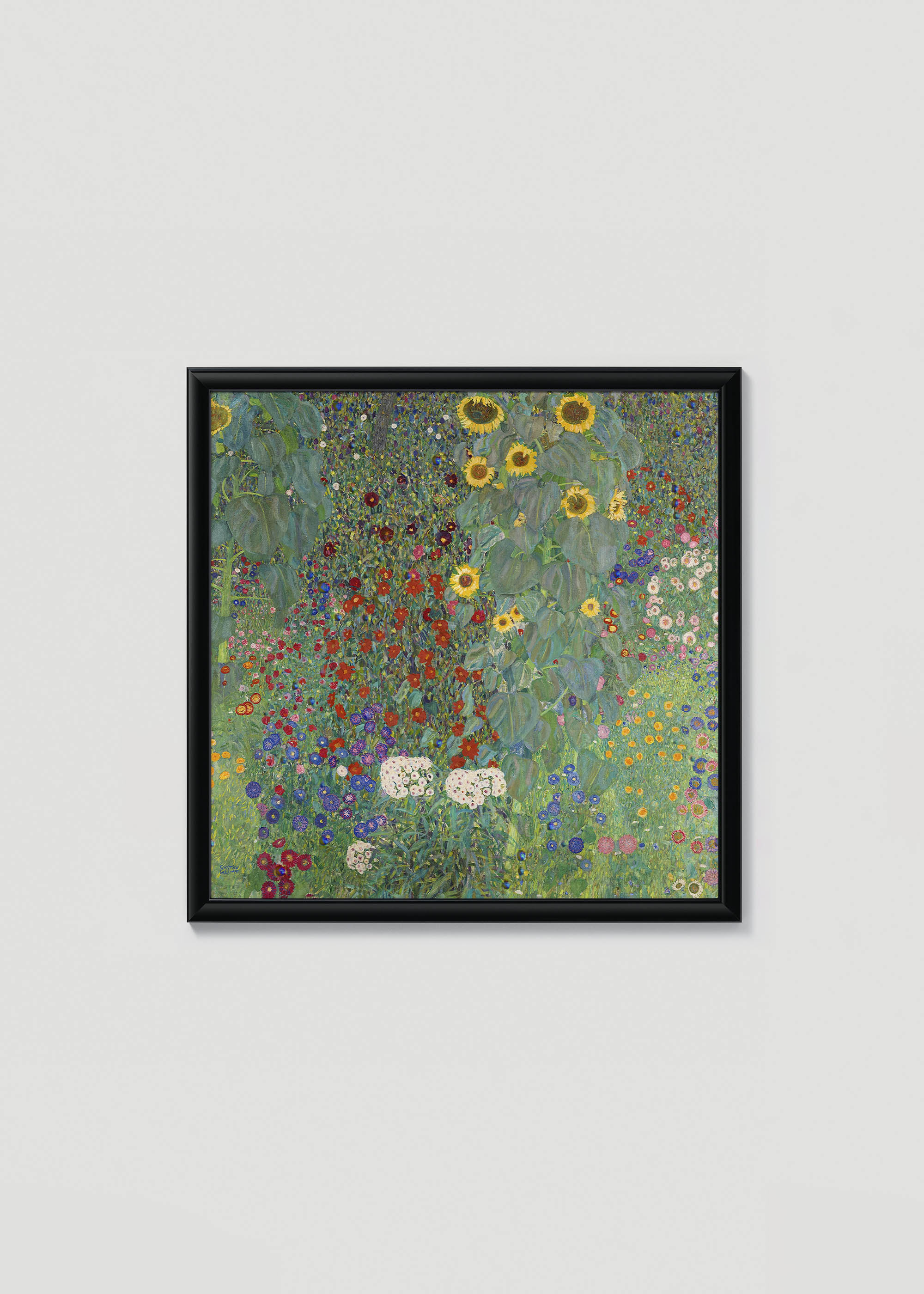 Plakat będący reprintem wzoru autorstwa wiedeńskiego mistrza zachwyca intensywną paletą barw – dominują tu szmaragdowe zielenie przeplatane z kadmową czerwienią maków, słoneczną żółcią nagietków i ametystowymi akcentami dzwonków. Słoneczniki o bursztynowych tarczach wyrastają dumnie ponad kobiercową kompozycję, tworząc wertykalny rytm. Barwy są zbliżone do naturalnych odcieni letniego ogrodu, choć Klimt nadał im charakterystyczną dla siebie intensywność i dekoracyjność.