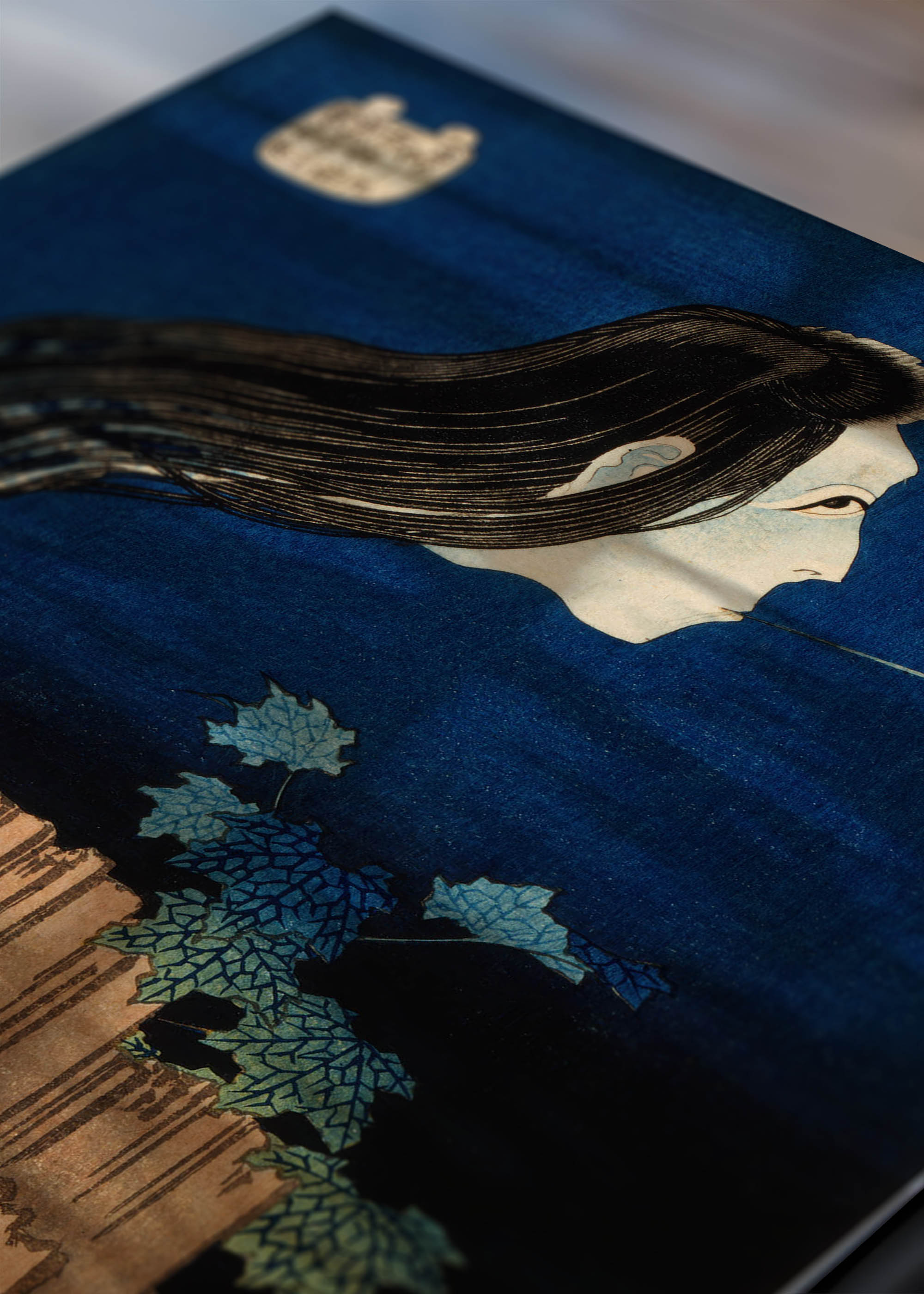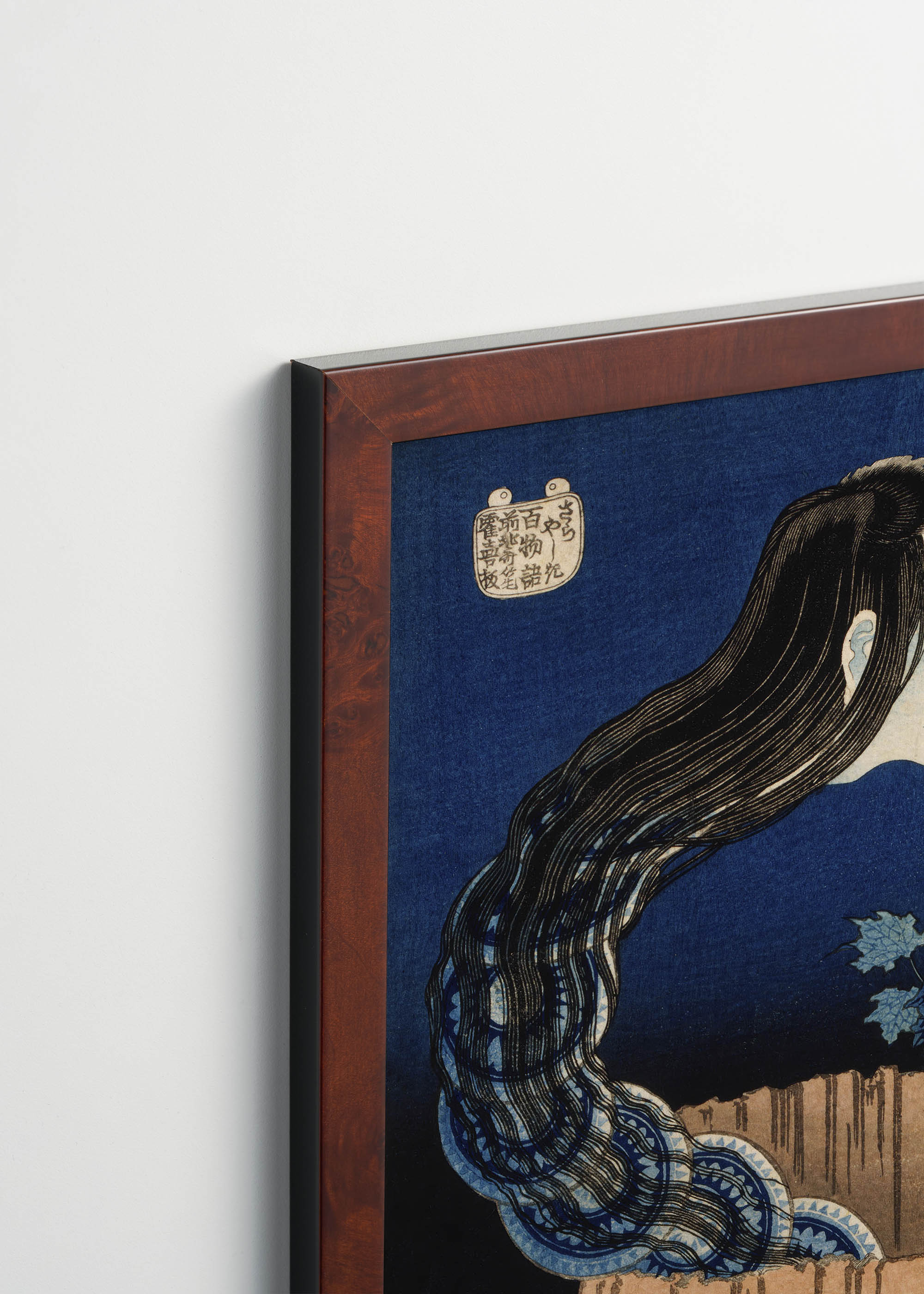 Kompozycja ukazuje widmową postać ducha Okiku o niezwykle długich, falujących włosach, która zdają się żyć własnym życiem. Dominująca kolorystyka opiera się na głębokim, atramentowym granacie tła, który kontrastuje z kremowymi tonami twarzy oraz ciepłymi, ochrowymi barwami drewnianej balii. Włosy postaci, utrzymane w odcieniach zbliżonych do hebanowej czerni z subtelnymi turkusowymi refleksami, tworzą hipnotyzujący wzór przepływu.