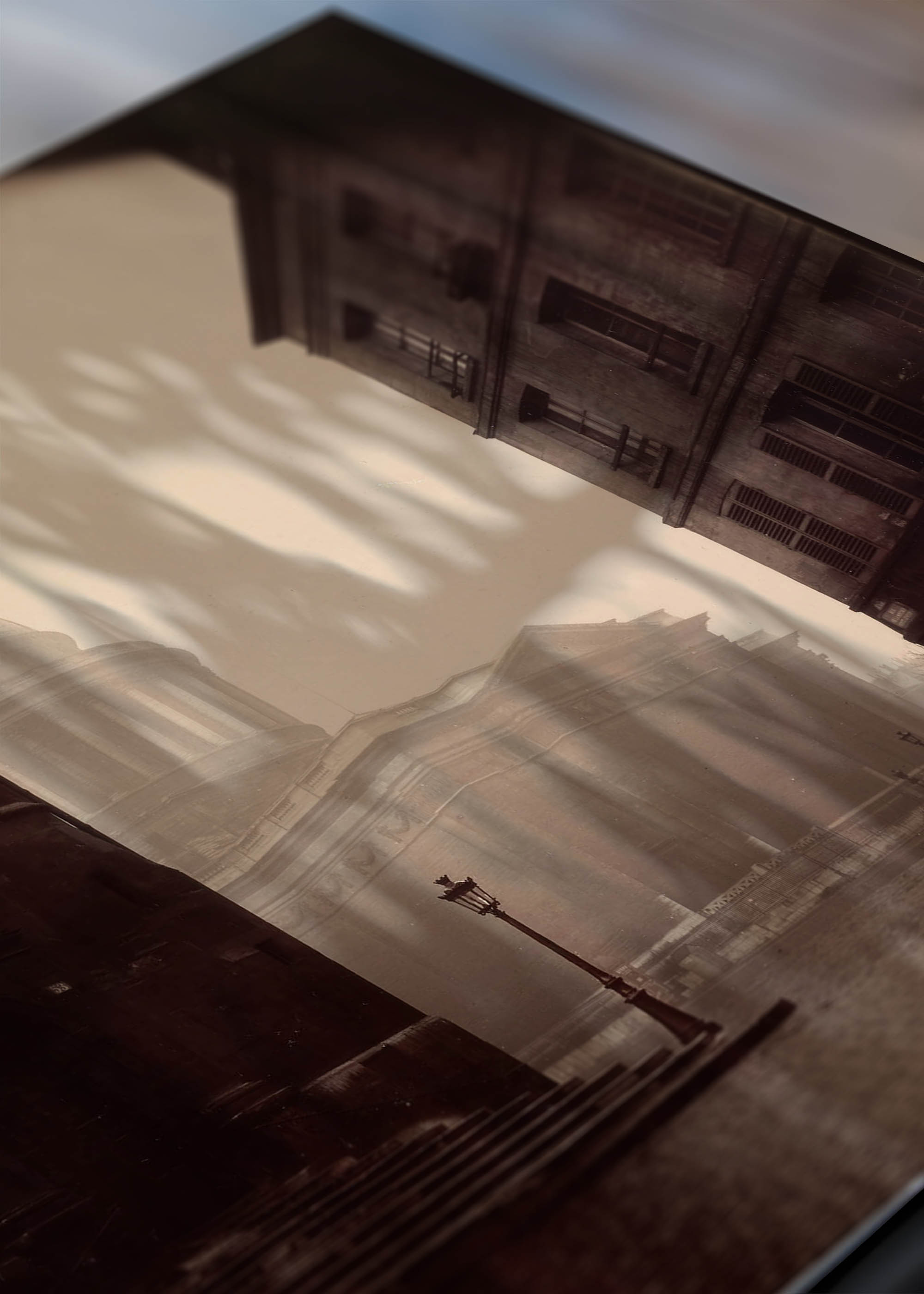 Kolorystyka tego wyjątkowego wzoru operuje monochromatyczną paletą sepii i umbry palonej, przechodzącą w delikatne tony kremowej bieli. Mgielna atmosfera tworzy gradacyjny efekt, gdzie pierwszy plan w nasyconych brązach kontrastuje z niemal widmową sylwetką świątyni w oddali. Brukowane uliczki, kamienne schody i spowita mgłą architektura budują nastrój melancholijnej nostalgii.