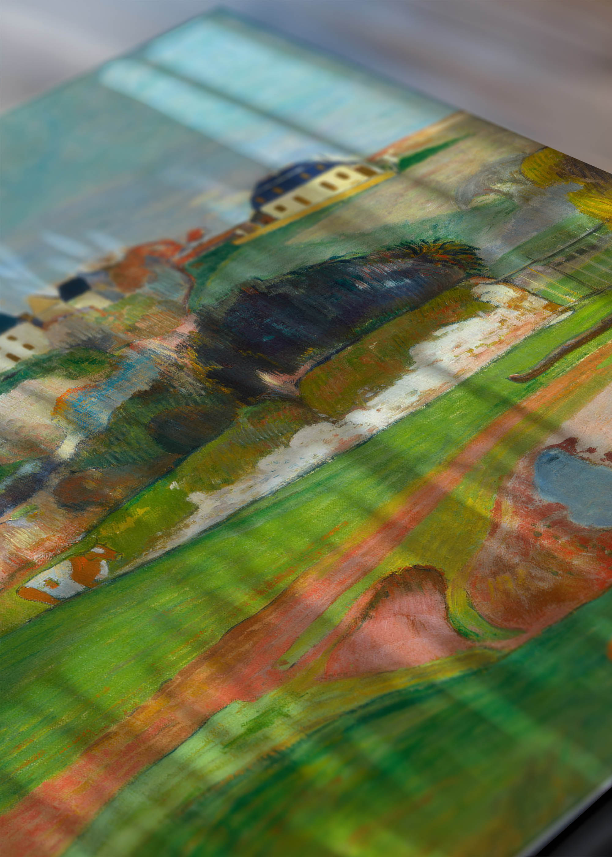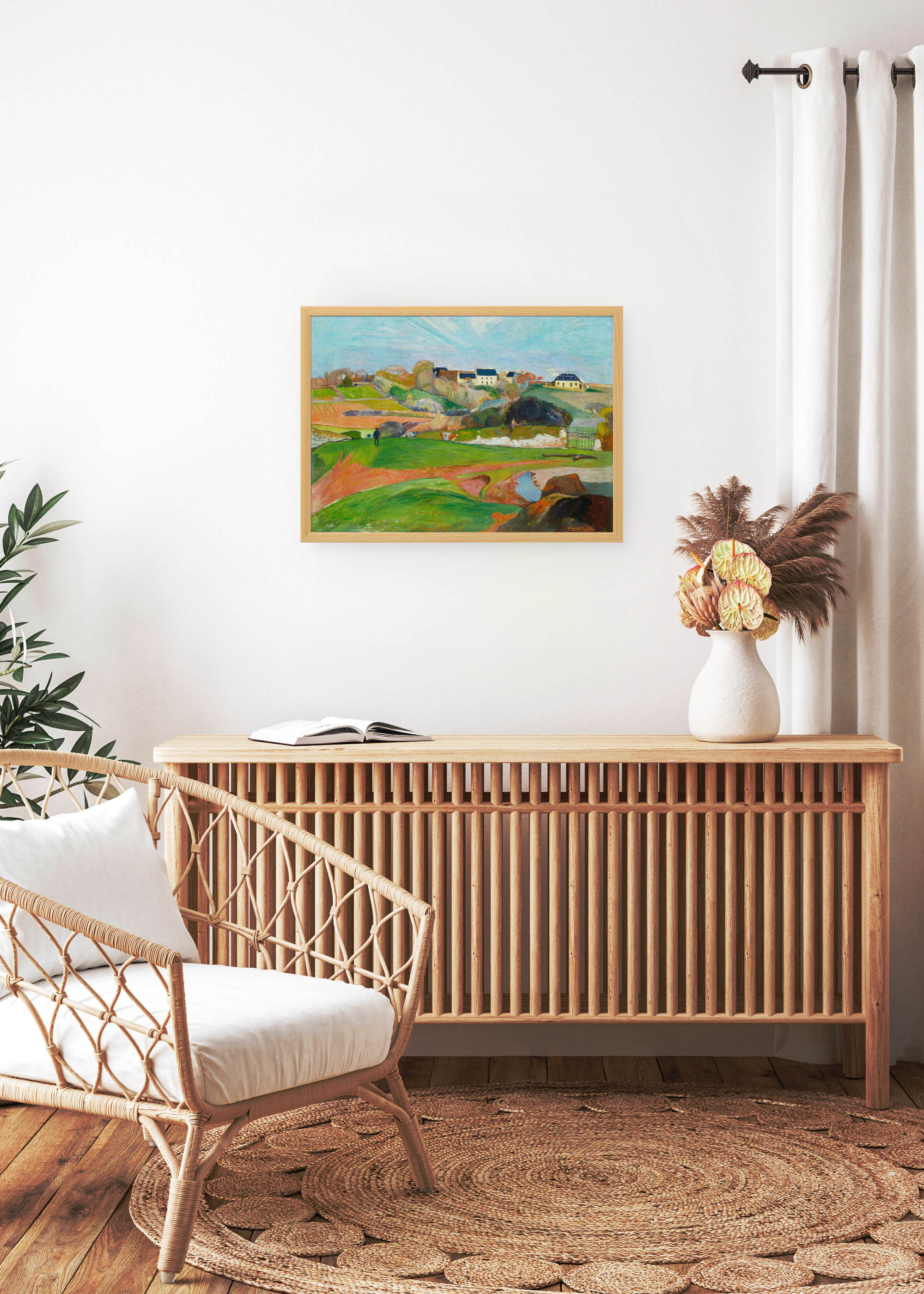 Ten wyjątkowy plakat przedstawiający dzieło Paula Gauguina „Paysage près de Pont-Aven” z 1888 roku to prawdziwa perła postimpresjonizmu. Powstał podczas jednego z najważniejszych okresów w karierze francuskiego mistrza, gdy artysta poszukiwał nowych form ekspresji w malowniczej Bretanii. Gauguin, zafascynowany autentycznością wiejskiego życia, stworzył kompozycję pełną harmonii i spokoju, która dziś zachwyca swoją ponadczasową urodą.