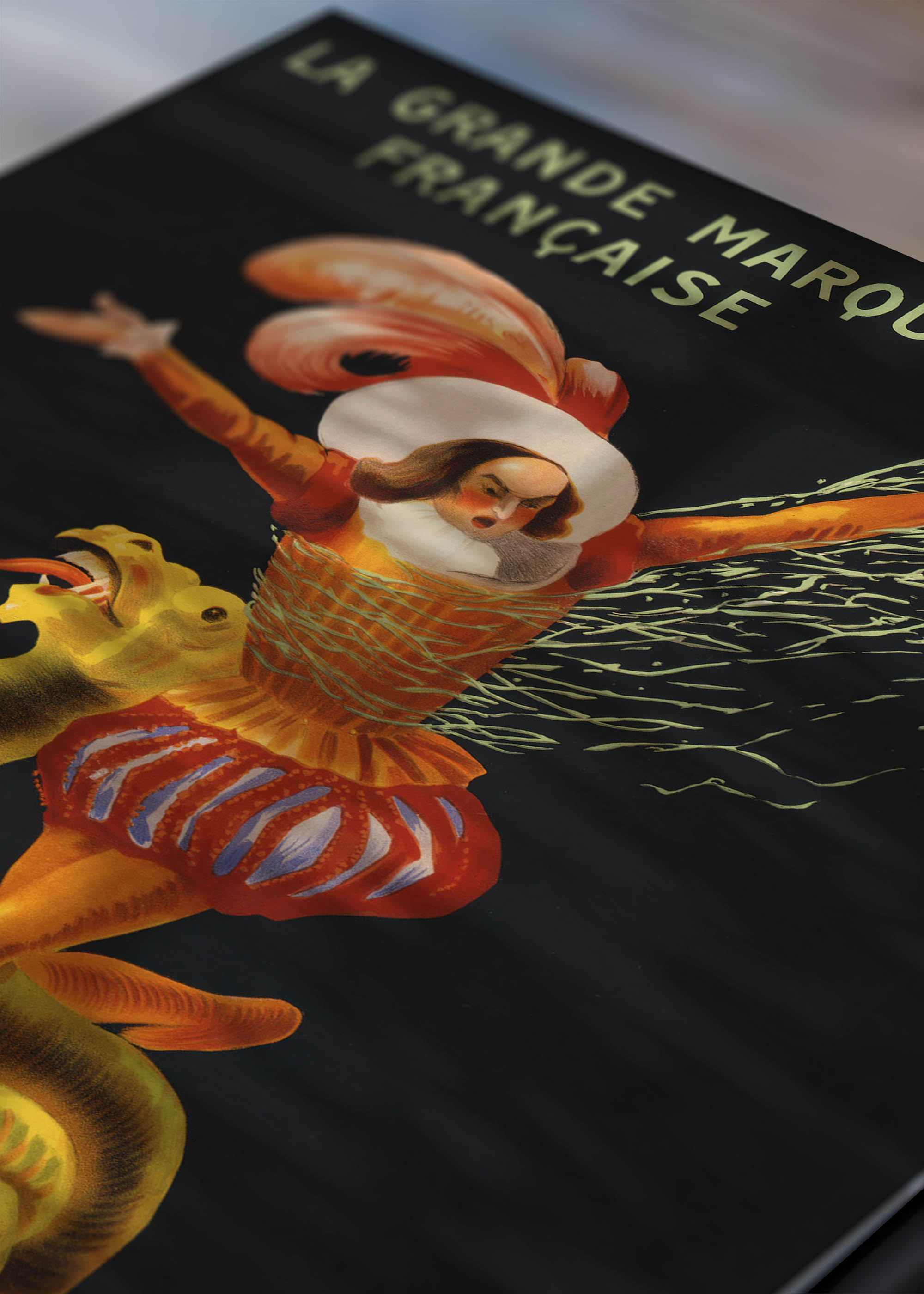 Oto arcydzieło francuskiego mistrza plakatu reklamowego – „Perrouin Frères” autorstwa Leonetto Cappiello, stworzone około 1921 roku. Ten włoski artysta, który większość życia spędził w Paryżu, zasłynął jako „ojciec nowoczesnego plakatu reklamowego”. Jego charakterystyczny styl, łączący dynamikę ruchu z wyrazistymi kolorami, zrewolucjonizował świat reklamy na początku XX wieku. Cappiello potrafił jak nikt inny uchwycić esencję marki w jednym, zapadającym w pamięć obrazie.