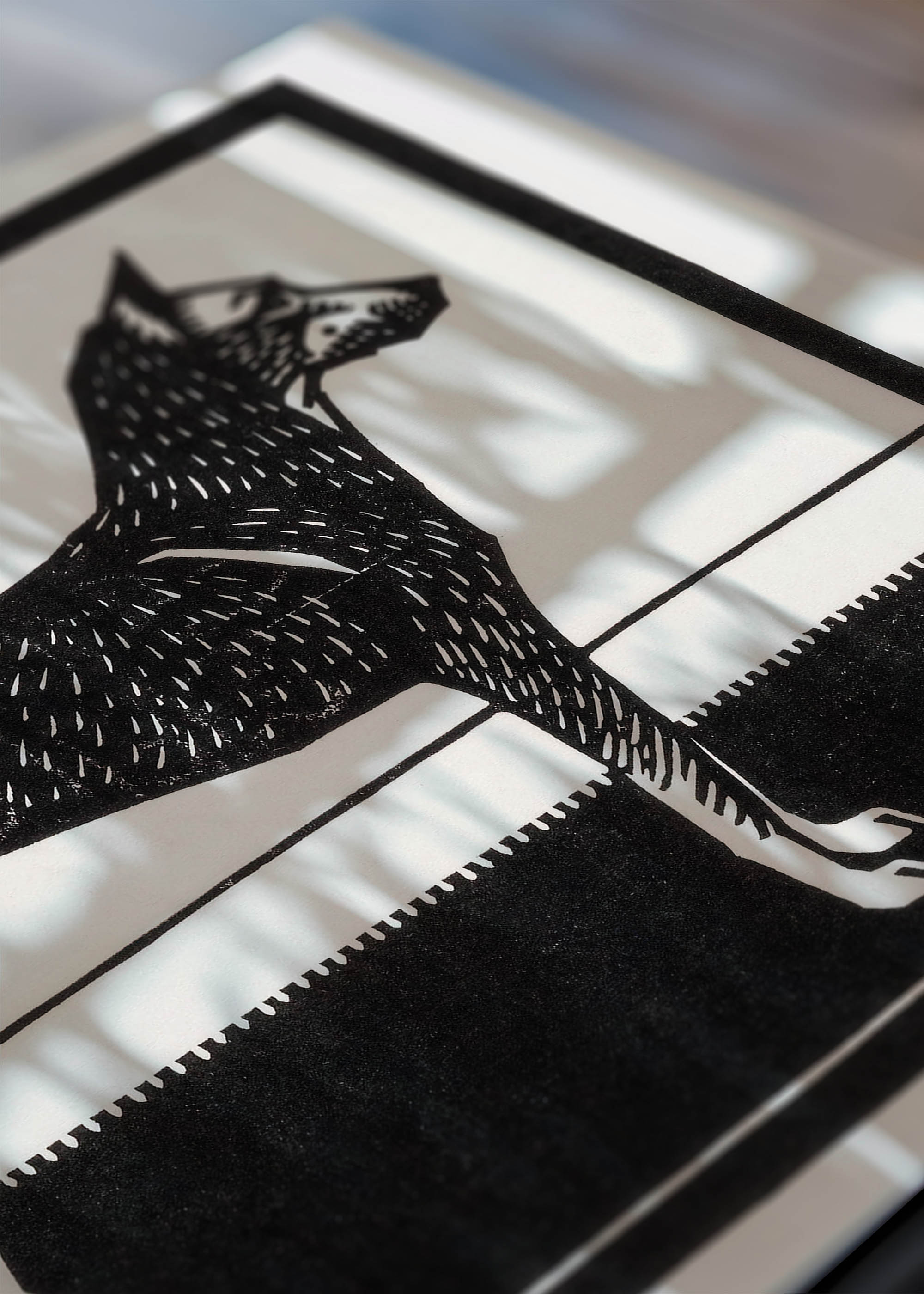 Kompozycja przedstawia sylwetkę psa w profilu, wykonaną w technice drzeworytu, która nadaje całości surowy, ekspresyjny charakter. Dominująca kolorystyka opiera się na kontrastowym zestawieniu barw – głęboka czerń górnej części przechodzi w biel dolnej partii, tworząc dramatyczny podział przestrzeni. Charakterystyczne linie rysowane białą kredą na czarnym tle nadają sierści zwierzęcia fakturę i głębię, podczas gdy dolne łapy pozostają w jasnej tonacji.