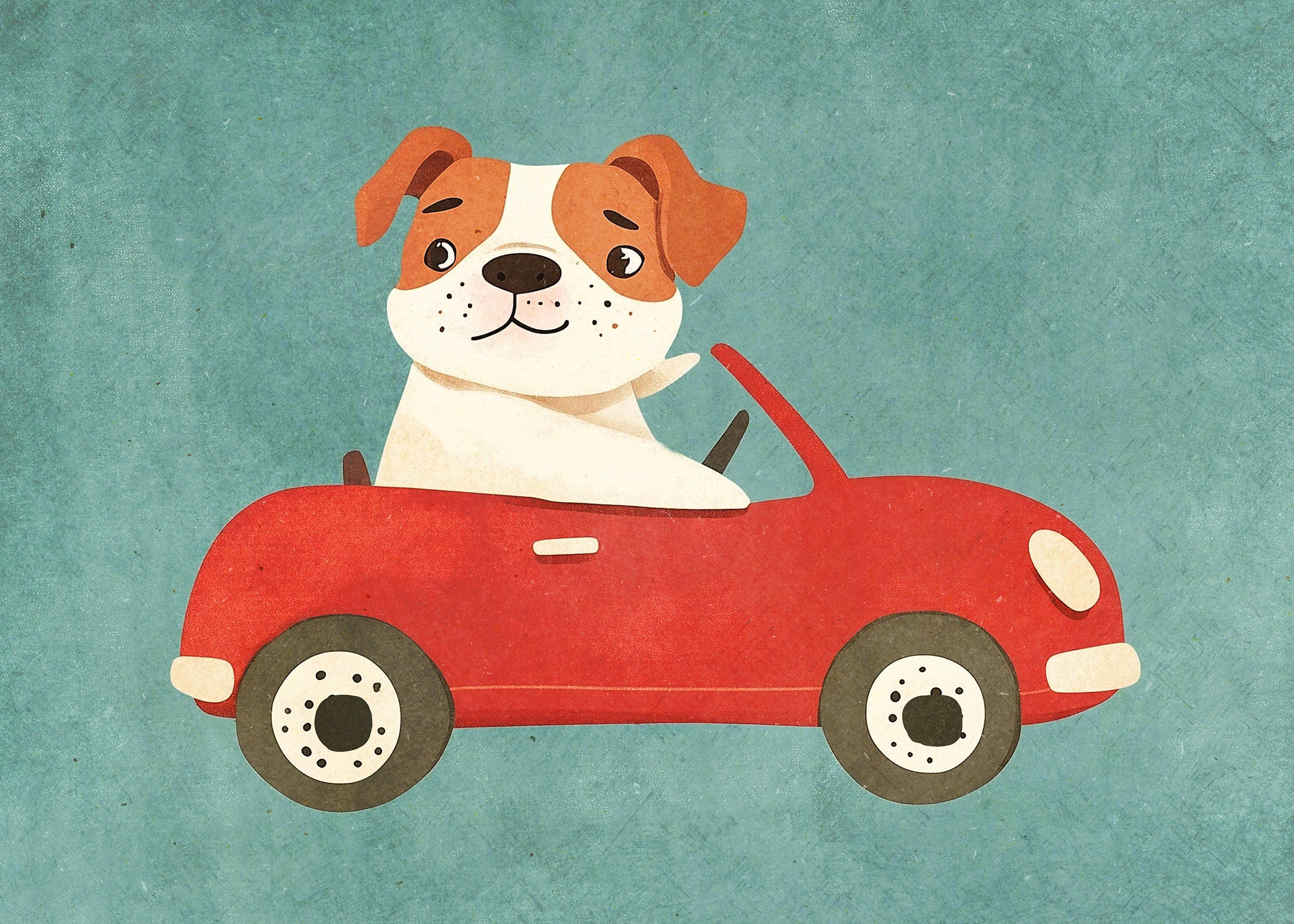 Plakat piesek w czerwonym samochodzie dla dzieci