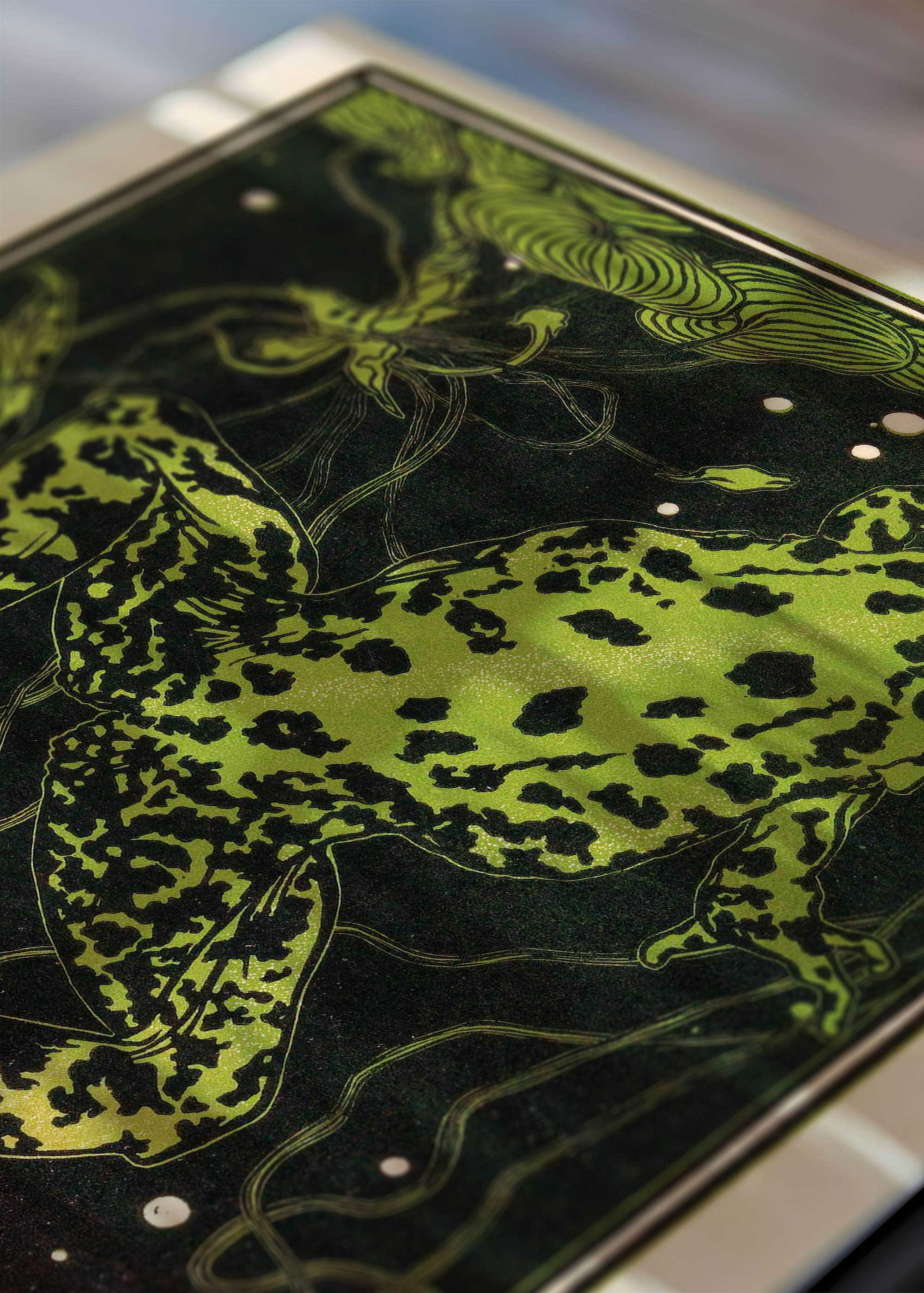 Kompozycja emanuje mistyczną aurą – potężna żaba o cętkowanym ciele płynie pod wodą, otoczona delikatnie zarysowanymi roślinami wodnymi i pęcherzykami powietrza. Kolorystyka wzoru opiera się na głębokich tonach butelkowej zieleni przechodzących w żywą limonkę, kontrastujących z ciepłymi akcentami miedzi i pomarańczy w dolnej partii kompozycji. Te barwy ziemi pięknie harmonizują z czernią tła, tworząc dramatyczny, niemal nocny nastrój.