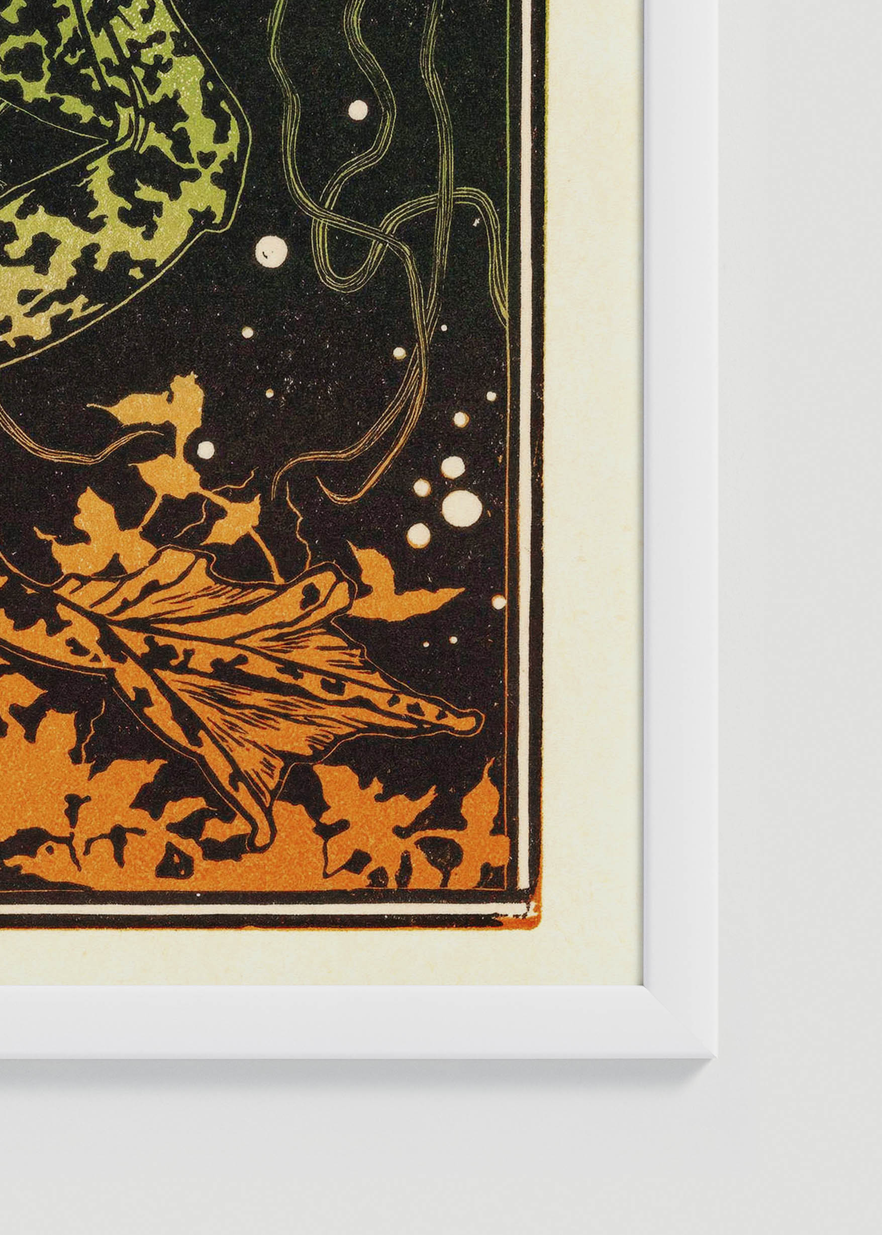 Ten fascynujący plakat przedstawia Płynącą żabę Julie de Graag – holenderskiej artystki żyjącej na przełomie XIX i XX wieku, która zasłynęła jako mistrzyni drzeworytu i linorytu. De Graag, zmarła tragicznie młodo w 1924 roku, pozostawiła po sobie niezwykły dorobek inspirowany obserwacją przyrody i japonizmem, który wówczas podbijał europejskie salony artystyczne.