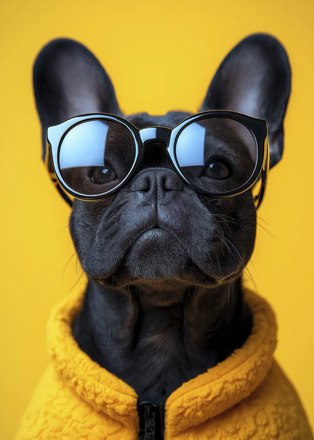 Plakat Portret psa Buldog francuski w sweterku i okularach
