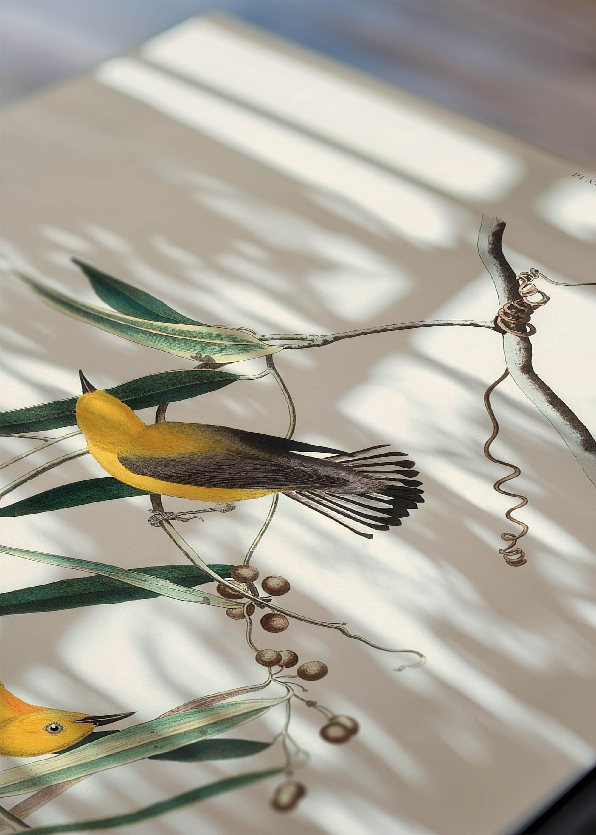 Na plakacie widzimy dwa złocistoszare lasówki cytrynowe, uchwycone z maestrią godną mistrza. Górny ptak prezentuje się w pełnej krasie z rozpostartymi skrzydłami, podczas gdy dolny towarzysz spoczywa wśród gałązek. Kolorystyka oscyluje wokół ciepłych, słonecznych tonów – intensywna żółć kadmowa kontrastuje z grafitowymi i antracytowymi piórami skrzydeł. Delikatne zielenie szałwiowe liści oraz karmelowe akcenty owoców tworzą harmonijną kompozycję, typową dla palety późnego lata.