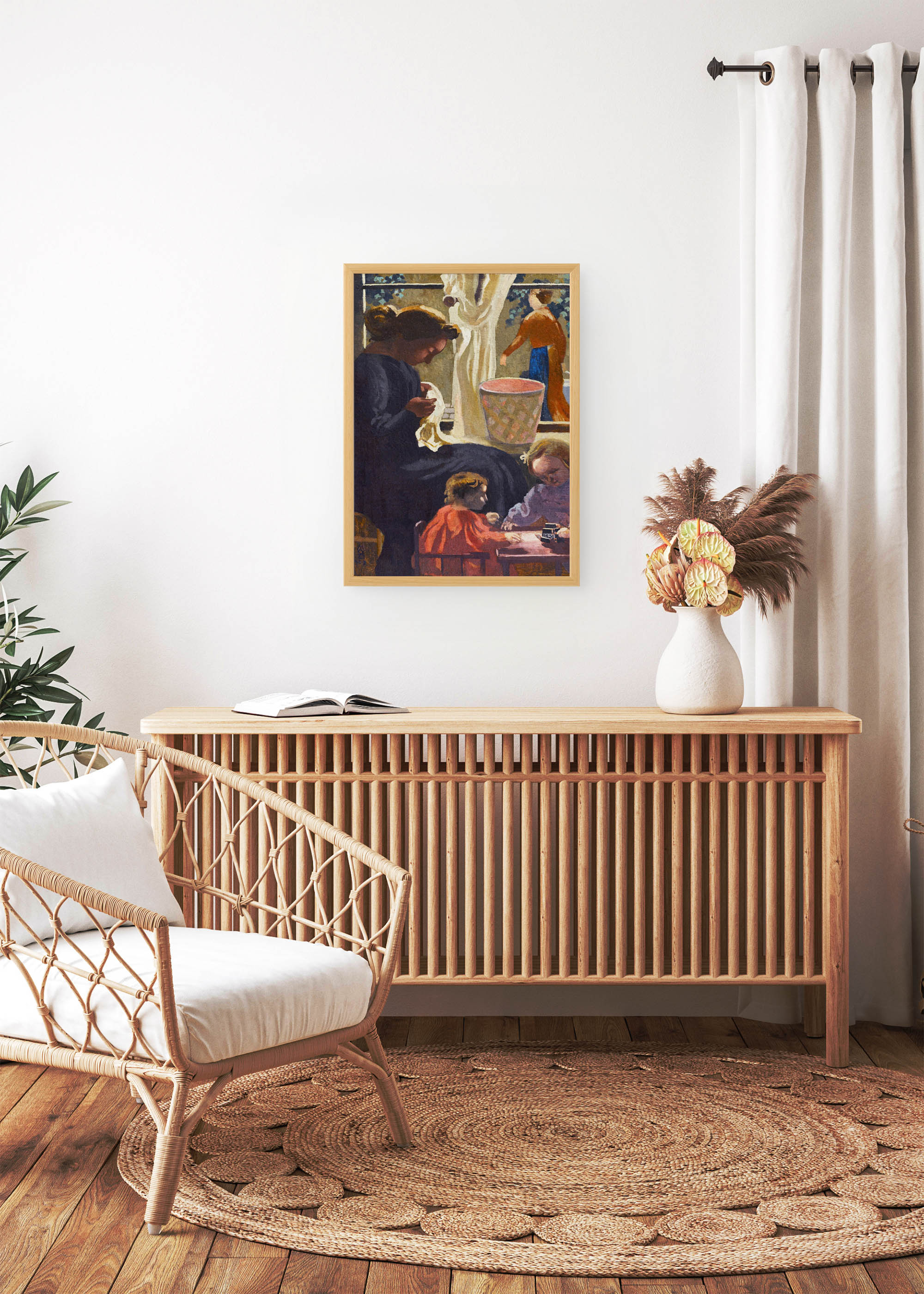 Ten plakat doskonale wpisze się w wnętrza urządzone w stylu klasycznym, prowansalskim czy shabby chic. Jego nostalgiczna atmosfera i stonowana paleta barw harmonizują z naturalnymi materiałami – drewnem, lnem, ceramiką w odcieniach ecru. Plakatello prezentuje dzieło, które przyniesie do każdego domu aurę spokoju i rodzinnej bliskości, idealnie komponując się z wnętrzami o ciepłej, przytulnej atmosferze.
