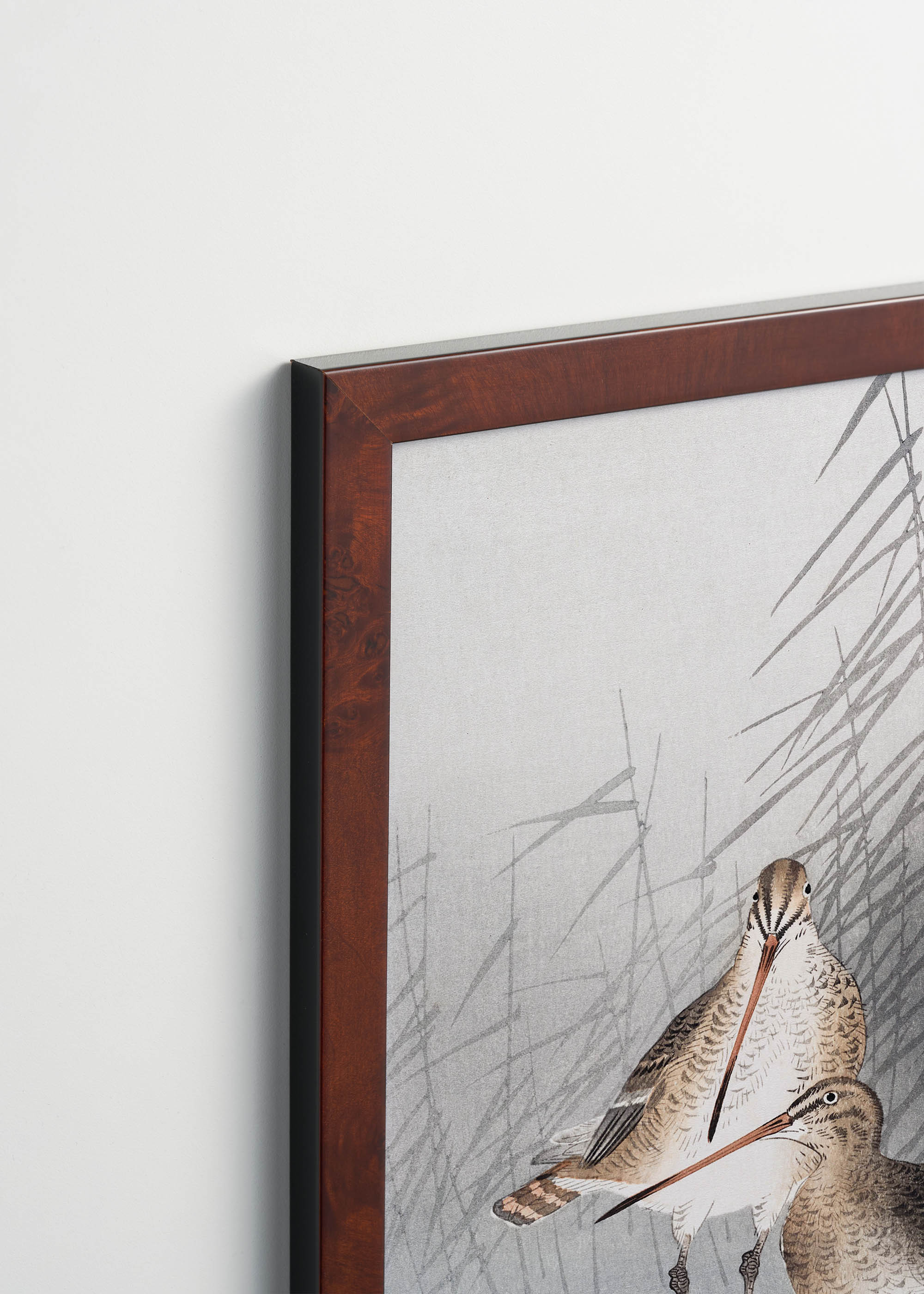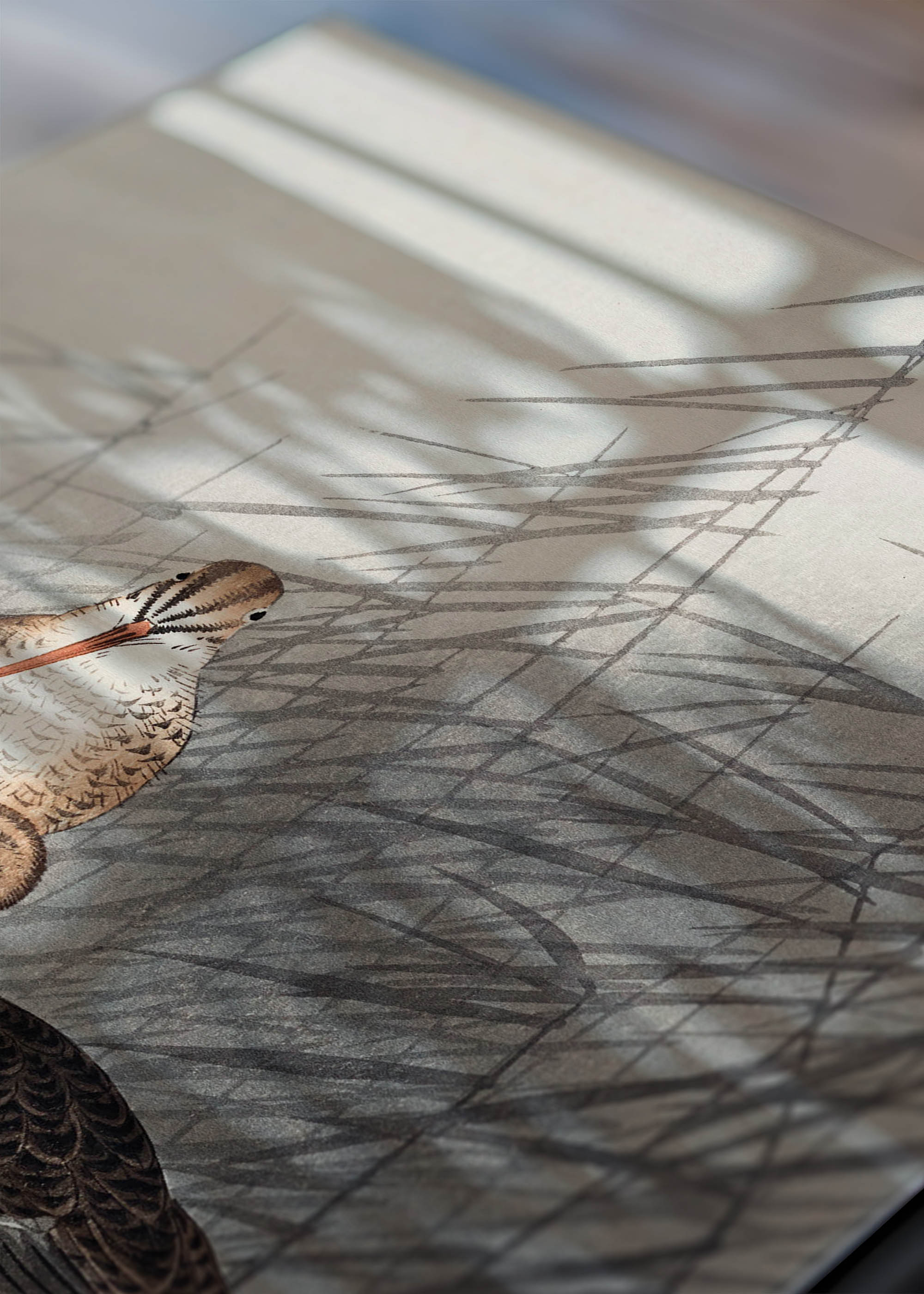 Na plakacie widzimy dwa bekasy brodacze (Gallinago gallinago) uchwycone w delikatnym, niemal intymnym momencie nad taflą wody. Kolorystyka dzieła opiera się na stonowanych, naturalnych barwach – dominują tu ciepłe brązy zbliżone do spalonych sjen i ochry, delikatne beże oraz kremowe akcenty na piersiach ptaków. Tło utrzymane jest w chłodnych, perłowoszarych tonach z subtelnymi niebieskimi refleksami wody. Charakterystyczne dla Kosona są precyzyjnie oddane detale upierzenia oraz dynamiczne pozy ptaków.