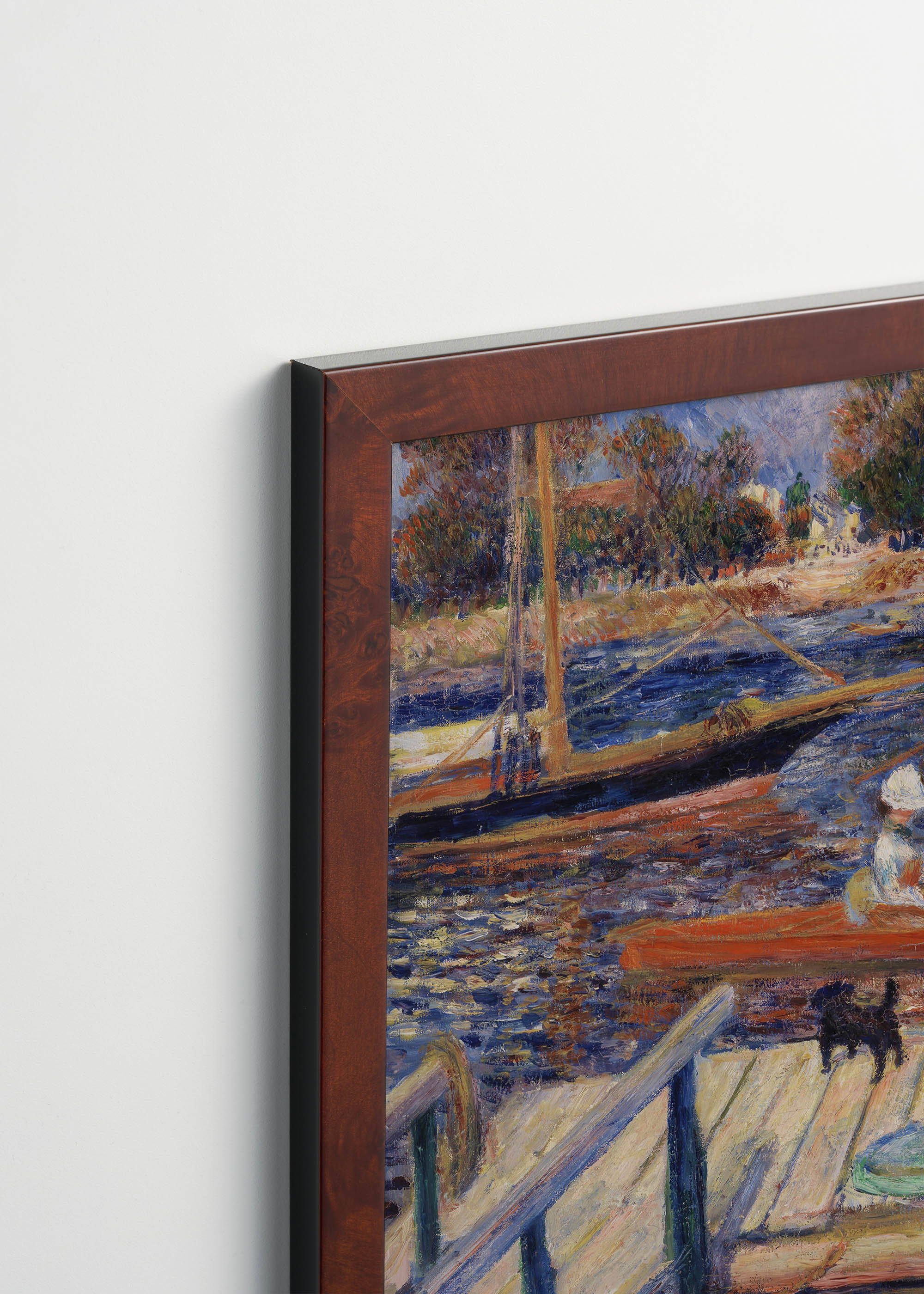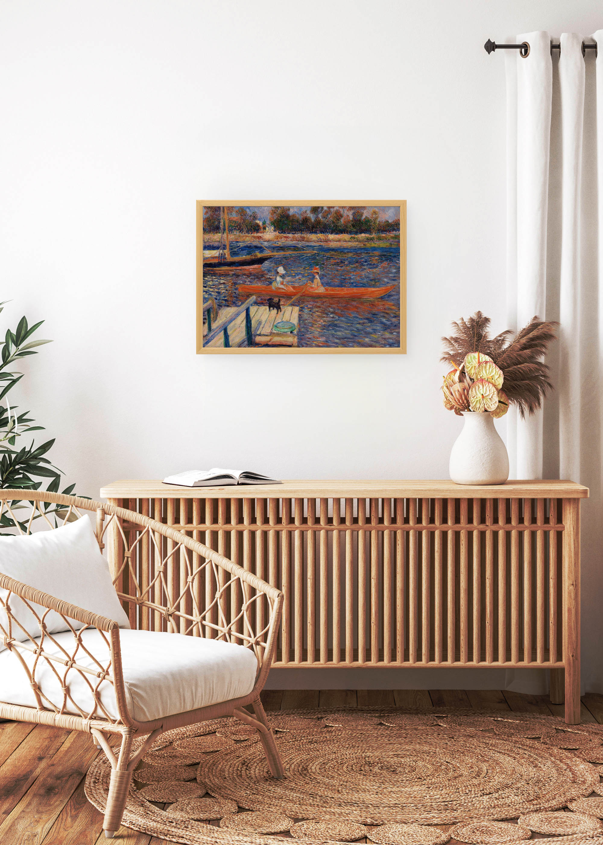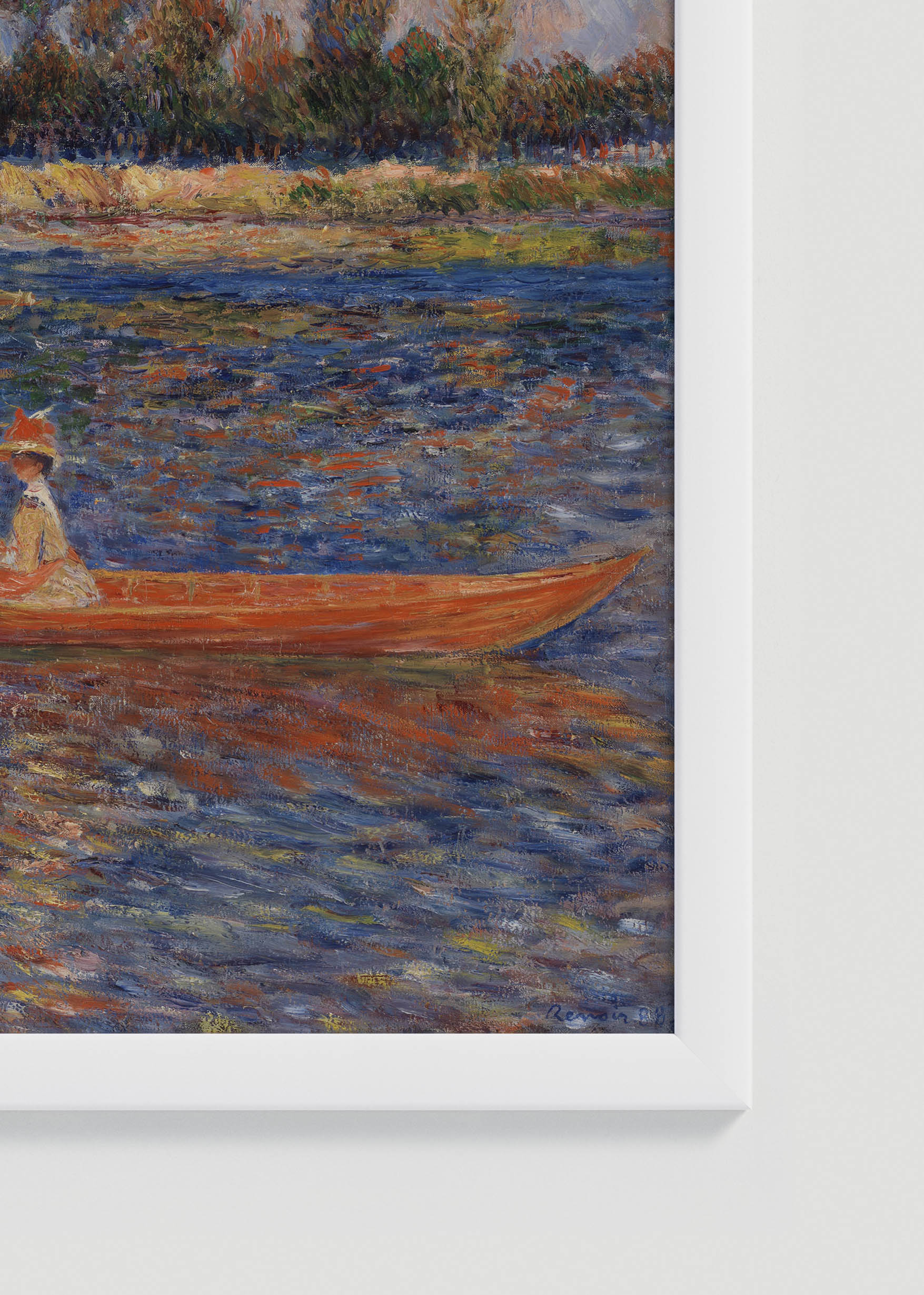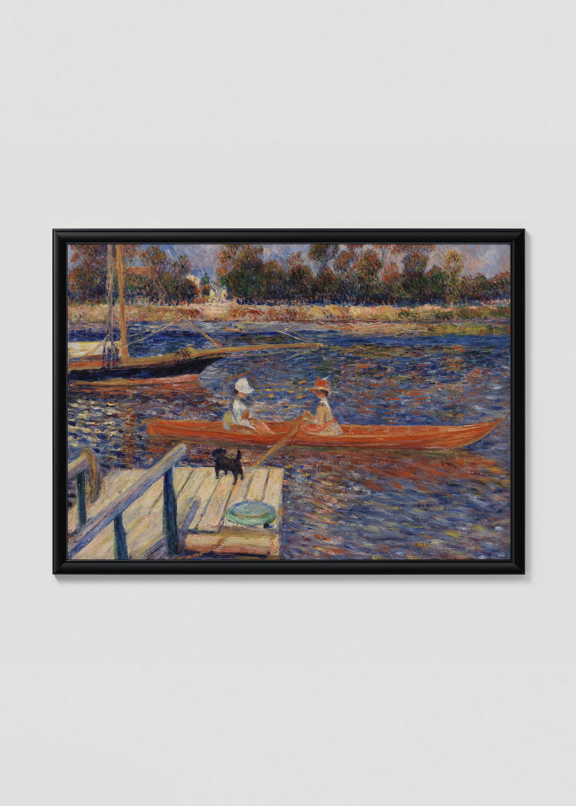 Ten wyjątkowy plakat przedstawia obraz Pierre-Auguste’a Renoira pt. Sekwana w Argentuil (fr. La Seine à Argenteuil) z 1888 r. Dzieło ukazuje sielankową scenę nad brzegiem rzeki, która emanuje ciepłem i spokojem charakterystycznym dla impresjonistycznej maestrii francuskiego mistrza. Renoir, jeden z głównych przedstawicieli impresjonizmu, tworzył swoje rzeczne kompozycje w latach 70. i 80. XIX wieku, często inspirując się życiem nad Sekwaną w okolicach Argenteuil.