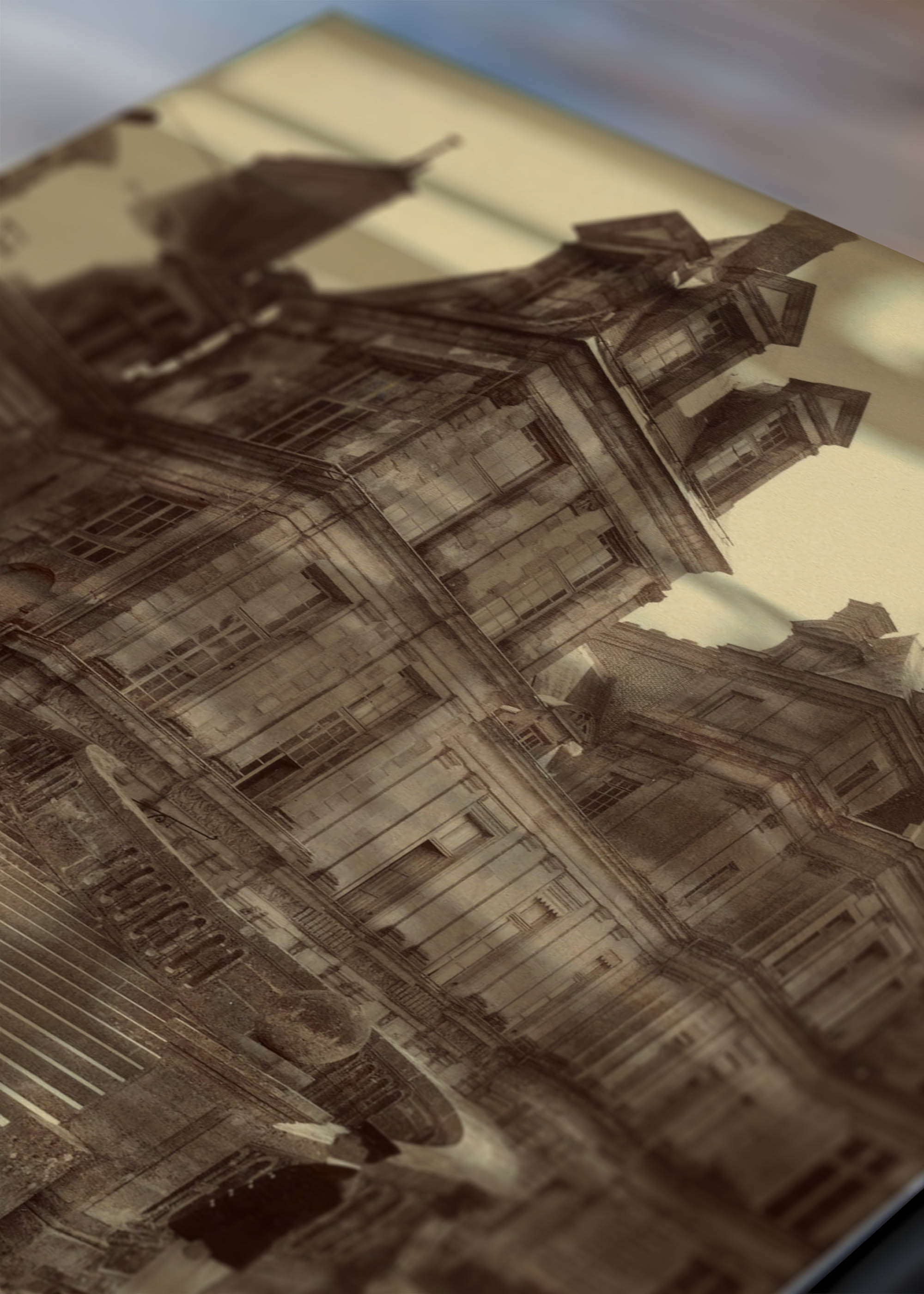 Dominująca kolorystyka utrzymana jest w ciepłych tonach sepii i umbry naturalnej, charakterystycznych dla fotografii tamtej epoki. Te ziemiste barwy tworzą nostalgiczny klimat, podkreślony delikatnymi gradacjami szarości i kremowymi akcentami. Kunsztowne schody z balustradą ozdobioną rzeźbionymi kulami oraz bogato zdobione pilastry świadczą o wyrafinowanym francuskim rzemiosłe kamieniarskim.