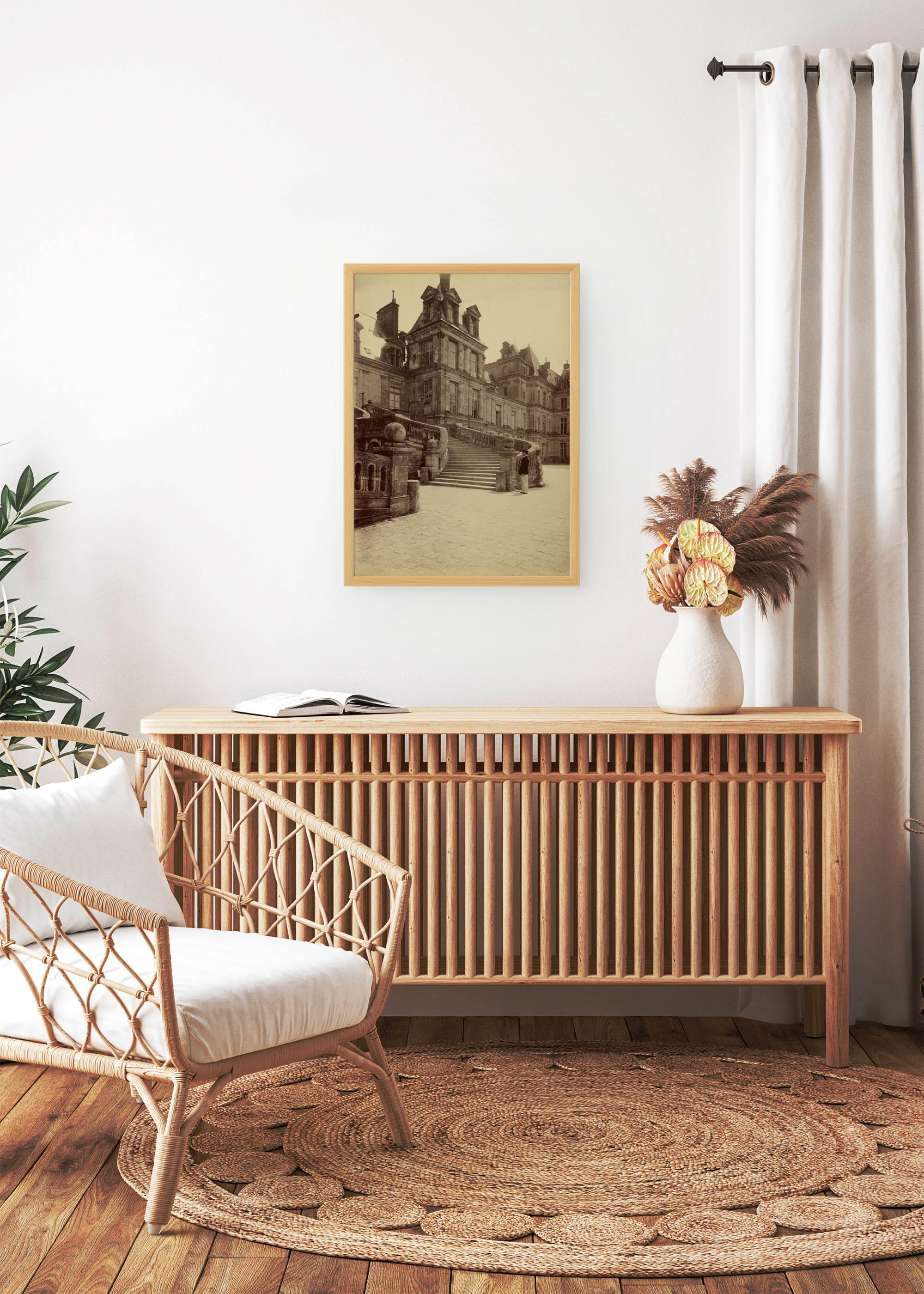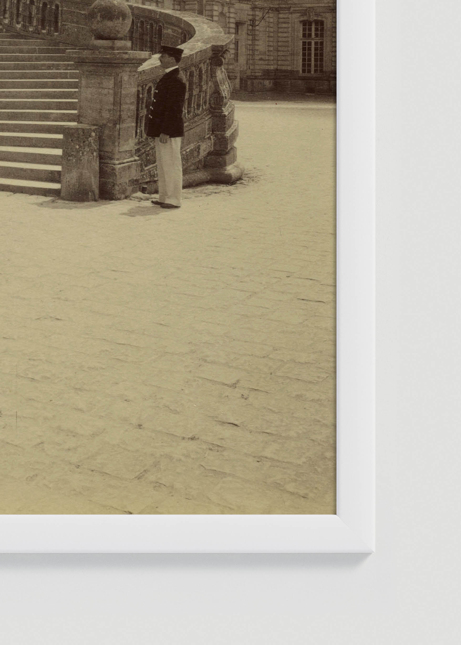 Ten fascynujący plakat będący reprintem architektonicznej fotografii autorstwa Eugène Atgeta przenosi nas w romantyczną atmosferę paryskiej Belle Époque. Atget, mistrz dokumentalistycznej fotografii przełomu XIX i XX wieku, uwiecznił tu majestatyczne schody prowadzące do klasycystycznej fasady rezydencja królewskiej w Fontainebleau pod Paryżem. Jego obiektyw schwytał niezwykłą harmonię kamiennej architektury, gdzie każdy detal zdaje się opowiadać historię dawnego Paryża.
