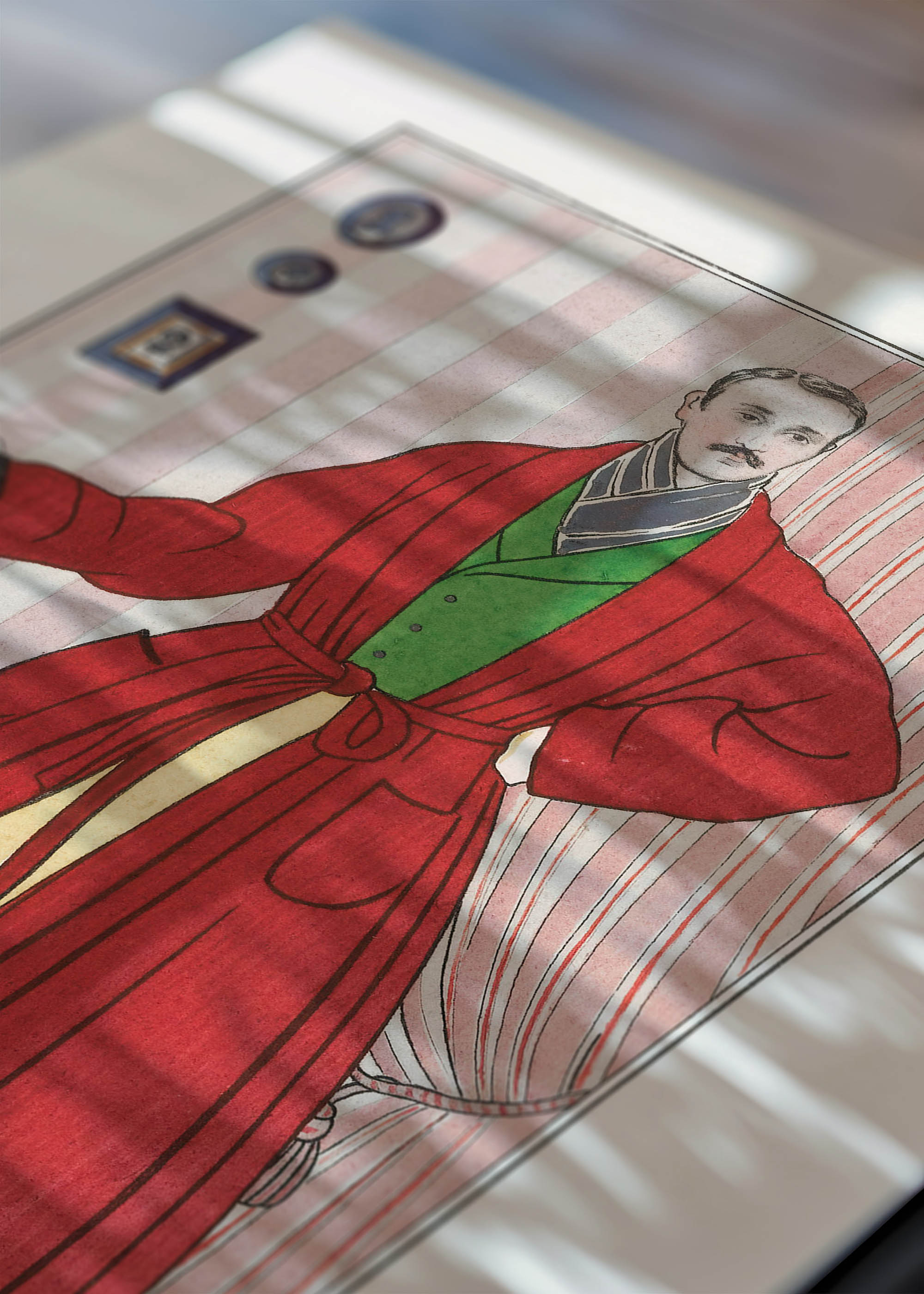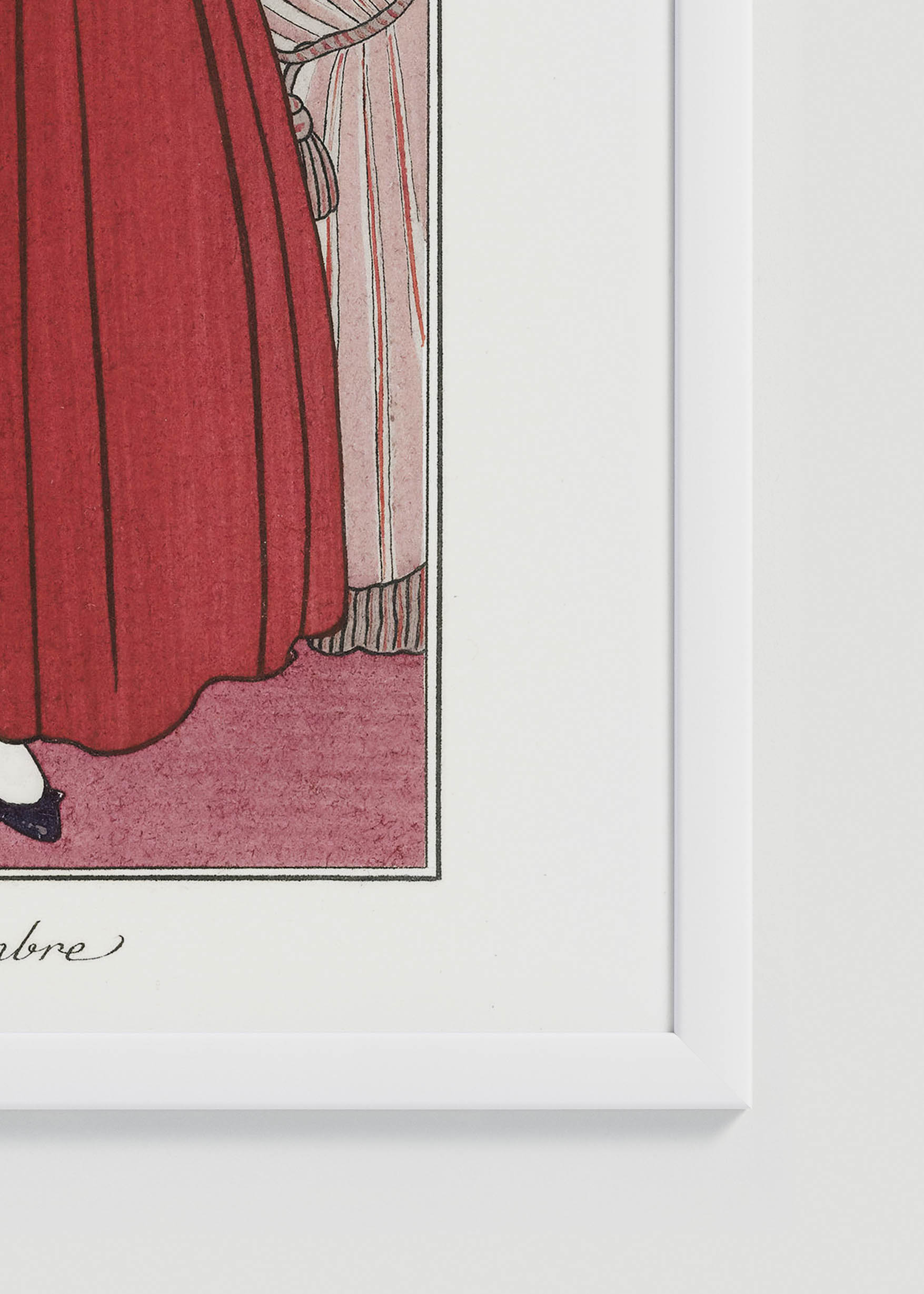 Na plakacie widzimy dystyngowanego mężczyznę w wykwintnym szlafroku, którego szkarłatna czerwień dominuje całą kompozycję. Barbier mistrzowsko zestawił intensywną czerwień z szmaragdową zielenią kamizelki, tworząc odważny, ale harmonijny kontrast. Delikatne pastelowe różowe pasy w tle nadają całości subtelnej lekkości, podczas gdy kremowe akcenty i głęboka czerń detali dopełniają wyrafinowaną paletę barw.