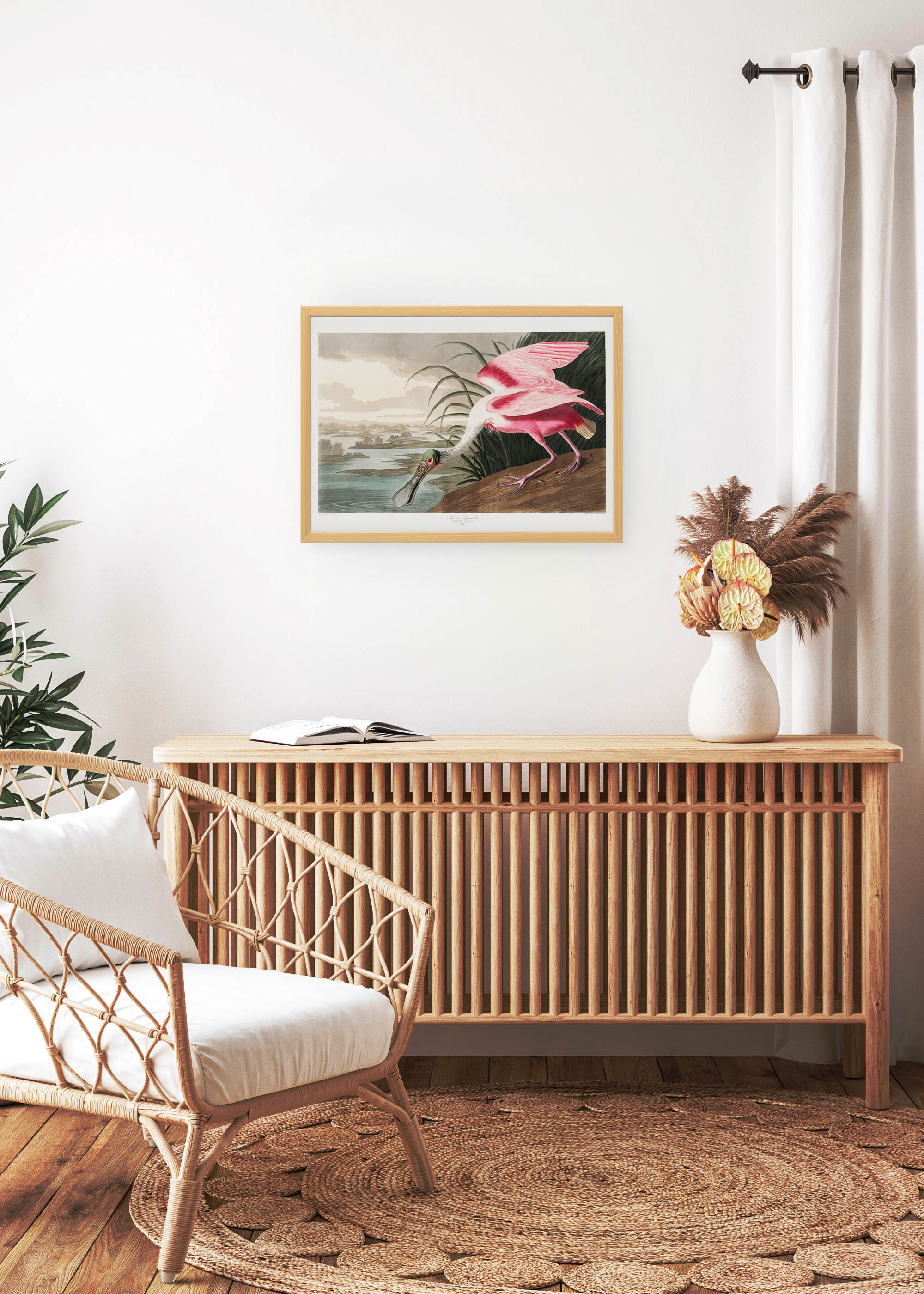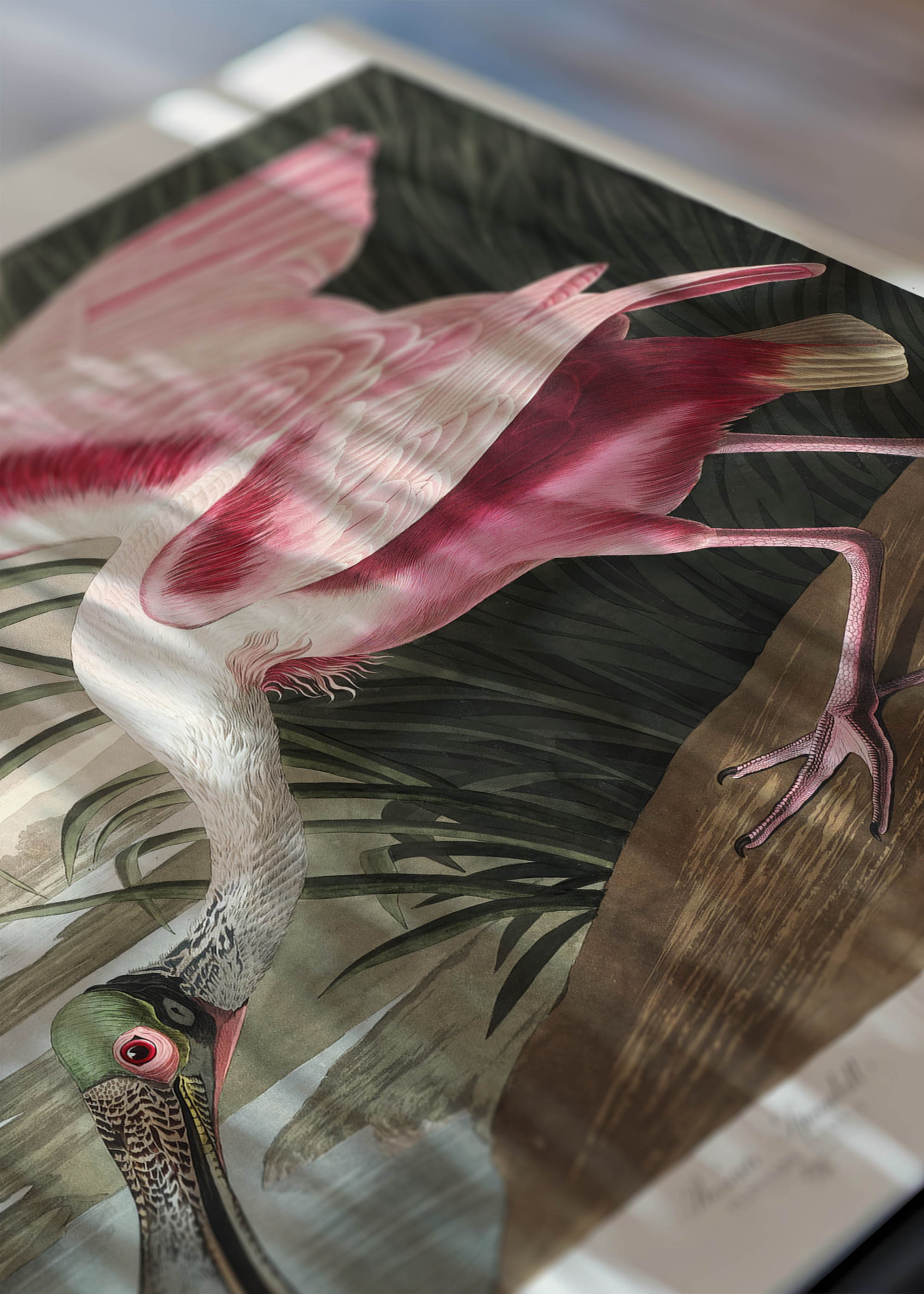 Ten niezwykły plakat to reprodukcja jednej z najpiękniejszych ilustracji ornitologicznych autorstwa Johna Jamesa Audubona, pochodzącej z monumentalnego dzieła „Birds of America” wydanego w latach 1827-1838. Roseate Spoonbill, czyli warzęcha różowa, został uwieczniony przez tego wybitnego naturalistę-artystę z charakterystyczną dla niego precyzją i wyczuciem estetycznym. Audubon, urodzony w 1785 roku, poświęcił życie dokumentowaniu awifauny Ameryki Północnej, tworząc dzieła o niespotykanej dotąd skali i detalu.