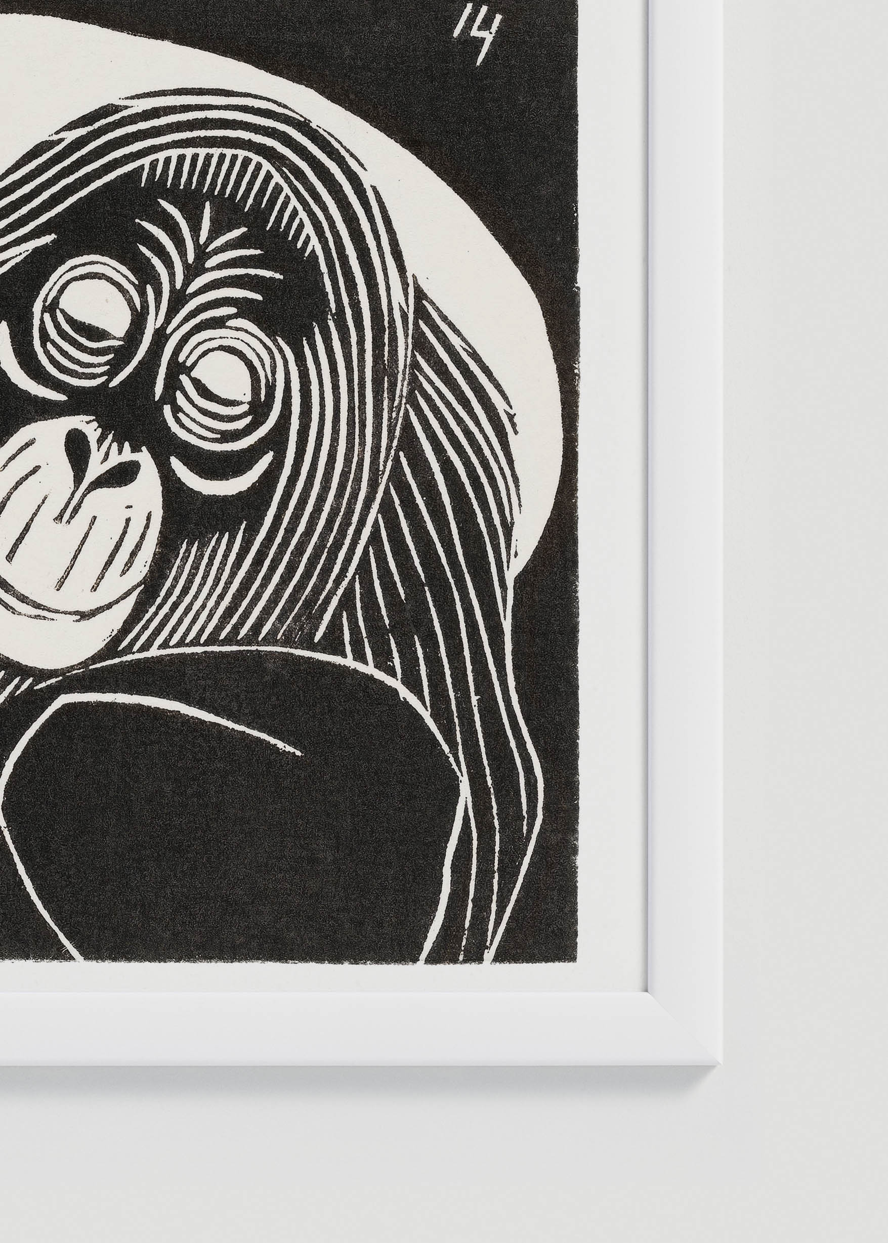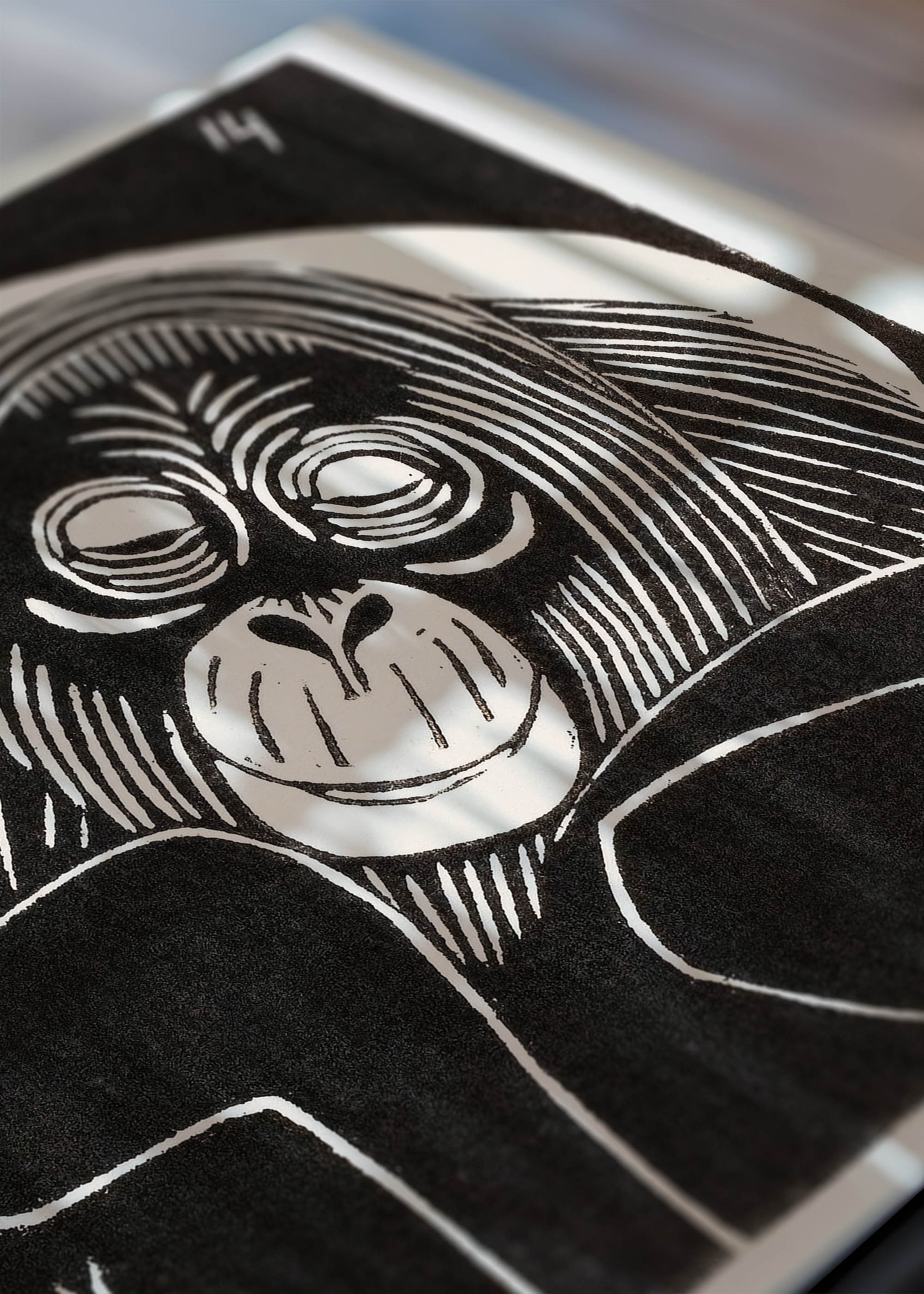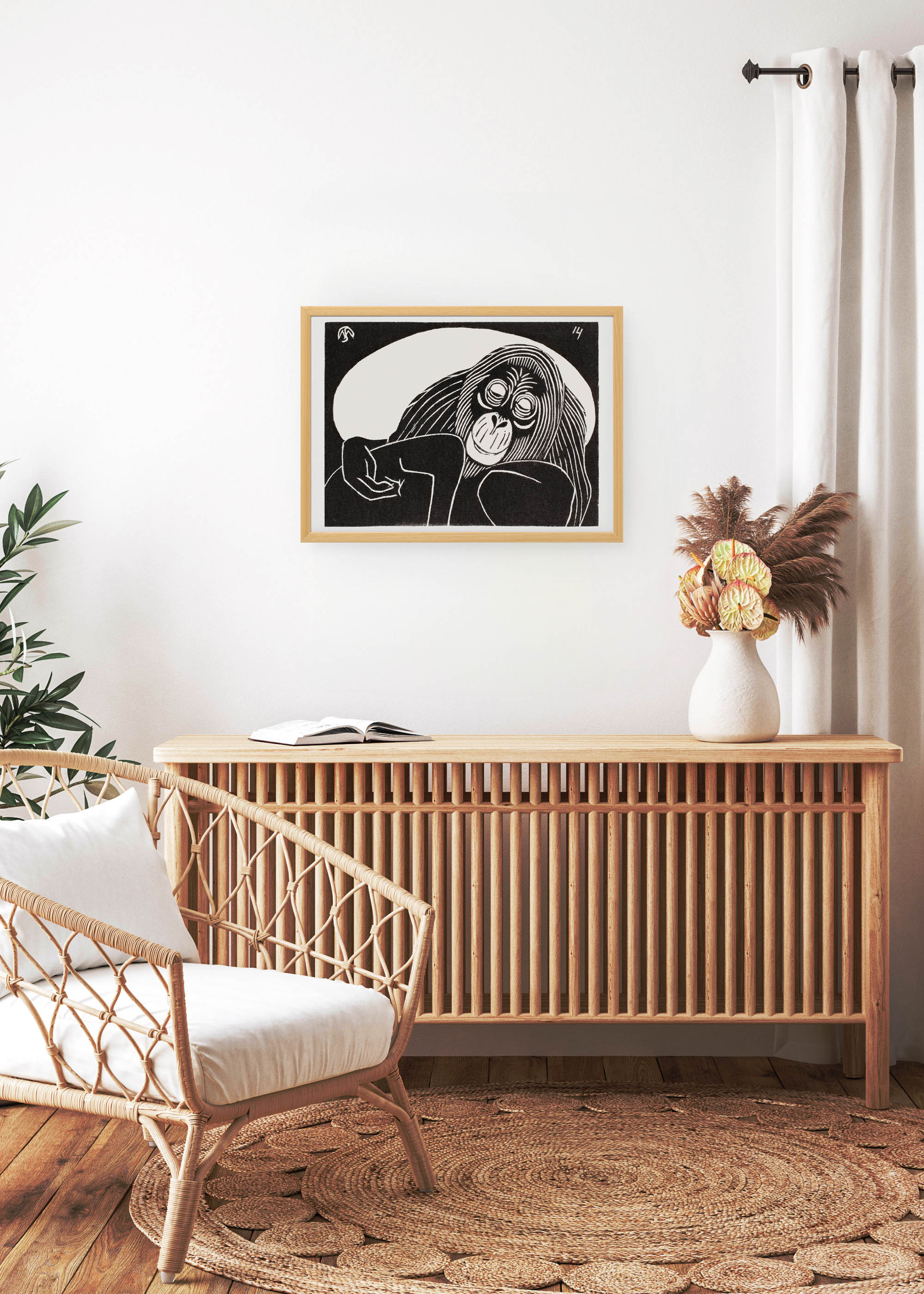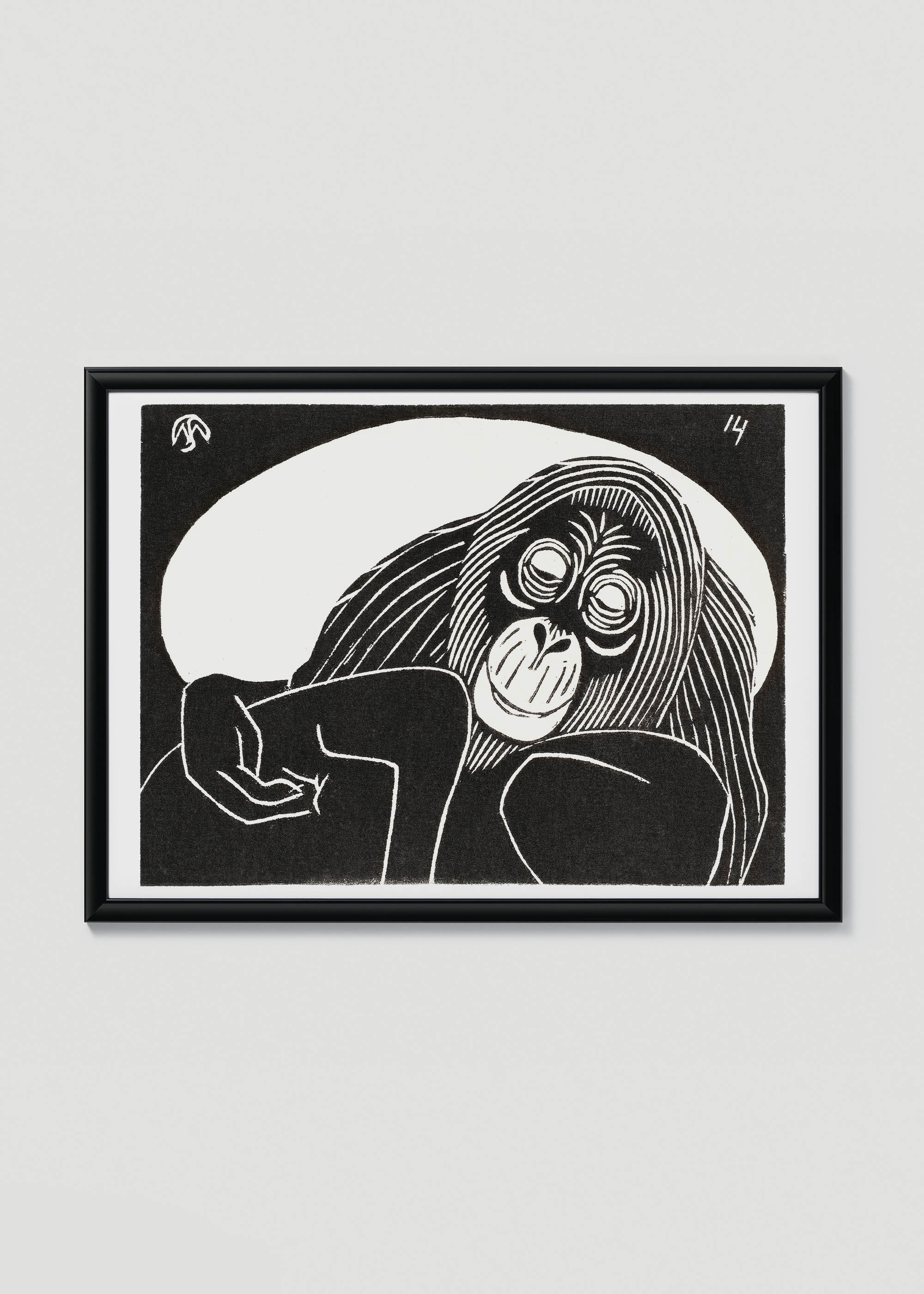 Ten fascynujący plakat przedstawiający orangutana, jest reprintem dzieła Samuela Jessurun de Mesquity – holenderskiego grafika żydowskiego pochodzenia, który tworzył na przełomie XIX i XX wieku. De Mesquita, nauczyciel słynnego M.C. Eschera, zasłynął z wyrazistych drzeworytów o silnym ładunku emocjonalnym. Jego prace cechuje charakterystyczny kontrast między czernią a bielą, który doskonale widać w tej kompozycji.