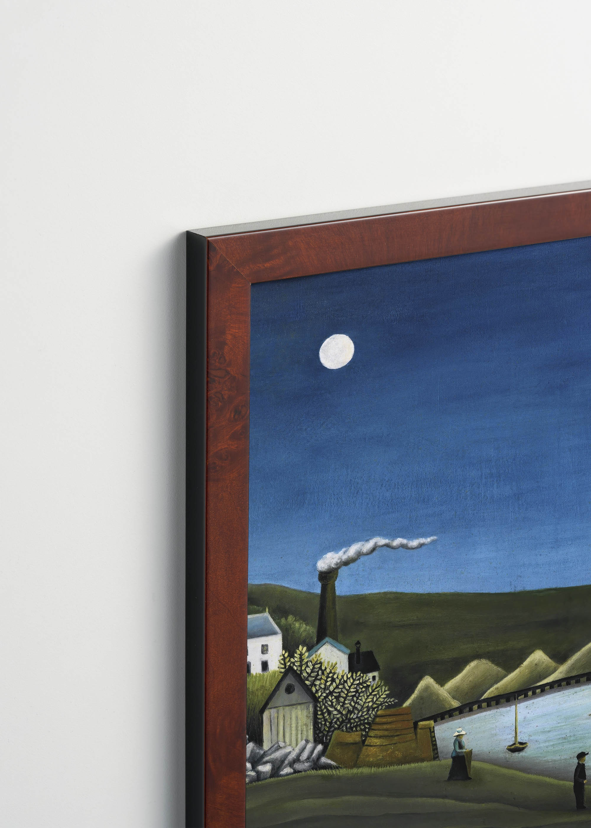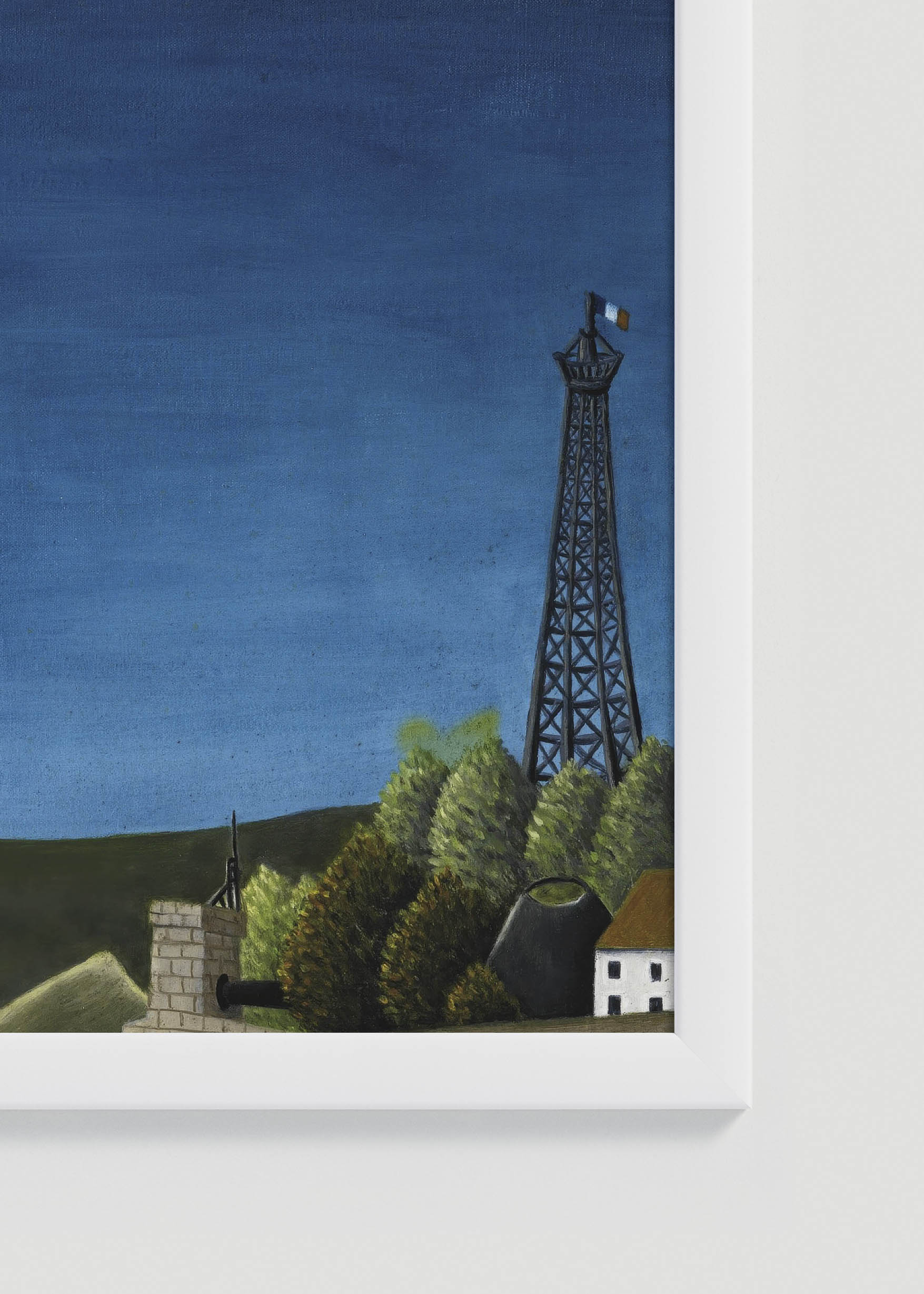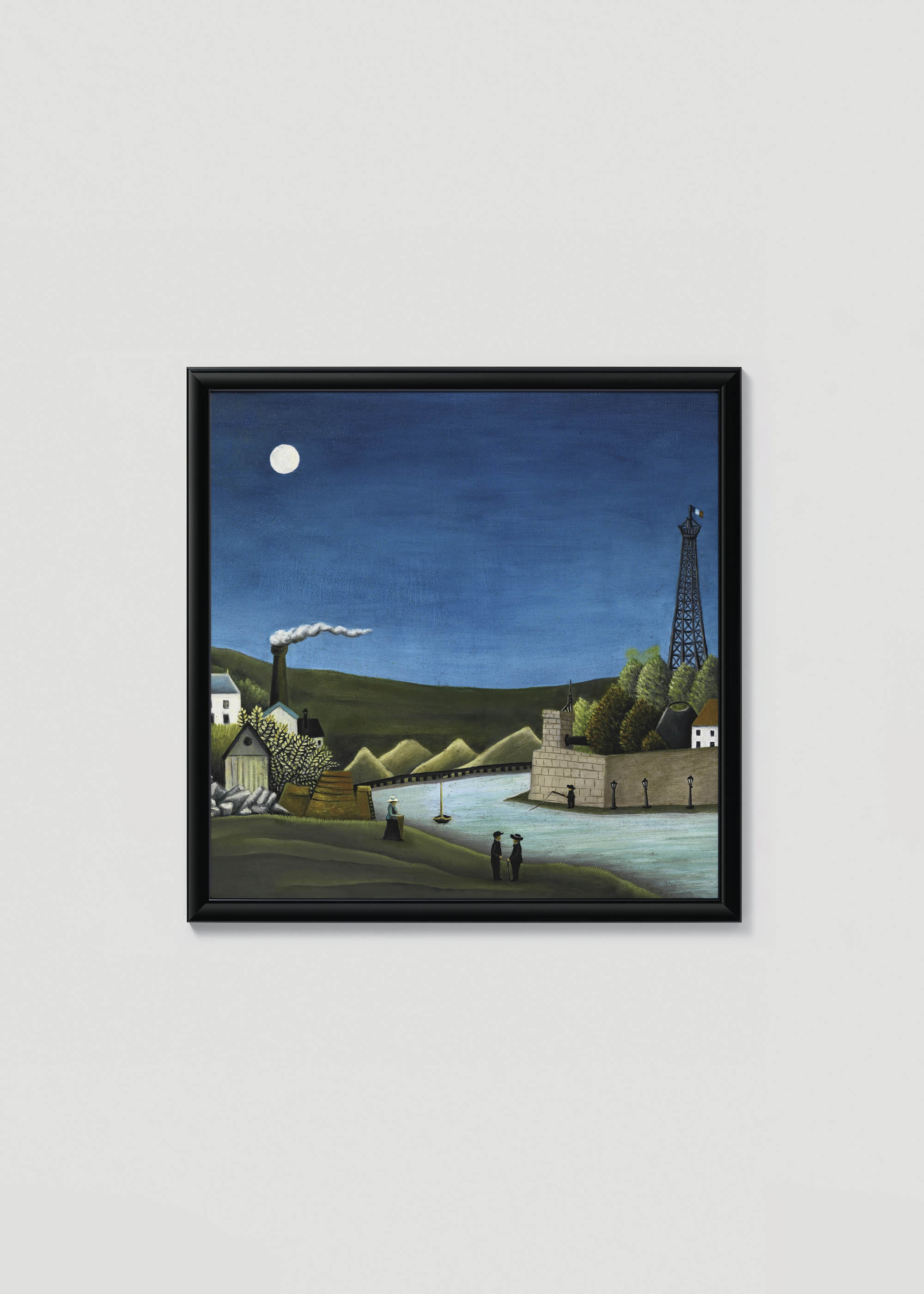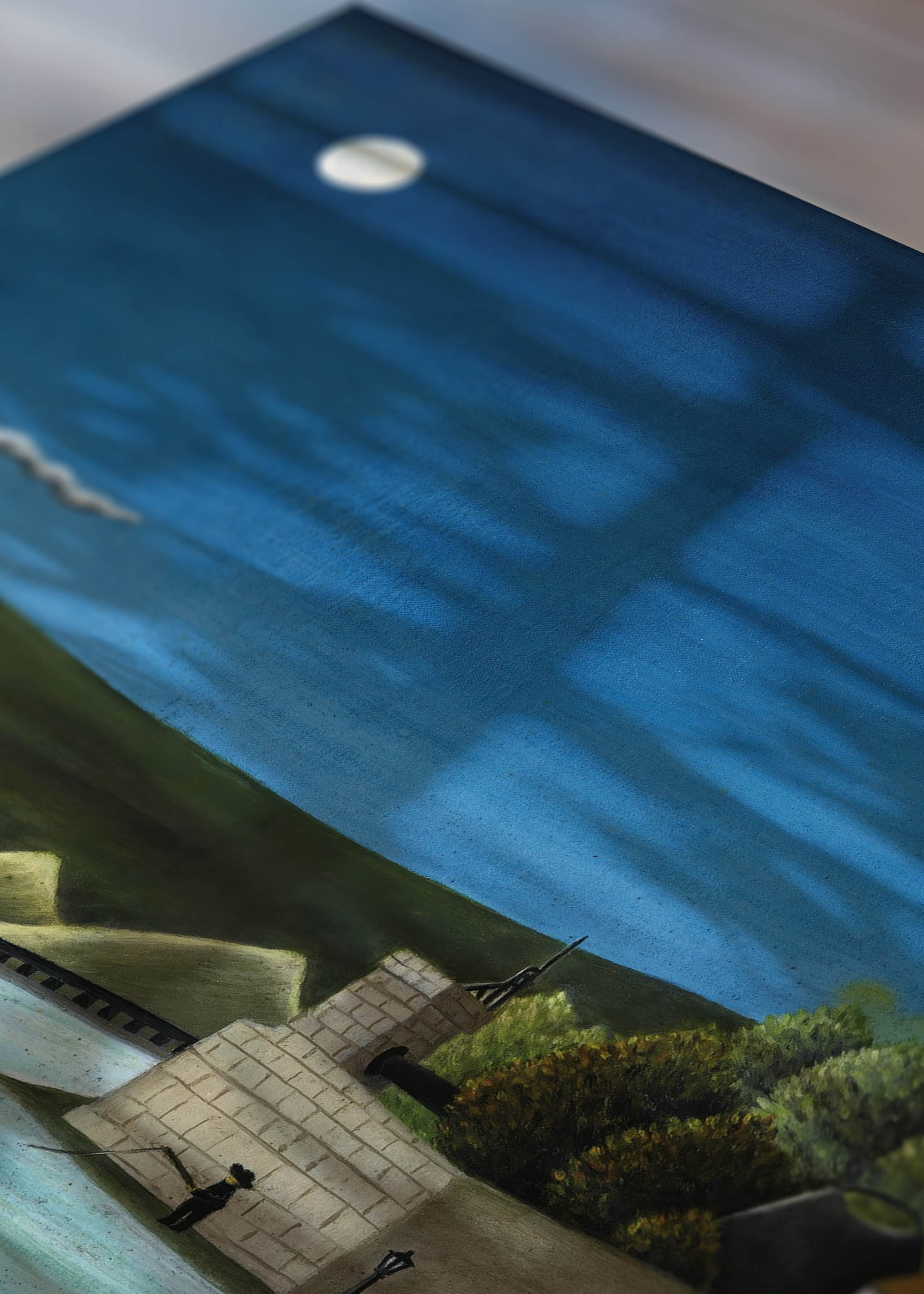 Kompozycja emanuje spokojną melancholią nocnego pejzażu przemysłowego. Dominująca kolorystyka opiera się na głębokich kobaltowych tonach nieba, kontrastujących z soczystą zielenią wzgórz i ciepłymi ochrami zabudowań. Charakterystyczna wieża Eiffla, dumnie wznosząca się po prawej stronie, nadaje całości paryskiego charakteru, podczas gdy biały księżyc w pełni rzuca delikatne, mleczne światło na całą scenę.