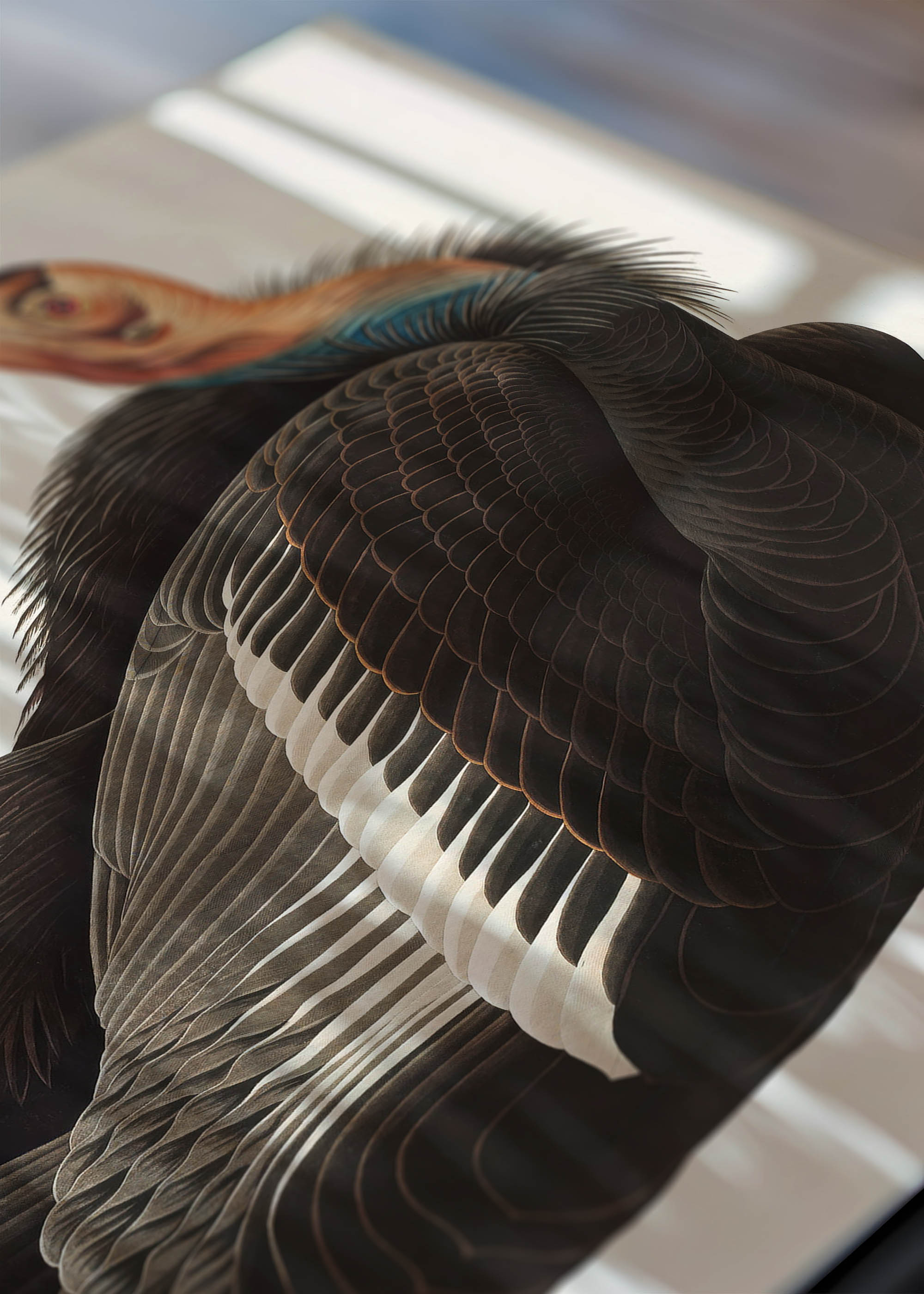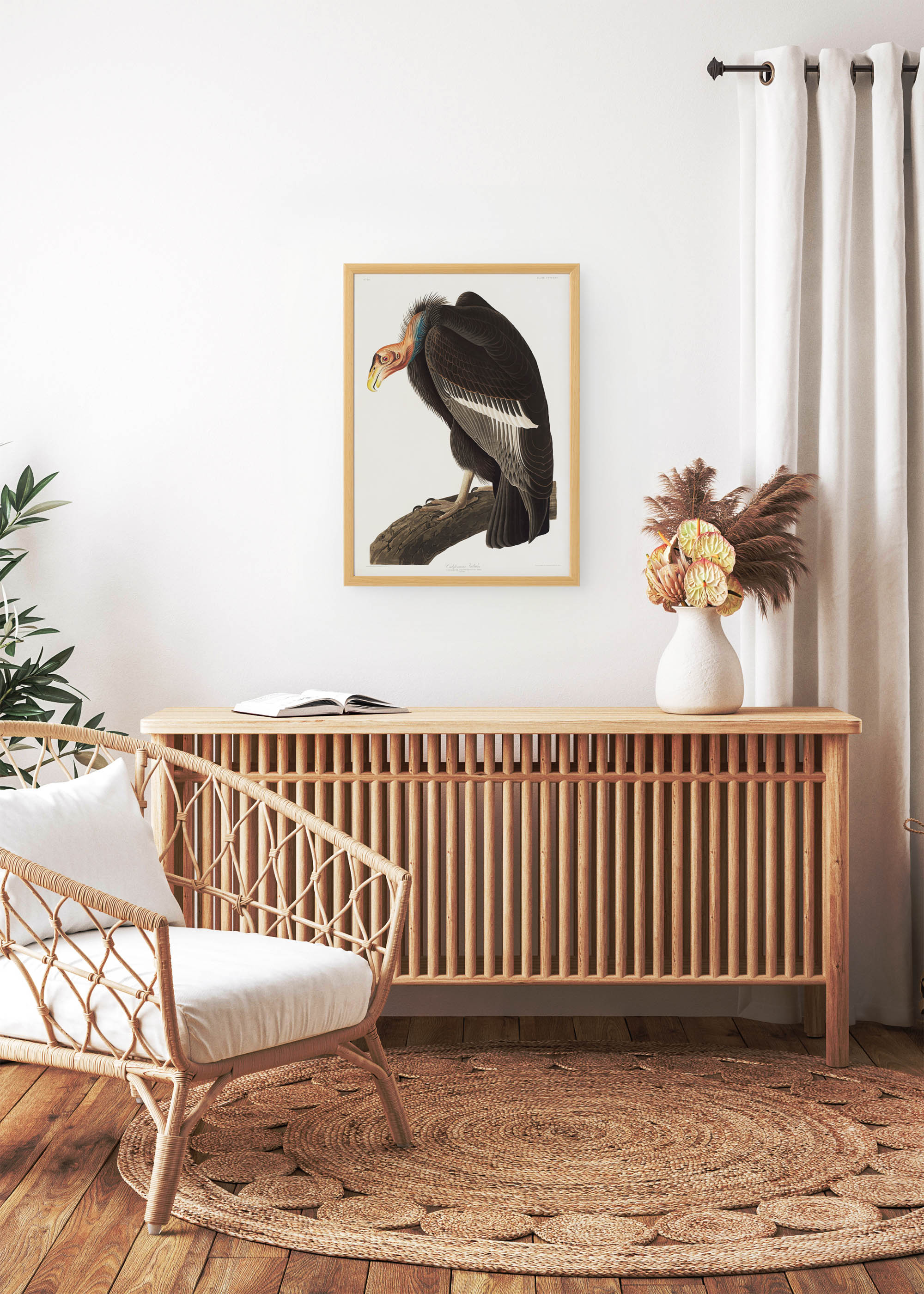 Ten wspaniały plakat przedstawia sępa (kondora kalifornijskiego), największego ptaka ameryki północnej, o rozpiętości skrzydeł dochodzącej nawet do 3 metrów. Ilustracja pochodzi z dzieła Johna Jamesa Audubona „Birds of America”, powstałego w latach 1827-1838. Audubon, francusko-amerykański przyrodnik i malarz, poświęcił ponad dekadę na stworzenie tego epokowego atlasu ornitologicznego, podróżując po rozległych obszarach Ameryki Północnej. Jego sęp kalifornijski to prawdziwe arcydzieło sztuki przyrodniczej, ukazujące majestat tego potężnego, budzącego respekt ptaka w całej okazałości.