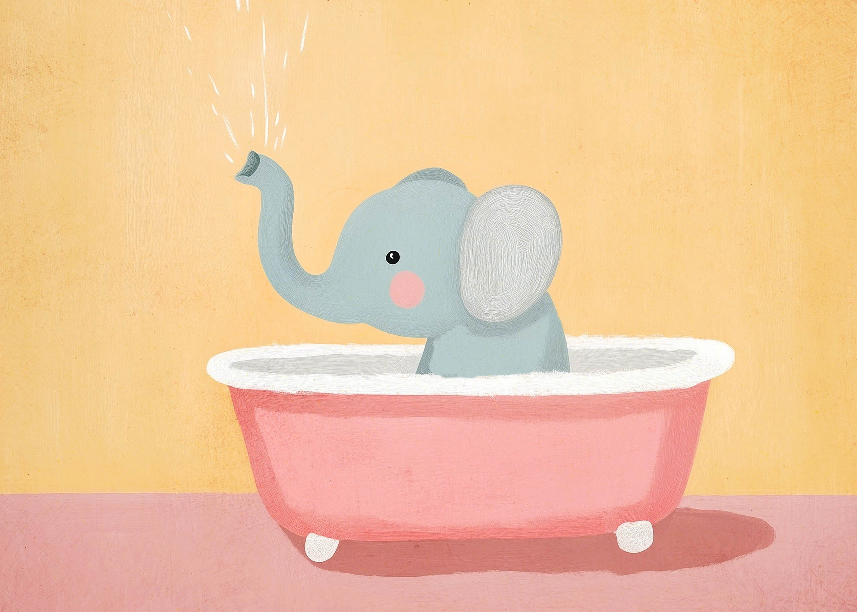 Ten urzekający plakat przedstawia małego słonika zażywającego beztroskiej kąpieli w różowej wannie z białymi nóżkami. Ilustracja emanuje niewinnością i radością dzieciństwa – słoniątko z uniesioną do góry trąbką rozpryskuje wodę, tworząc fontannę kropel, które zdają się tańczyć w powietrzu. Delikatne rumieńce na policzkach zwierzątka dodają mu uroczego, przyjaznego charakteru, który natychmiast podbije serca najmłodszych.
