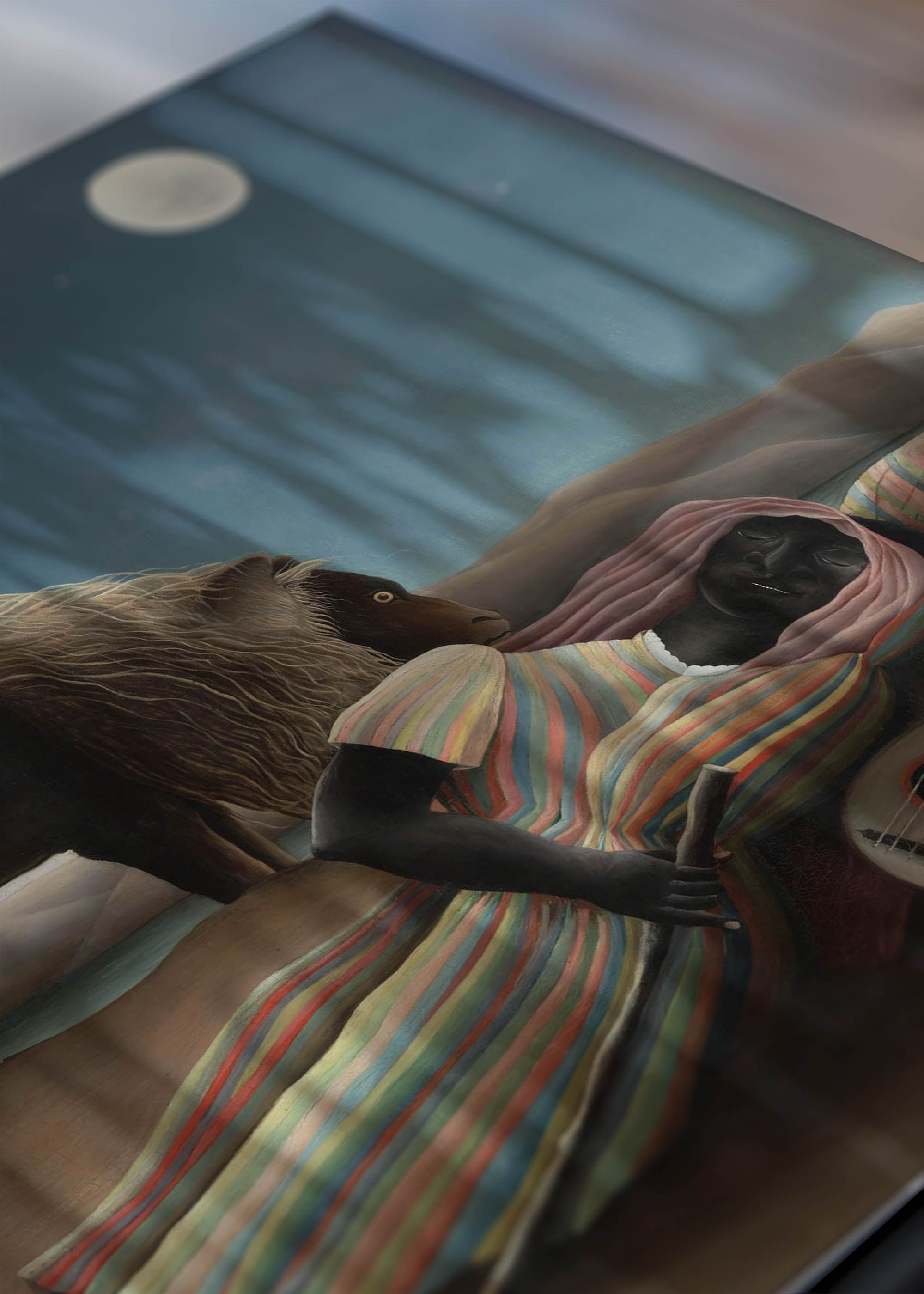 Rousseau, zwany „celnikiem” ze względu na swoją pierwszą profesję, nigdy nie opuszczał Francji, lecz jego wyobraźnia tworzyła egzotyczne sceny pełne magicznego realizmu. Fascynująca kolorystyka dzieła opiera się na ciepłych tonach ochry i umbry, kontrastujących z chłodnymi kobaltowymi niuansami nocnego nieba. Wielobarwny strój śpiącej postaci wprowadza żywe akcenty – tęczową gamę pasm w odcieniach czerwieni cynobru, żółci kadmowej i zieleni chromowej.