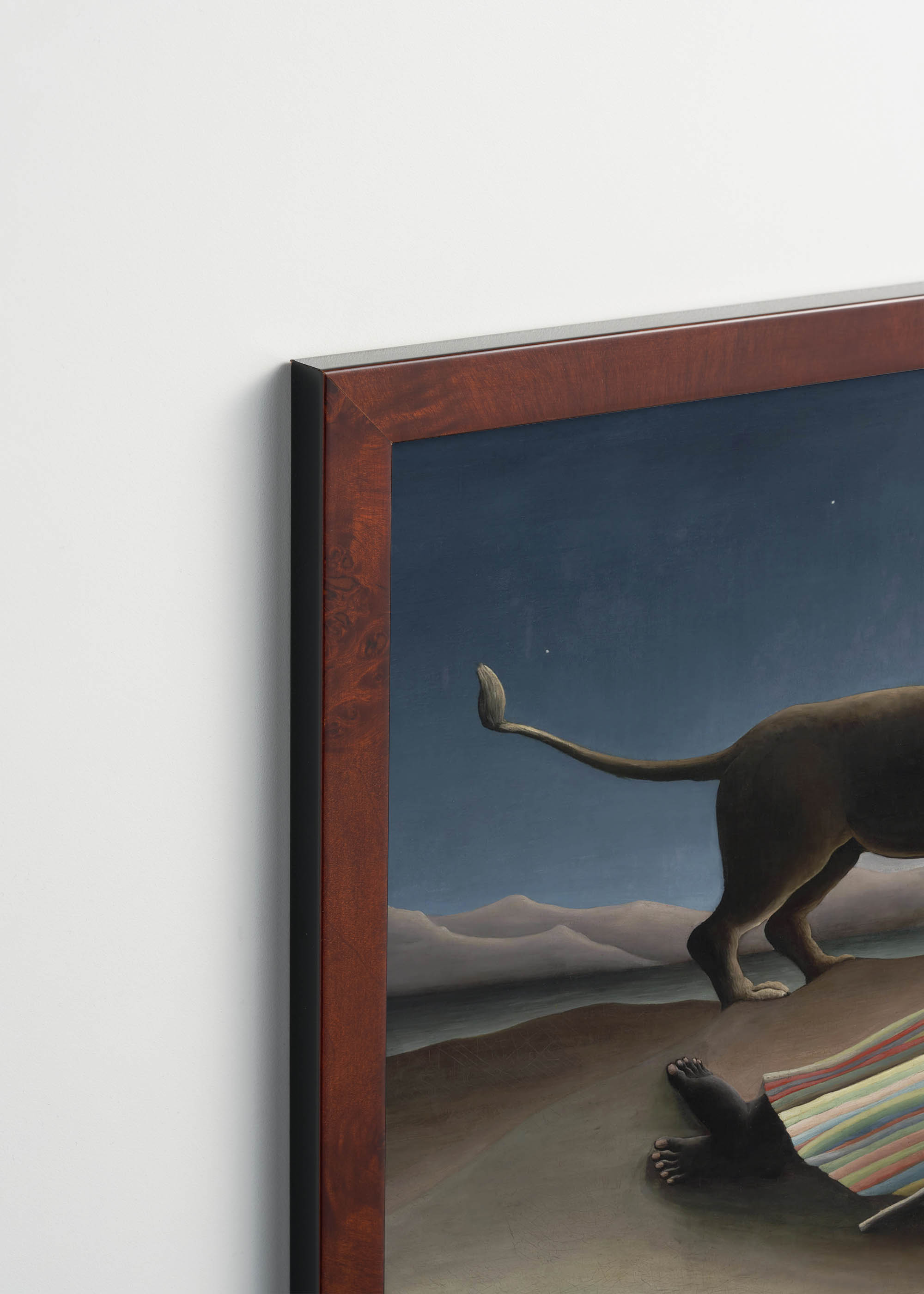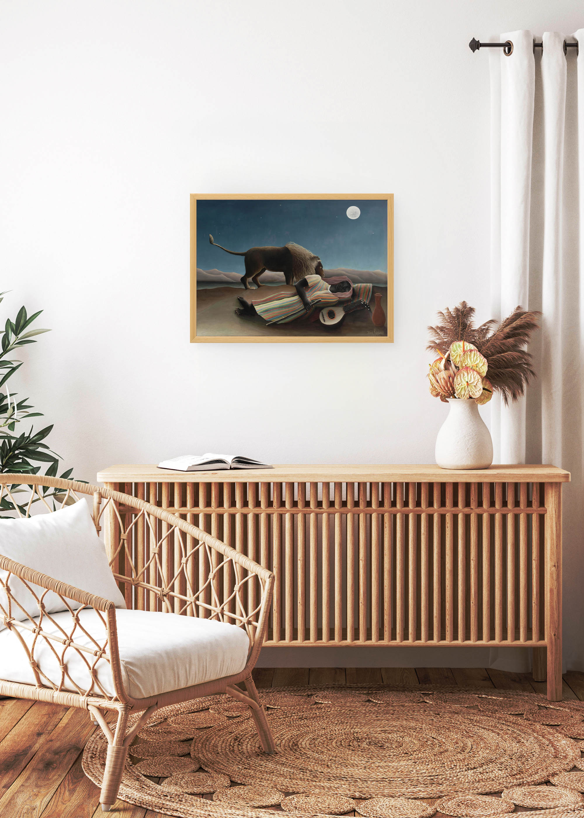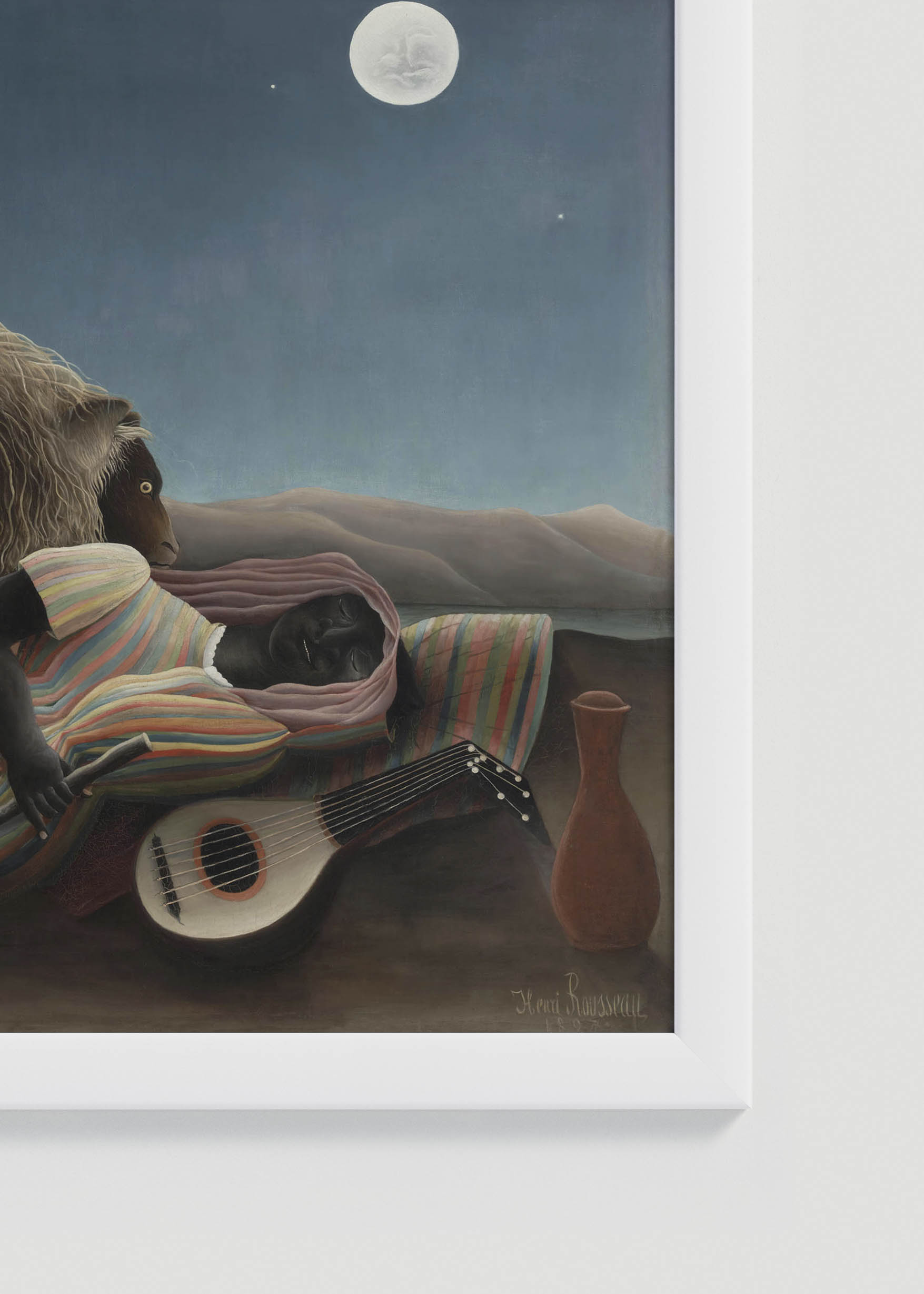Plakat przedstawiający reprintem wzoru „Śpiąca cyganka” (La Bohémienne endormie) autorstwa Henri Rousseau – dzieła powstałego w 1897 roku, które dziś znajduje się w zbiorach Museum of Modern Art w Nowym Jorku. Ten niezwykły obraz naiwnego malarza francuskiego prezentuje poetycką wizję snu pod rozgwieżdżonym niebem, gdzie tajemniczy lew czuwa nad śpiącą postacią w kolorowym stroju.