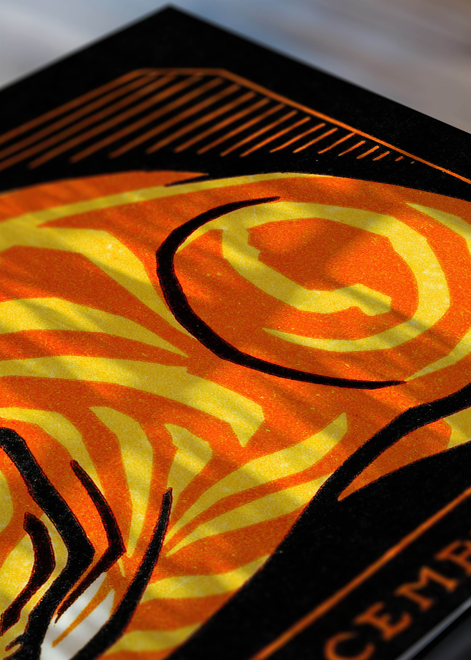 Centralną postacią wzoru jest śpiący kot, ujęty w charakterystycznej dla secesji manierze. Kolorystyka opiera się na ciepłych odcieniach – dominują soczysty pomarańczowy kadm i żółcie przypominające miód lipowy, kontrastujące z głęboką czernią tła. Te ogniście-miedziane tony tworzą harmonijną paletę kolorów ziemi, która emanuje spokojem i domowym ciepłem.