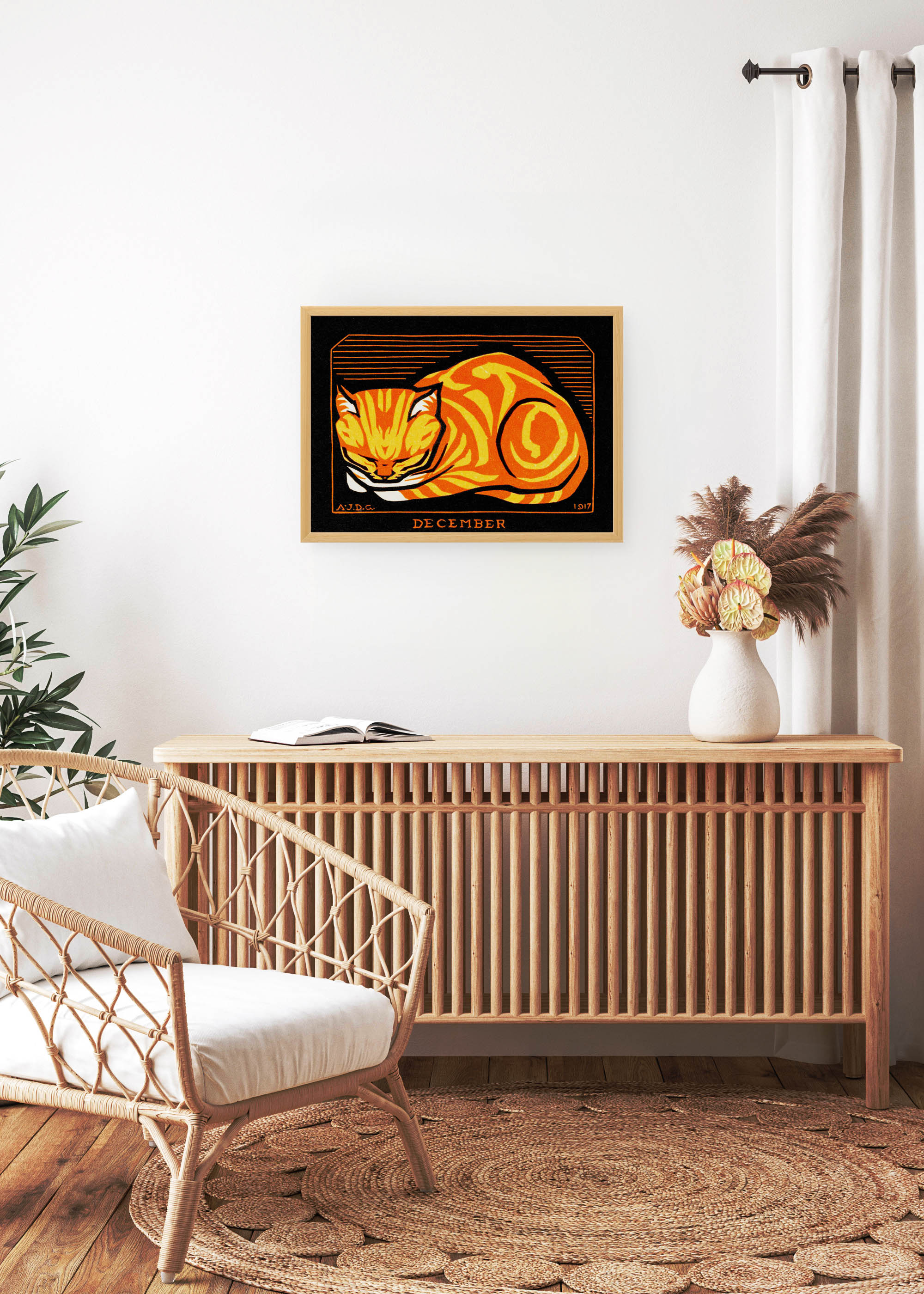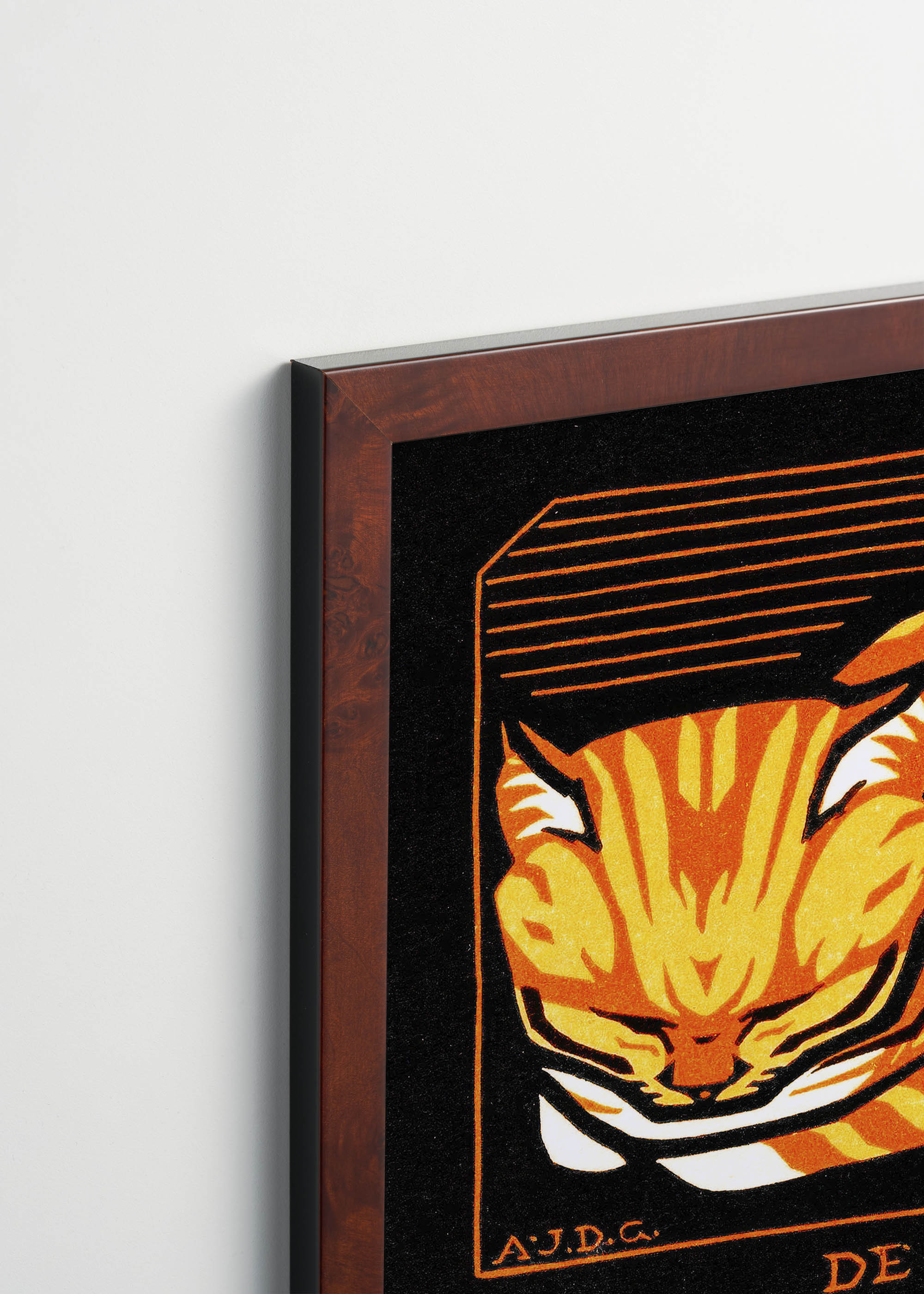 Ten wyjątkowy plakat przedstawia reprintksiążkowego dzieła Julie de Graag z 1917 roku – holenderskiej artystki związanej z ruchem Arts and Crafts. De Graag, znana ze swoich drzeworytów i linorytów, tworzyła w okresie, gdy sztuka użytkowa przeżywała prawdziwy renesans w Holandii. Jej prace charakteryzowały się wyrazistymi kontrastami i stylizowaną formą, co doskonale widać w tej kompozycji.