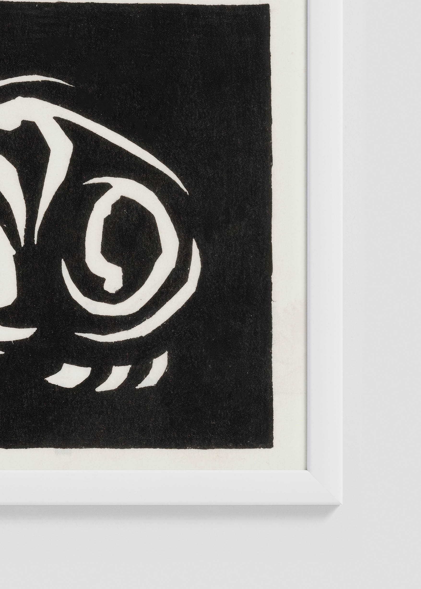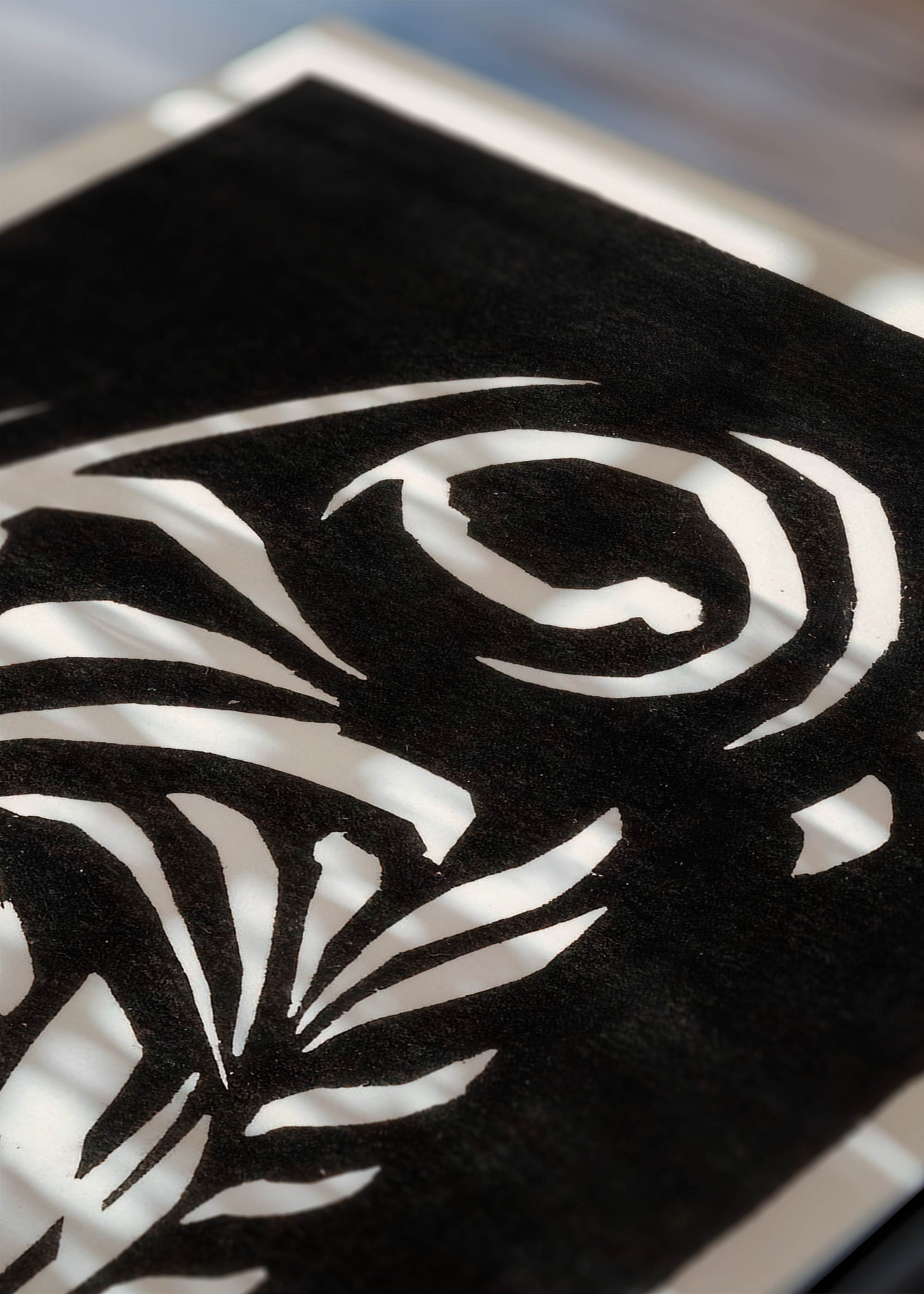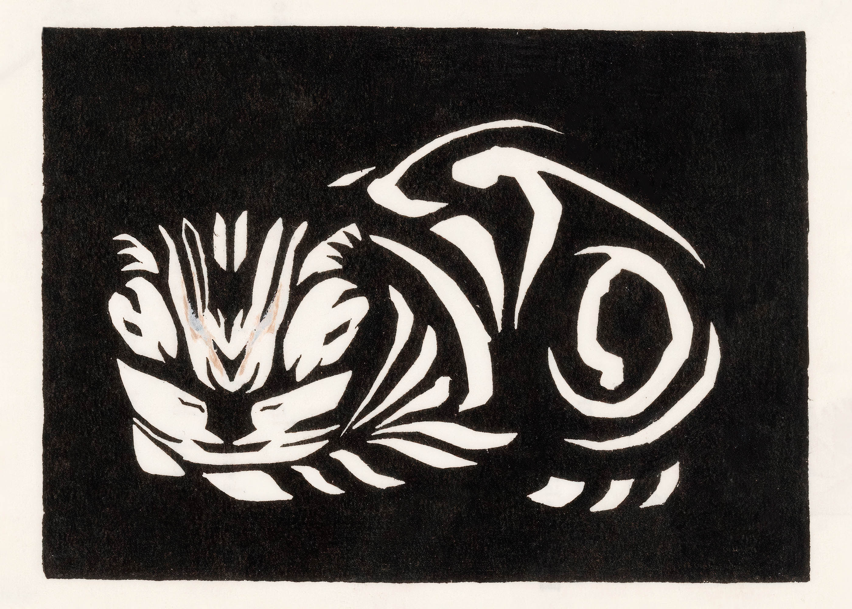 Kompozycja ukazuje śpiącego kota, którego sylwetka została oddana w technice negatywu – kremowobiała kreska na głębokiej czerni. Kolorystyka opiera się na klasycznym zestawieniu bieli i czerni, tworząc dramatyczny kontrast charakterystyczny dla techniki drzeworytu. Biała linia o różnej grubości modeluje kształt zwierzęcia, nadając mu plastyczność i miękkość, mimo oszczędności środków wyrazu.