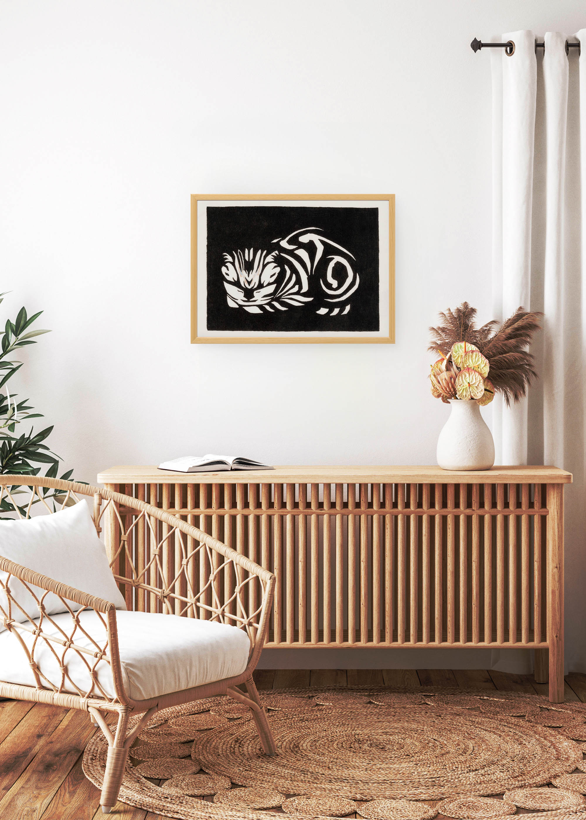 Plakat będzie doskonałym uzupełnieniem wnętrz w stylu minimalistycznym, skandynawskim lub industrial. Sprawdzi się również w aranżacjach nawiązujących do klasyki grafiki artystycznej. Plakatello prezentuje to dzieło jako hołd dla miłośników sztuki graficznej i kotów jednocześnie.