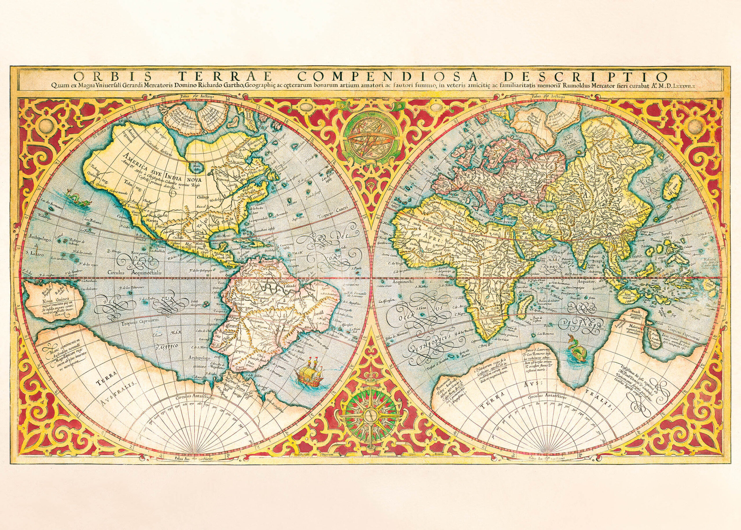 Ten niezwykły plakat przedstawia replikę mapy świata „Orbis Terrae Compendiosa Descriptio” pochodzącej z końca XVI wieku. To fascynujące dzieło kartograficzne, stworzone prawdopodobnie około 1587 roku przez flamandzkiego kartografa Gerarda Mercatora, ukazuje świat w charakterystycznej dla epoki renesansu projekcji dwuhemisferycznej. Mapa ta powstała w czasach wielkich odkryć geograficznych, gdy europejscy żeglarze wciąż poznawali nieznane zakątki globu, a kartografowie starali się uchwycić kształt znanego świata na papierze.