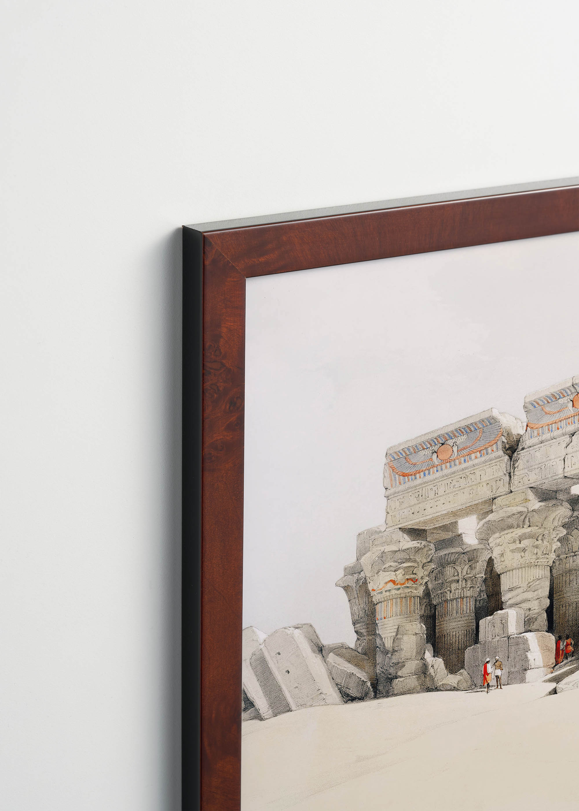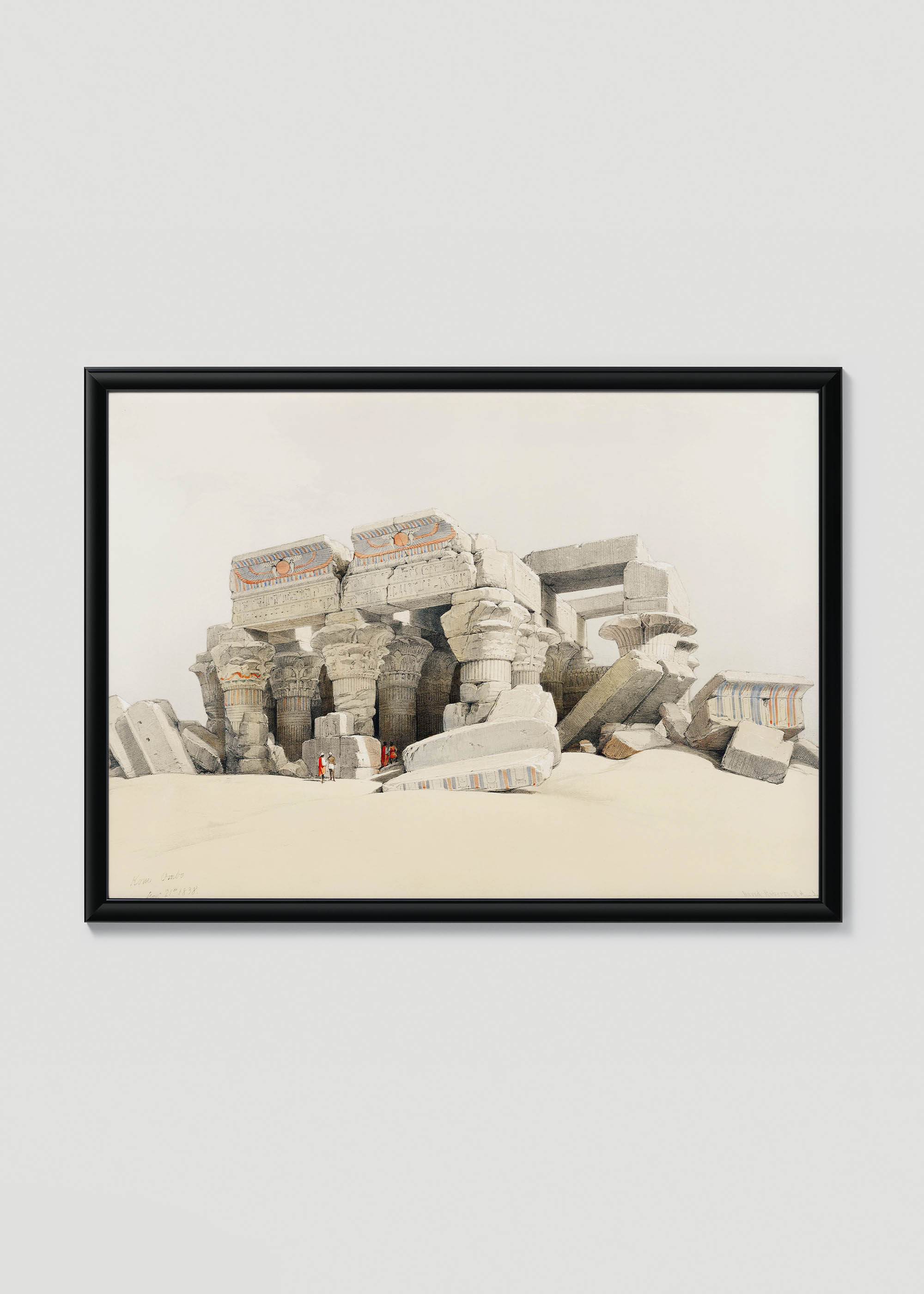 Ten niezwykły plakat to reprint akwareli z monumentalnego dzieła Davida Robertsa „Egypt and Nubia” (1846-1849), przedstawiający ruiny świątyni w Kom Ombo. Roberts, szkocki malarz i litograf, odbył swoją słynną podróż do Egiptu i Ziemi Świętej w latach 1838-1839, dokumentując starożytne zabytki z niebywałą precyzją. Jego prace, wydane jako luksusowe litografie kolorowane ręcznie, stały się jednymi z najważniejszych wizualnych świadectw egipskiej architektury przed erą masowej turystyki i fotografii.