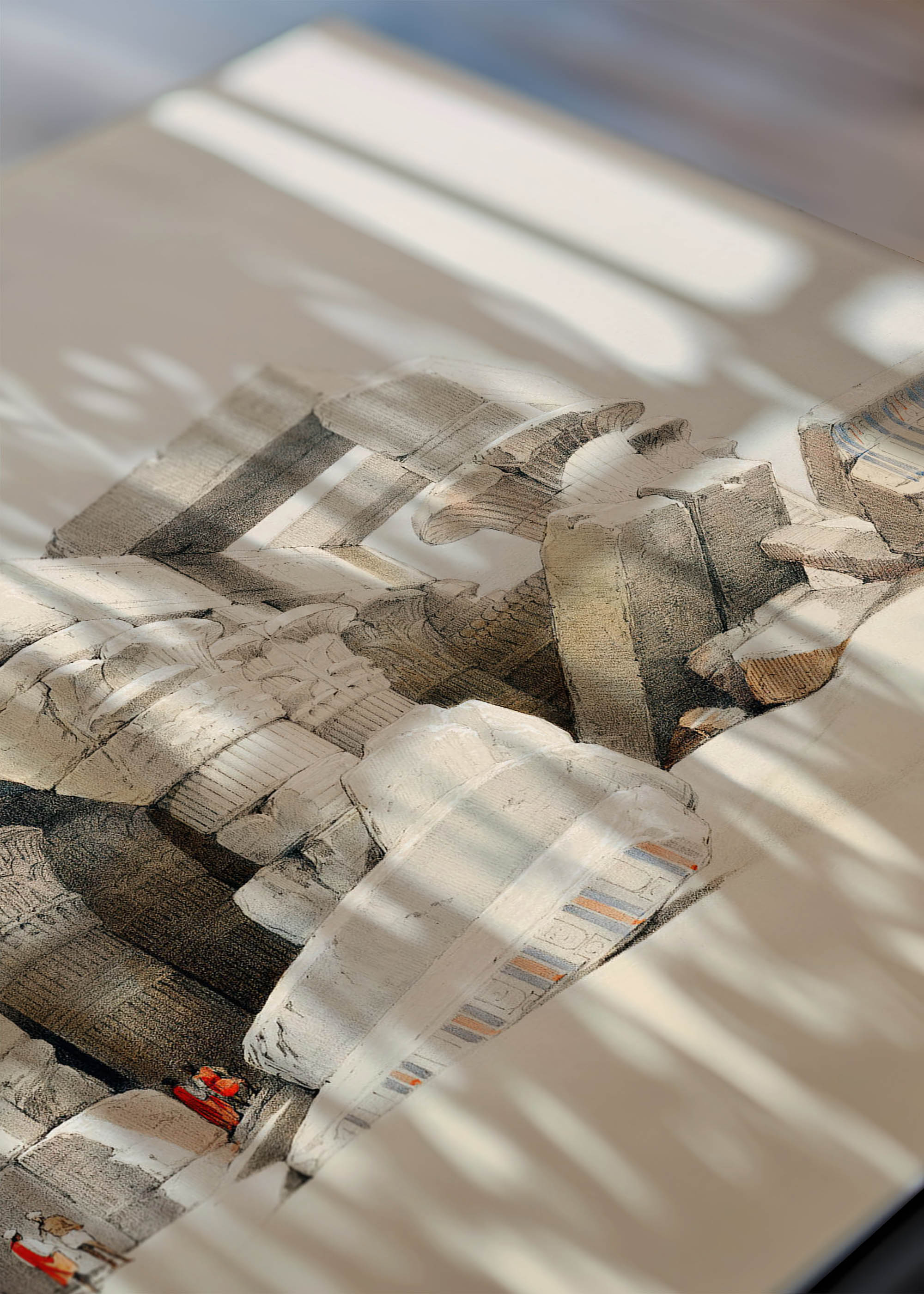 Kolorystyka tego dzieła opiera się na subtelnej palecie barw ziemi – od kremowych i piaskowych tonów po delikatne szarości kamienia. Akcenty kobaltu i pomarańczowej ochry widoczne w zachowanych fragmentach polichromii świątynnych nadają kompozycji życia, przywołując dawną świetność tego miejsca. Artysta mistrzowsko oddał fakturę pokruszonego wapienia i piaskowca, używając zniuansowanych odcieni sepii i umbry.