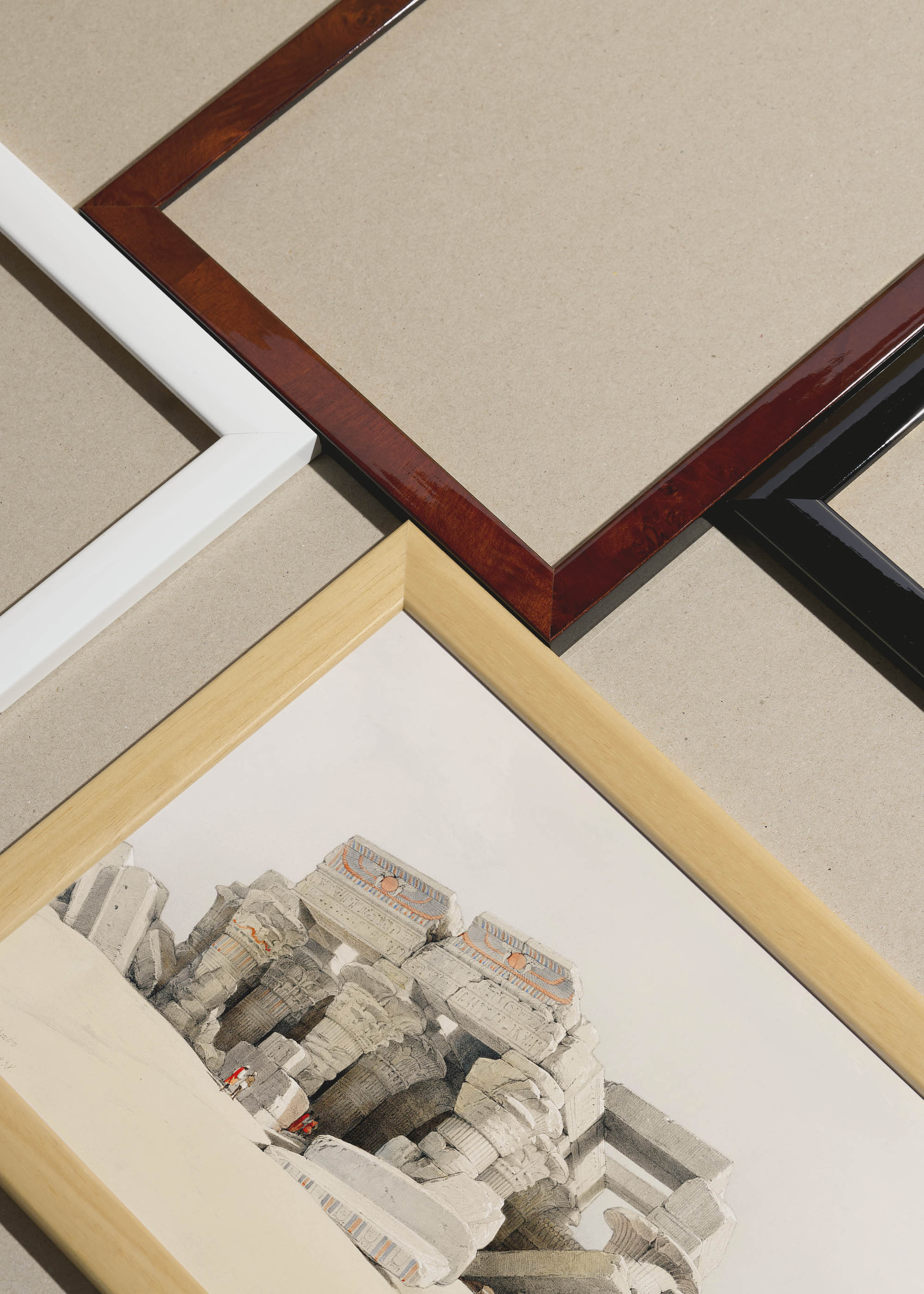Packshot ramek Plakatello® wykonanych z włoskich i polskich listew ramiarskich. Ramy tworzone ręcznie w pracowni w Lublinie z wykorzystaniem tradycyjnych manualnych narzędzi. Każda rama jest indywidualnie wykańczana i kontrolowana przed wysyłką. Szeroka paleta kolorów pozwala dobrać idealną oprawę do plakatów i obrazów.