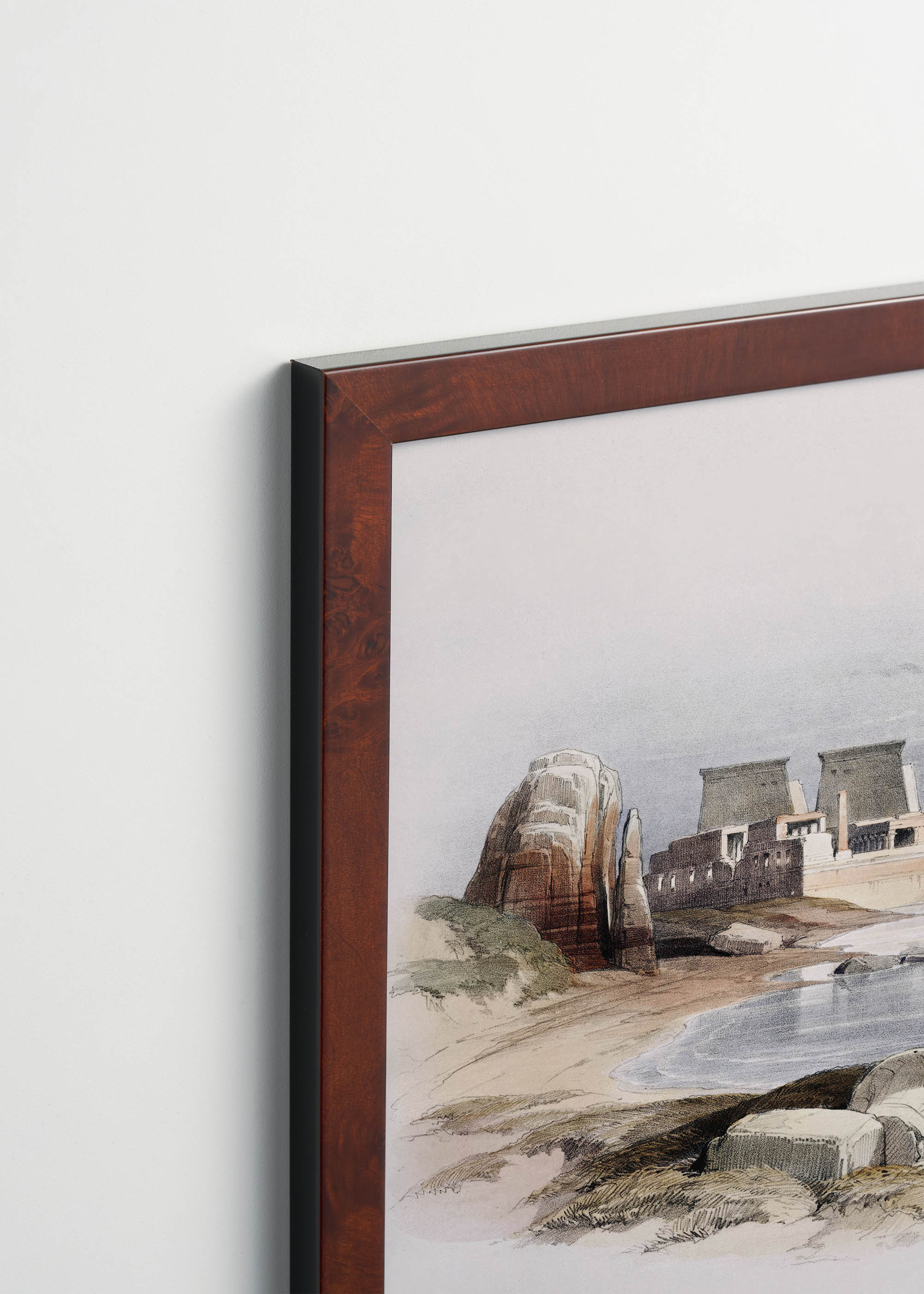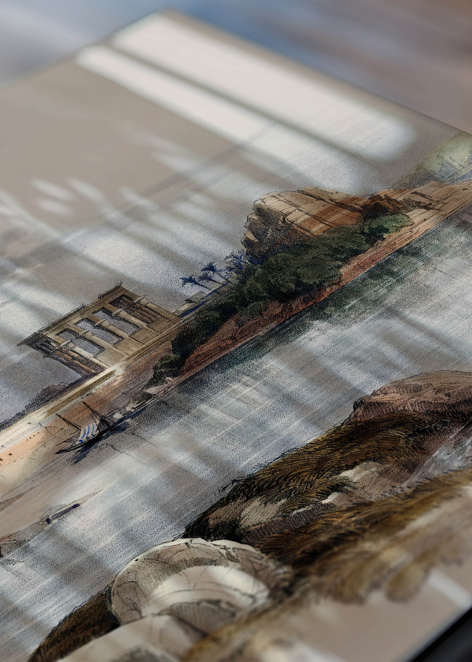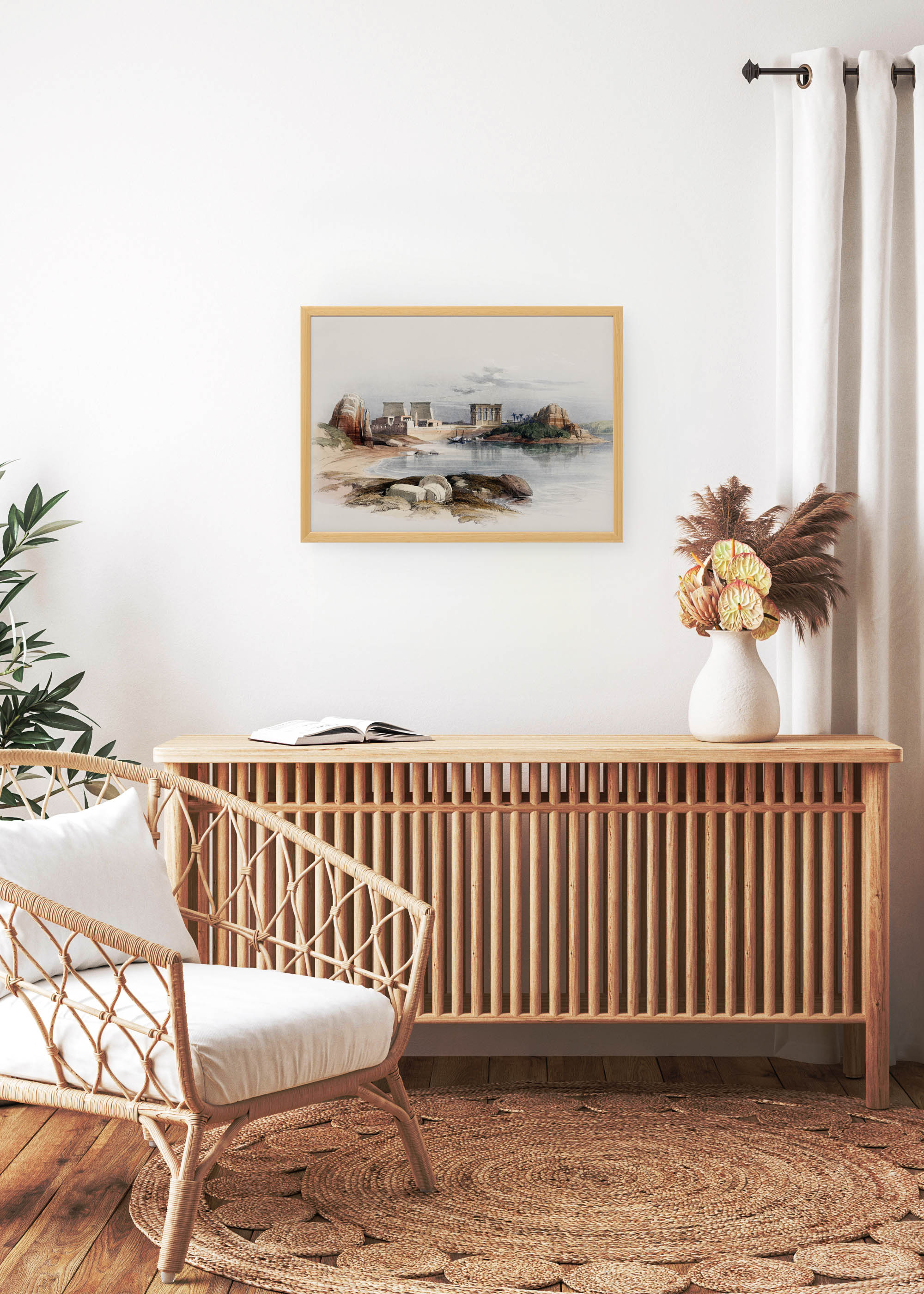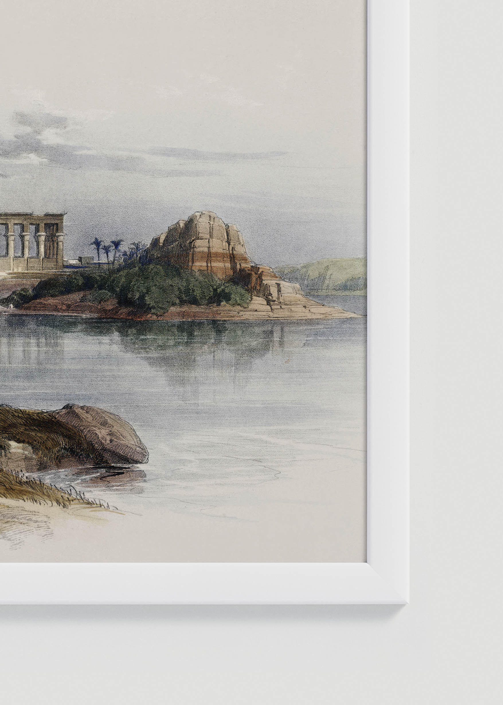 Na tym niezwykłym plakacie podziwiamy widok na świątynię w Philae – wyspę uznawaną za perłę Nilu. Roberts uchwycił majestatyczne pylony i kiosk Trajana w całej okazałości, otoczone spokojnymi wodami rzeki. Kolorystyka dzieła to subtelna symfonia barw zbliżonych do sepii i ugru, wzbogacona delikatnymi akcentami błękitu nieba. Dominują ciepłe, piaskowe tony oraz szarości kamienia, które przywodzą na myśl pustynny krajobraz Egiptu.