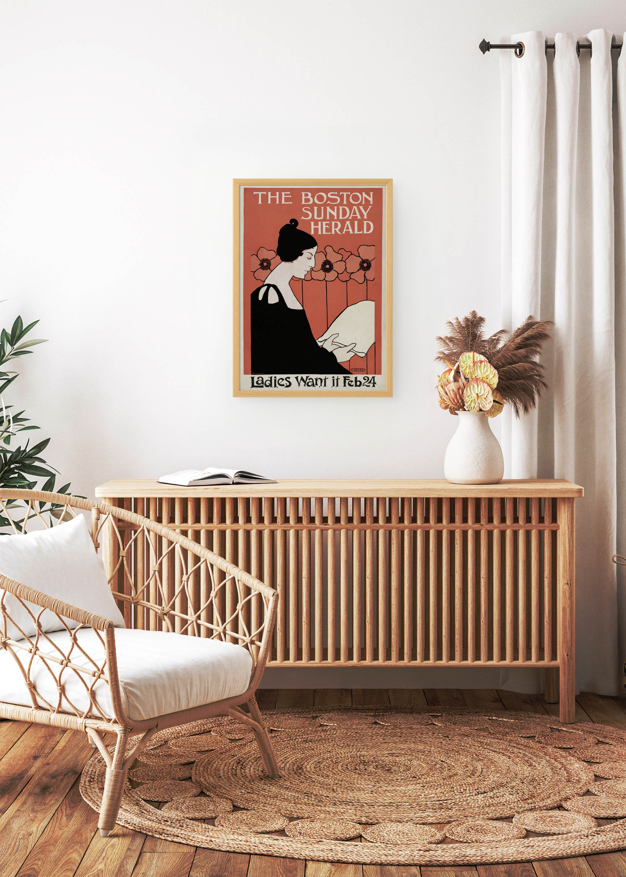 Plakat „The Boston Sunday Herald” to wyjątkowy reprint projektu Ethel Reed z 1895 roku, powstały dla bostońskiej gazety niedzielnej. Reed, uznawana za jedną z pierwszych amerykańskich projektantek plakatów, tworzyła w epoce fin de siècle, gdy sztuka użytkowa zaczynała zdobywać należne jej uznanie. Ten konkretny projekt powstał w okresie jej największej aktywności twórczej, kiedy to jako zaledwie dwudziestoparolatka zdominowała bostoński rynek wydawniczy swoimi nowatorskimi pracami.