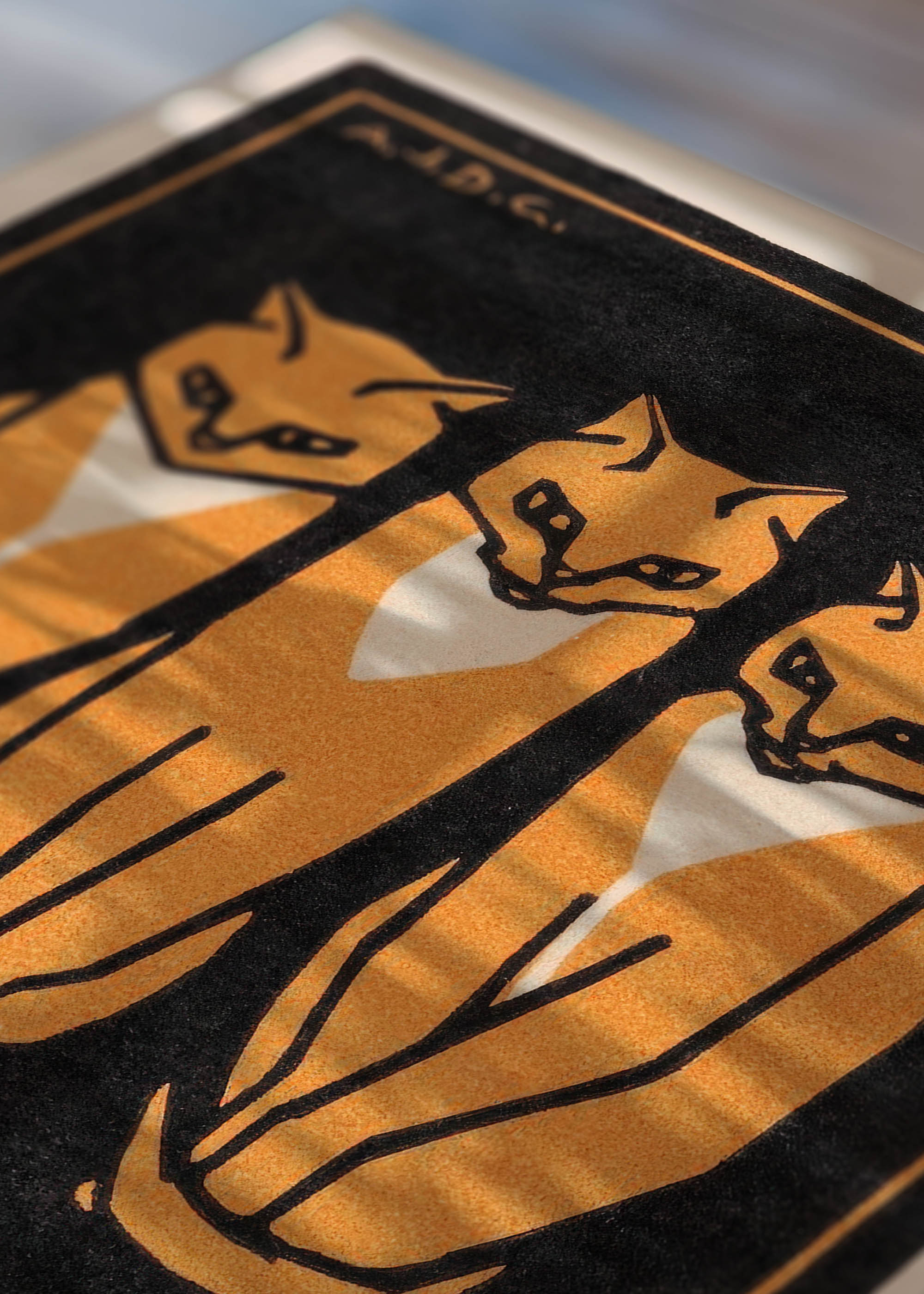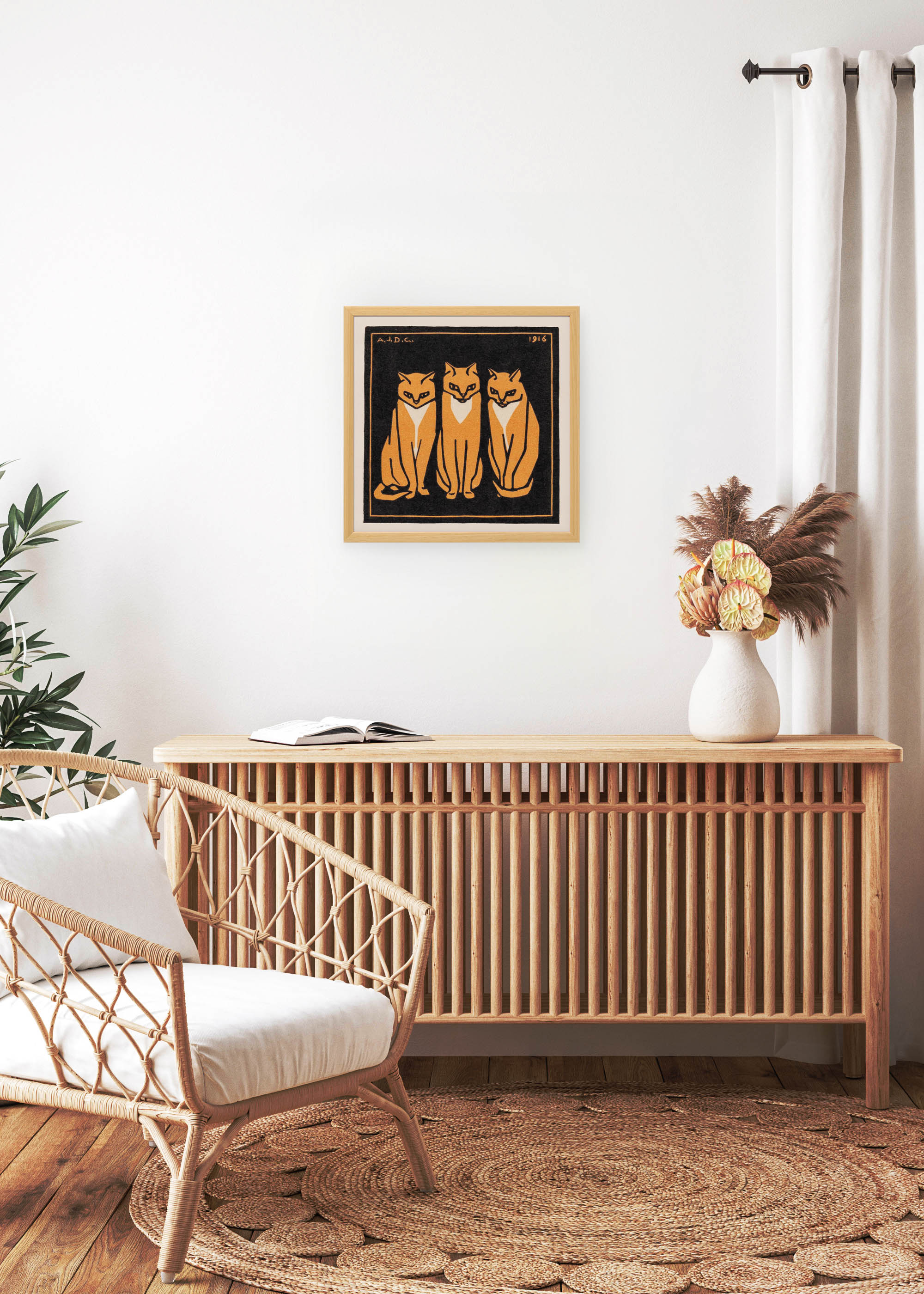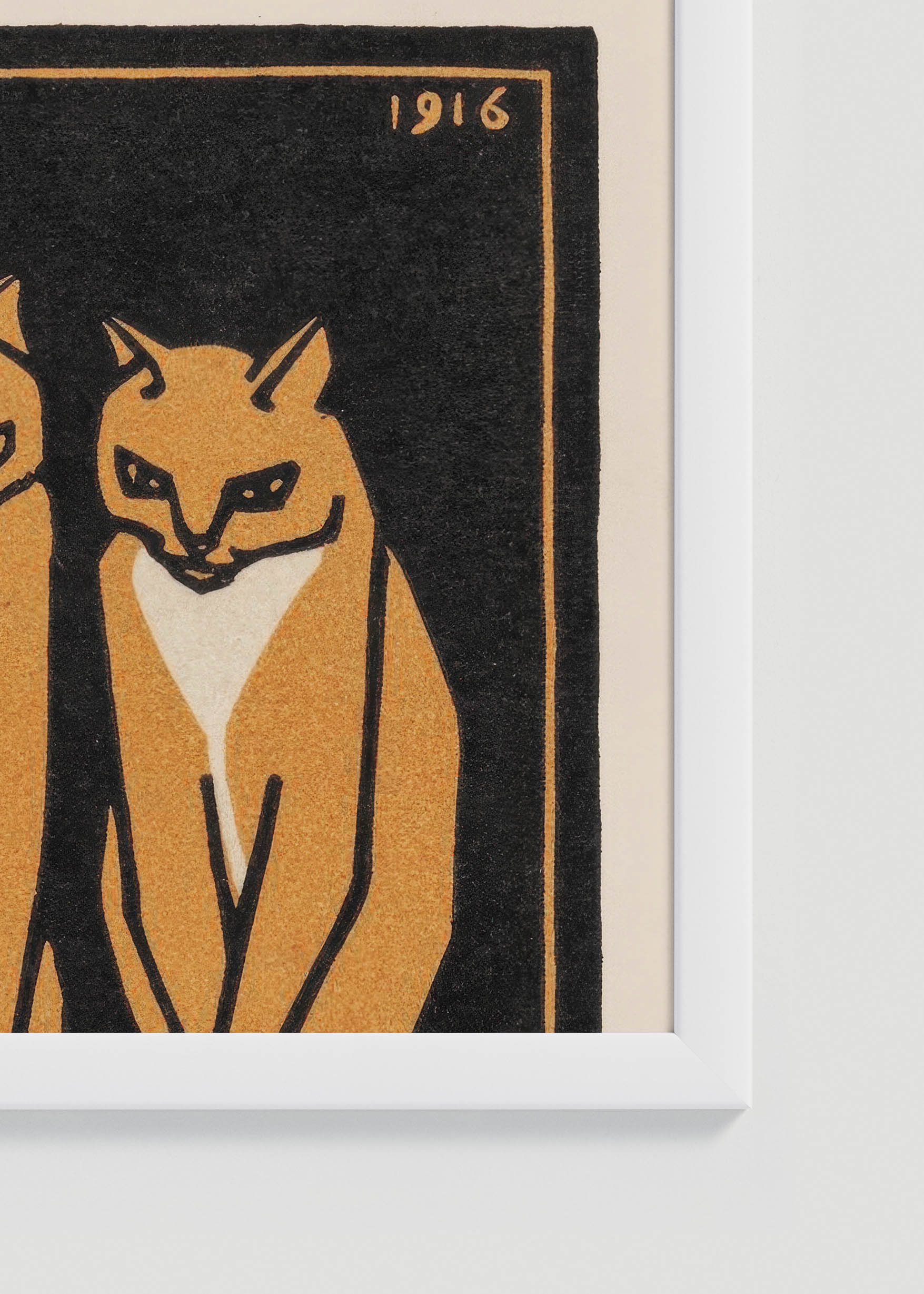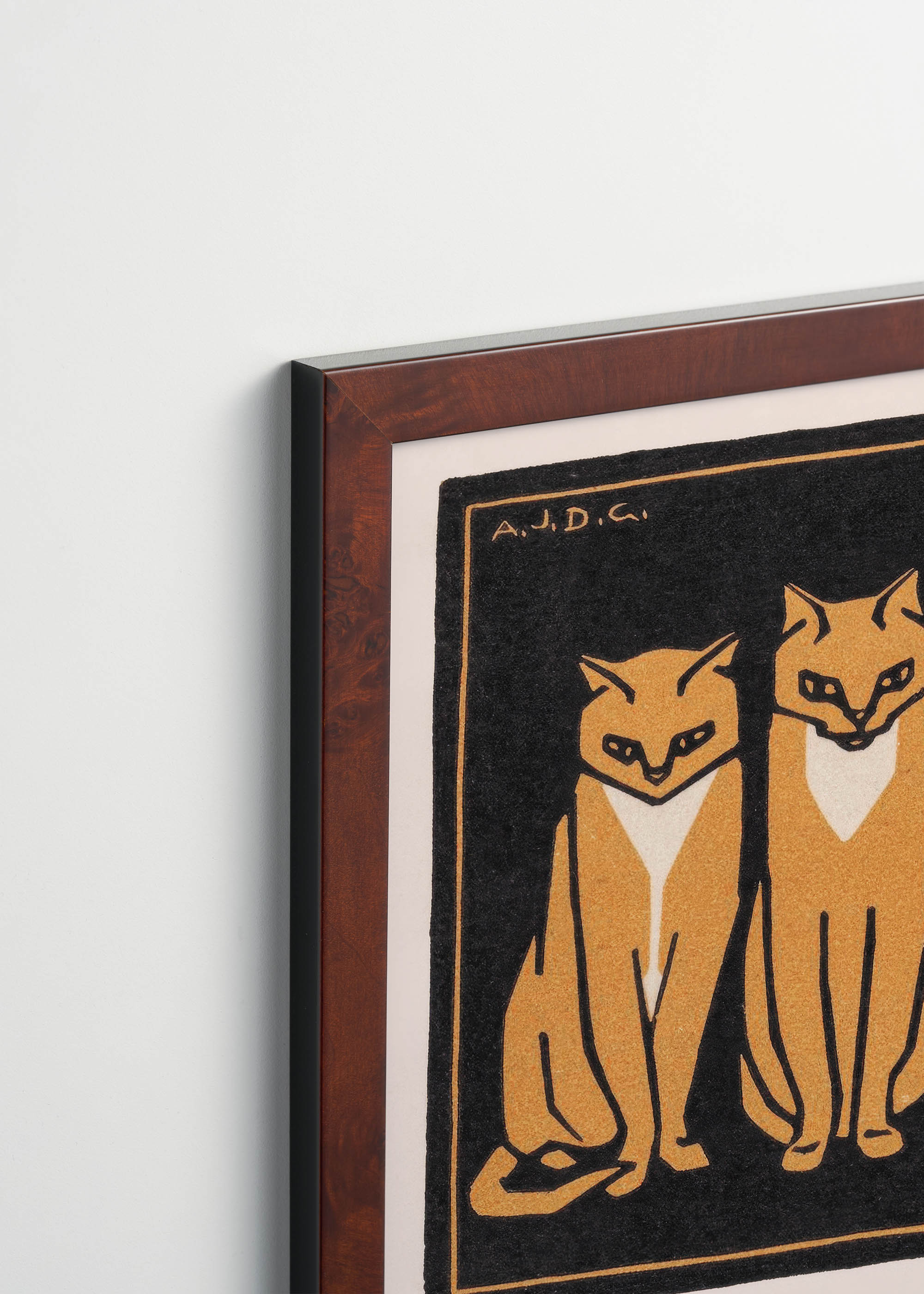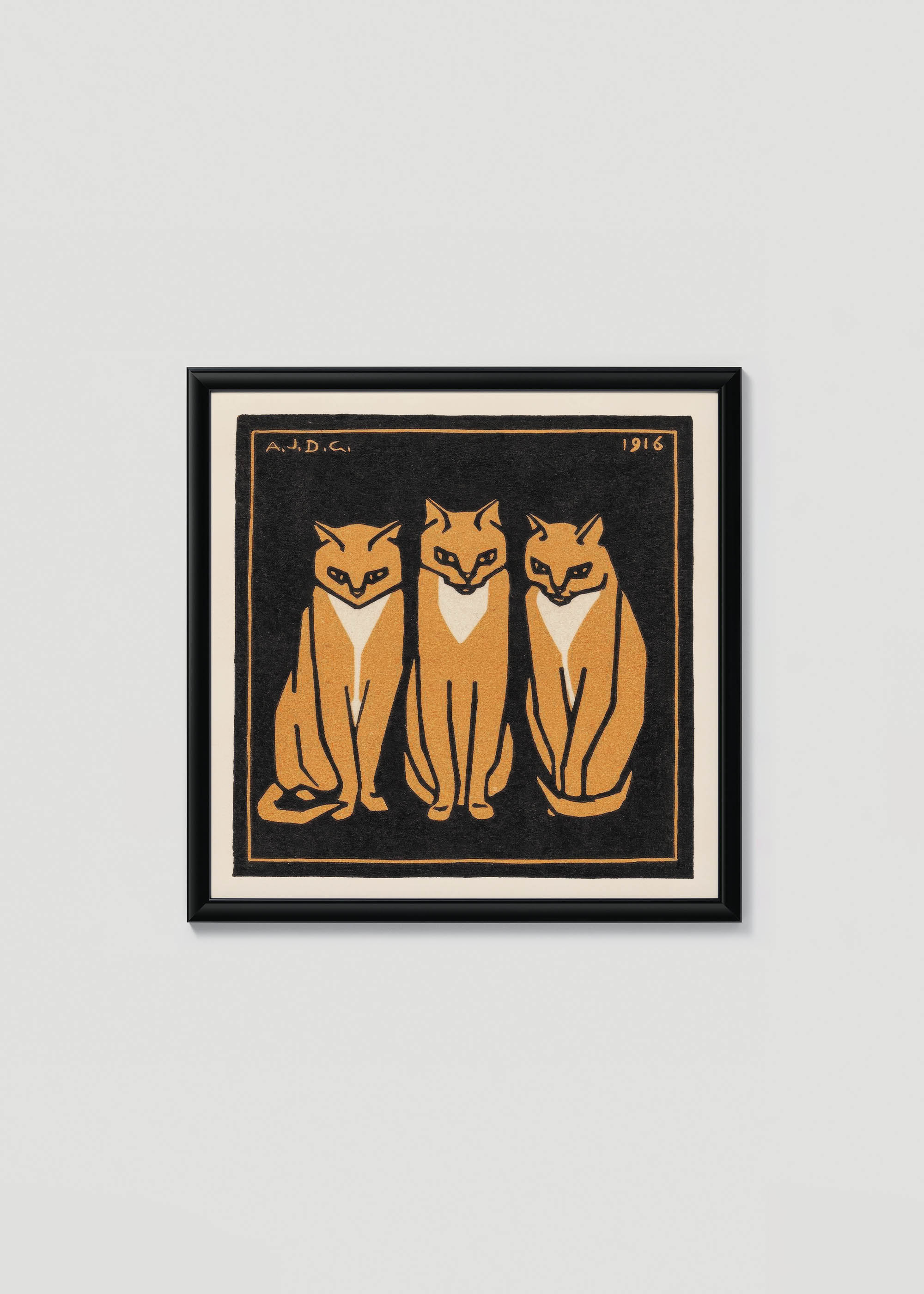 Plakat będący reprintem niezwykłego wzoru przedstawiającego trzy rude koty autorstwa Julie de Graag z 1916 roku to prawdziwy klejnot holenderskiej sztuki graficznej. De Graag, wybitna przedstawicielka ruchu Arts and Crafts w Niderlandach, tworzyła swoje dzieła w technice drzeworytu, co nadawało im charakterystyczną ekspresyjność i głębię. Ta konkretna kompozycja powstała w okresie szczytowej twórczości artystki, tuż przed jej przedwczesną śmiercią w 1924 roku.