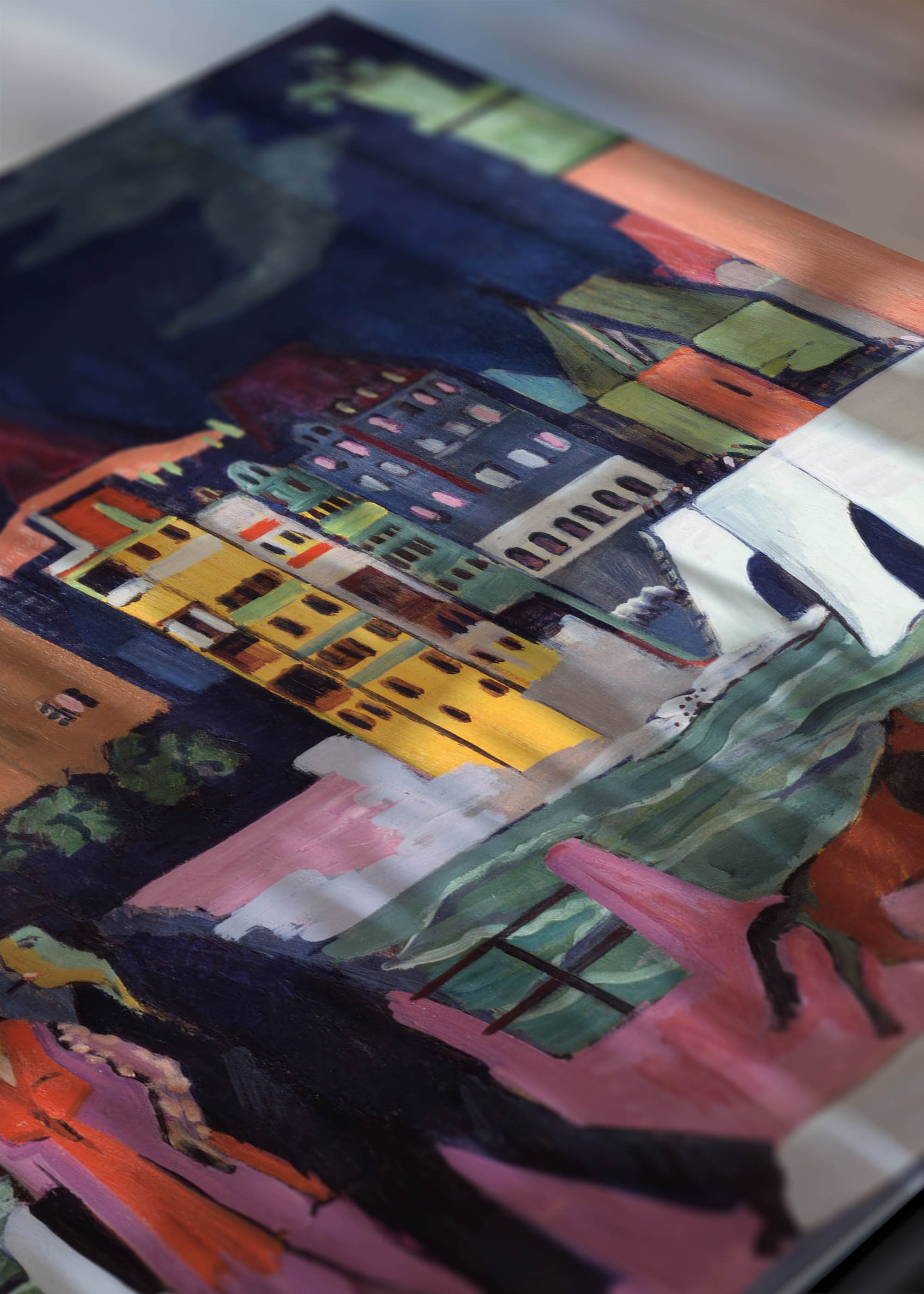 Sylwetki postaci na pierwszym planie – kobiety w czerwonej sukni i mężczyzny w ciemnym płaszczu – emanują energią nowoczesnego miasta. Kirchner uchwycił moment przechadzki po moście, gdzie codzienność miesza się z monumentalnością architektury tworzącej malowniczą panoramę.