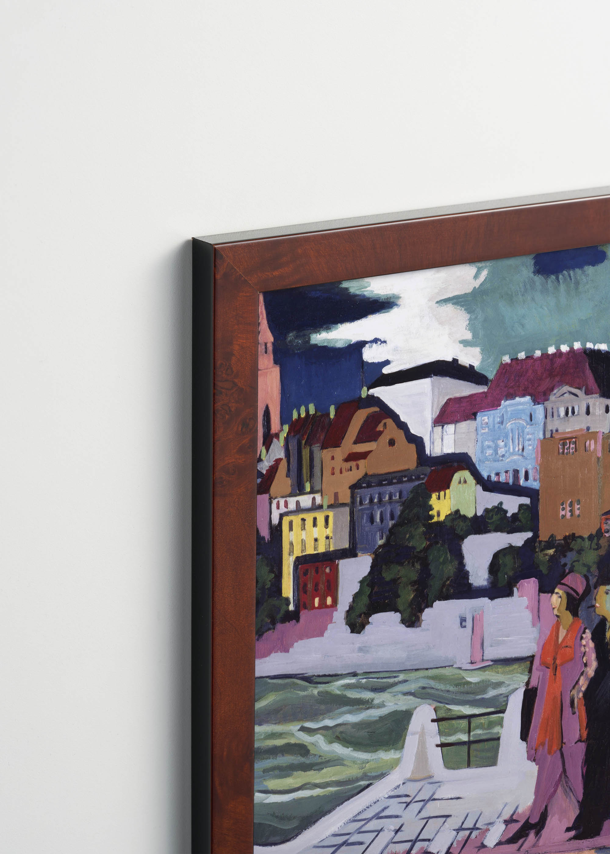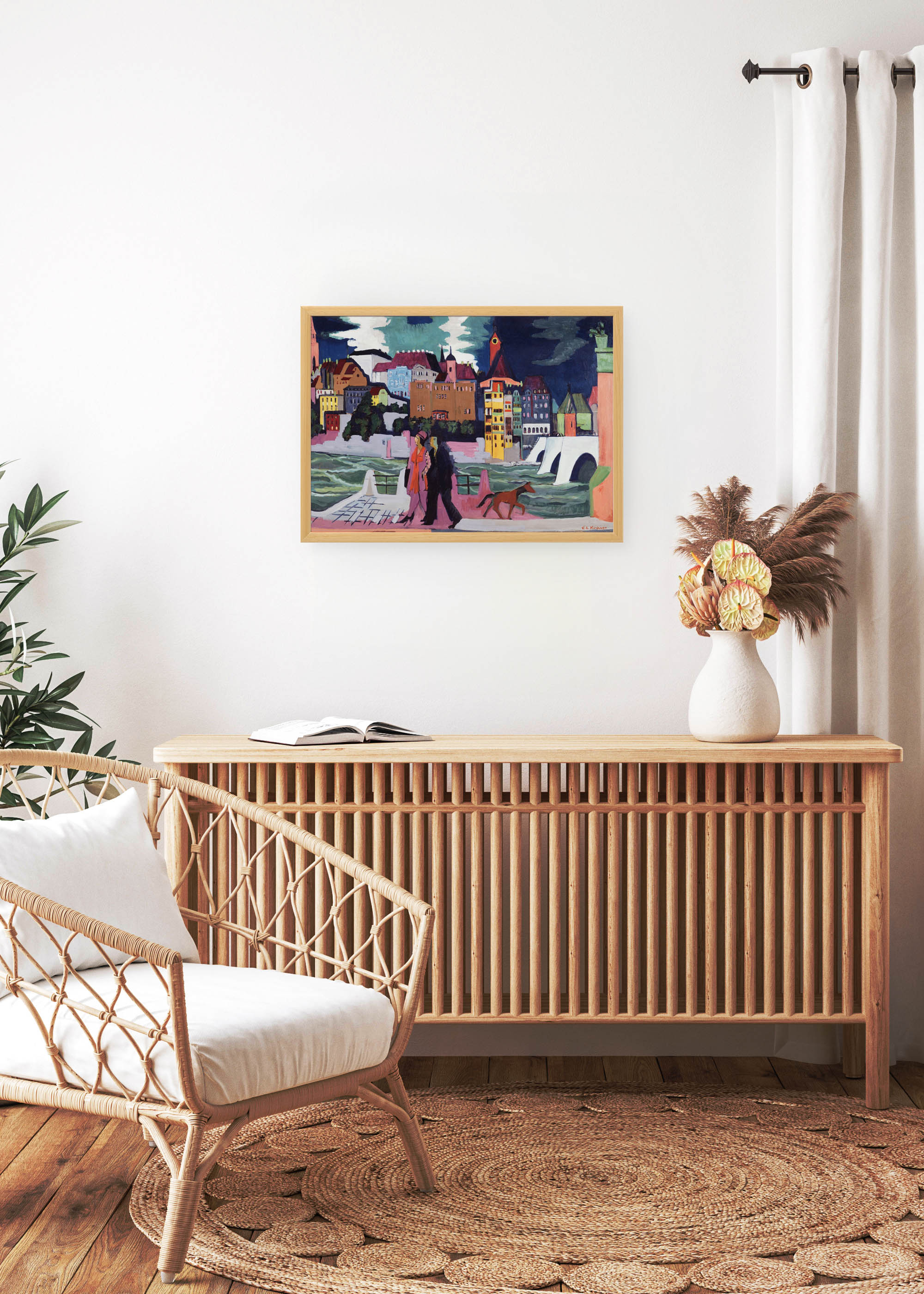 Ten fascynujący plakat będący reprintem dzieła Widok na Bazyleę i Ren z lat 1927-28 autorstwa Ernsta Ludwiga Kirchnera przenosi nas wprost do awangardowej atmosfery początku XX wieku. Kirchner, czołowy przedstawiciel niemieckiego ekspresjonizmu i założyciel grupy artystycznej Die Brücke, stworzył ten obraz około 1913-1914 roku, tuż przed wybuchem I wojny światowej, kiedy jego fascynacja miejskim życiem osiągnęła szczyt.