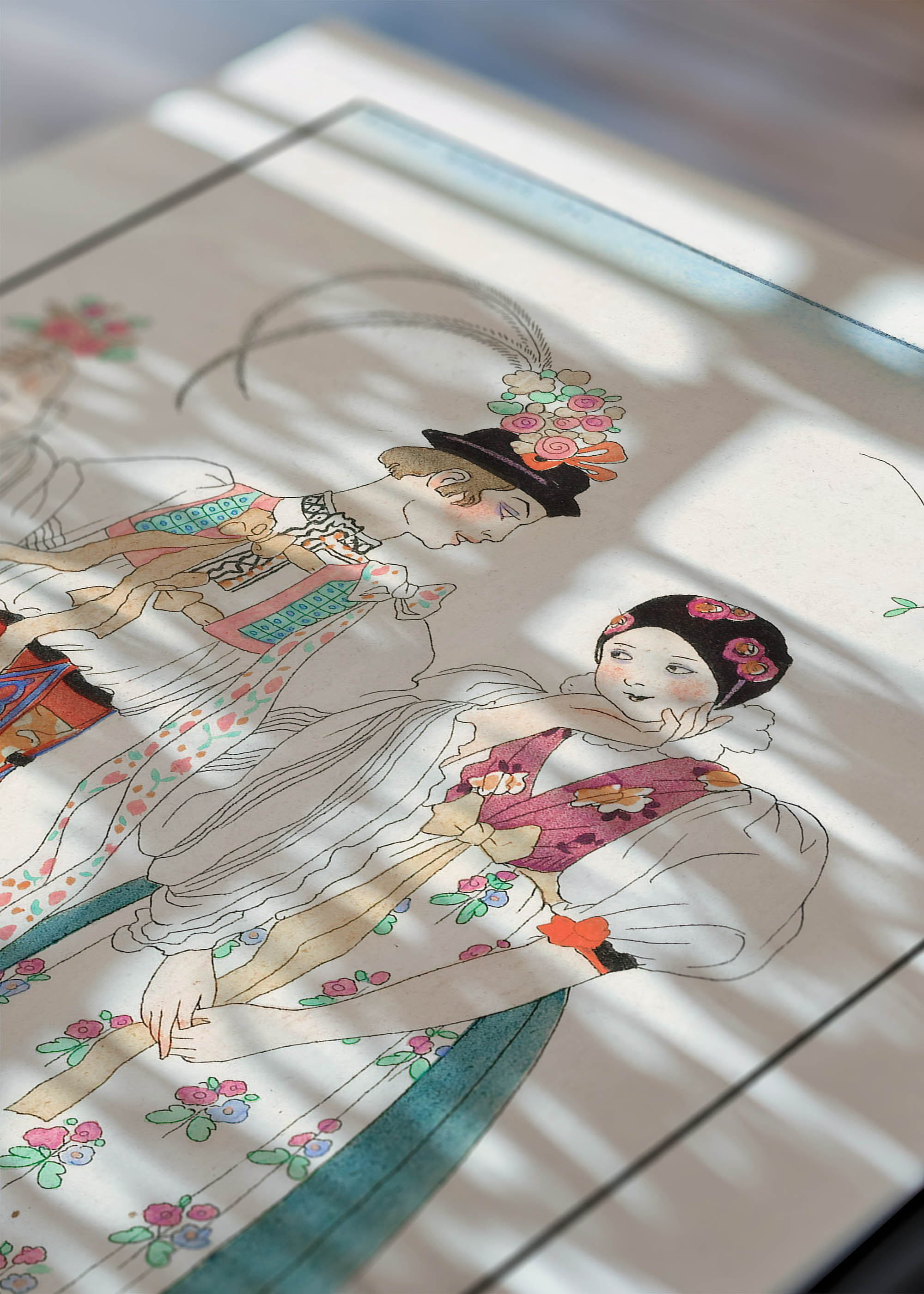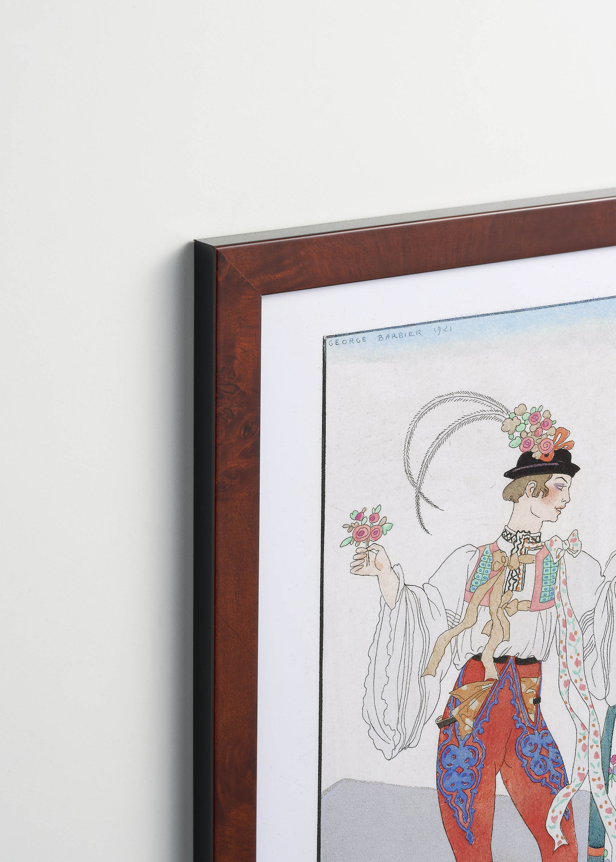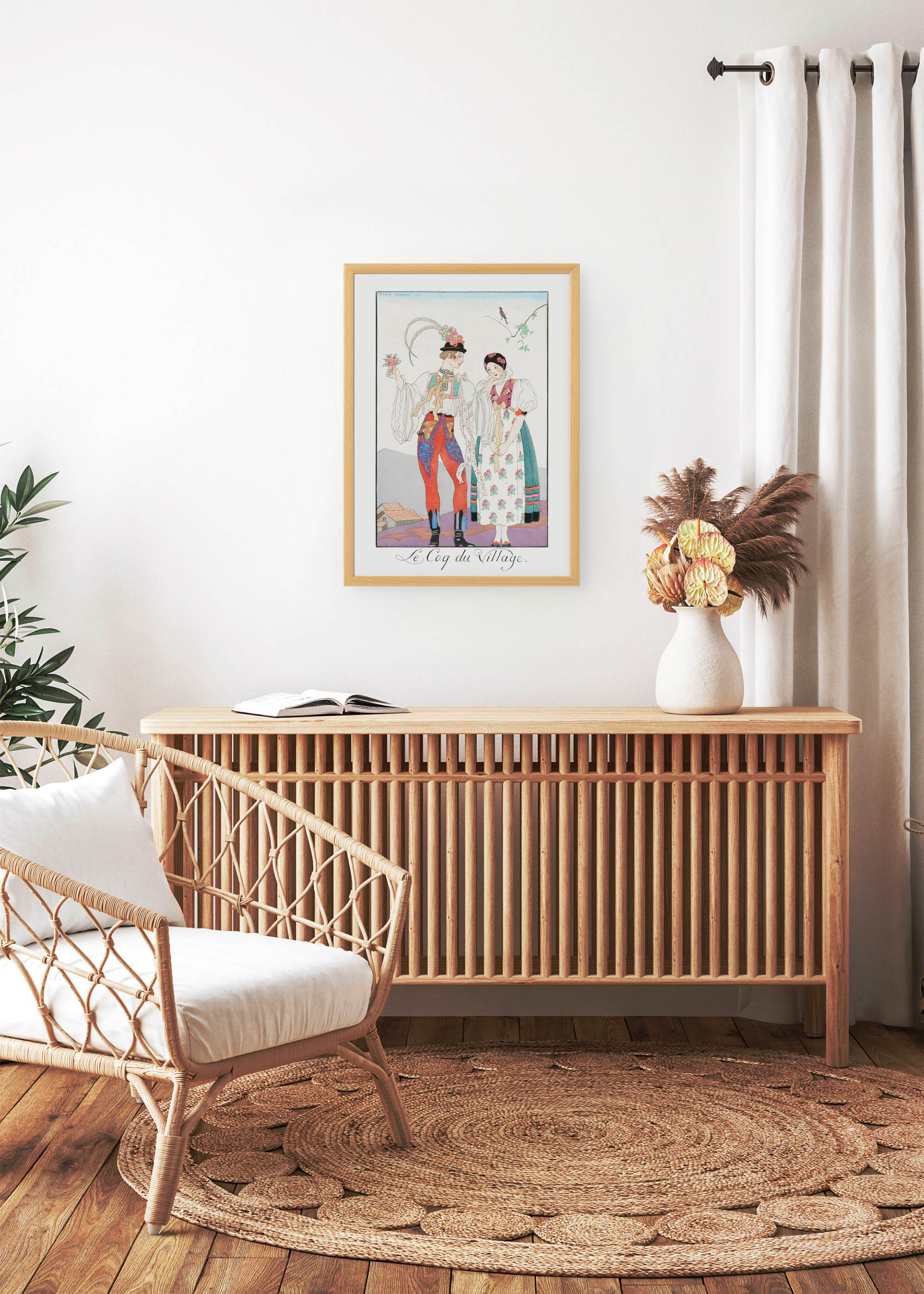 „Le Coq du Village” („Wiejski Kogut”) to wyjątkowa ilustracja autorstwa George’a Barbiera, wybitnego francuskiego artysty okresu Art Deco, stworzona w 1921 roku. Barbier, urodzony w Nantes w 1882 roku, zasłynął jako mistrz eleganckich ilustracji mody i kostiumów teatralnych. Jego prace regularnie zdobiły łamy prestiżowych magazynów, takich jak „La Gazette du Bon Ton” czy „Journal des Dames et des Modes”. Co ciekawe, artysta często czerpał inspirację z tradycyjnych strojów ludowych różnych regionów Europy, nadając im wyrafinowany, modernistyczny szlif.