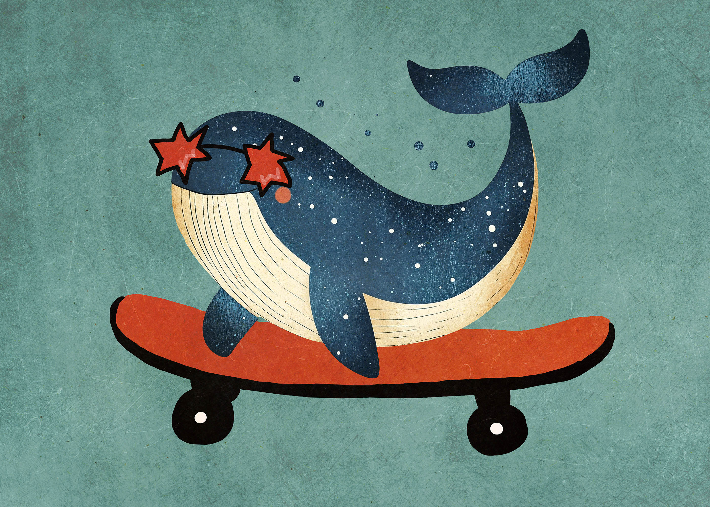Kolorystyka tej ilustracji zachwyca swoją harmonijną palettą – dominująca granatowa czerń przechodzi w odcienie pruskiego błękitu, kontrastując z ciepłą kadmową czerwienią deskorolki i rdzawymi akcentami gwiazd. Kremowa biel brzucha wieloryba dodaje kompozycji miękkości, podczas gdy turkusowe tło przypomina barwy spokojnych wód zatoki o świcie.