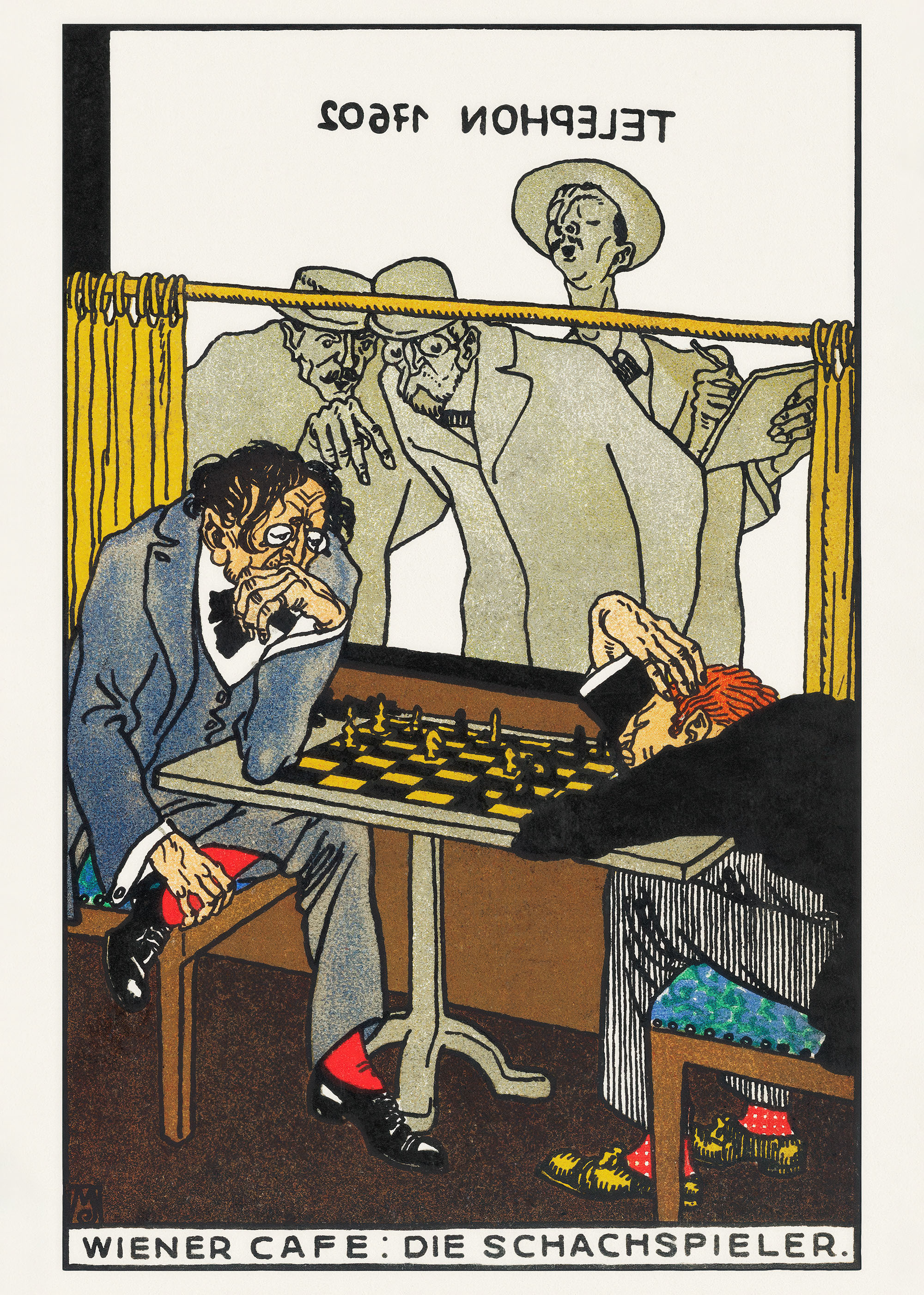 Kompozycja przedstawia trzech kibicujących mężczyzn pochylonych nad partią szachów, graną przez dwóch przeciwników. Moriz Jung z maestrią oddał napięcie intelektualnej rozgrywki – twarze obserwatorów wyrażają całą gamę emocji, od skupienia po rozbawienie. To prawdziwy dokument epoki, ukazujący kawiarniany rytuał, który był nieodłączną częścią wiedeńskiej belle époque.
