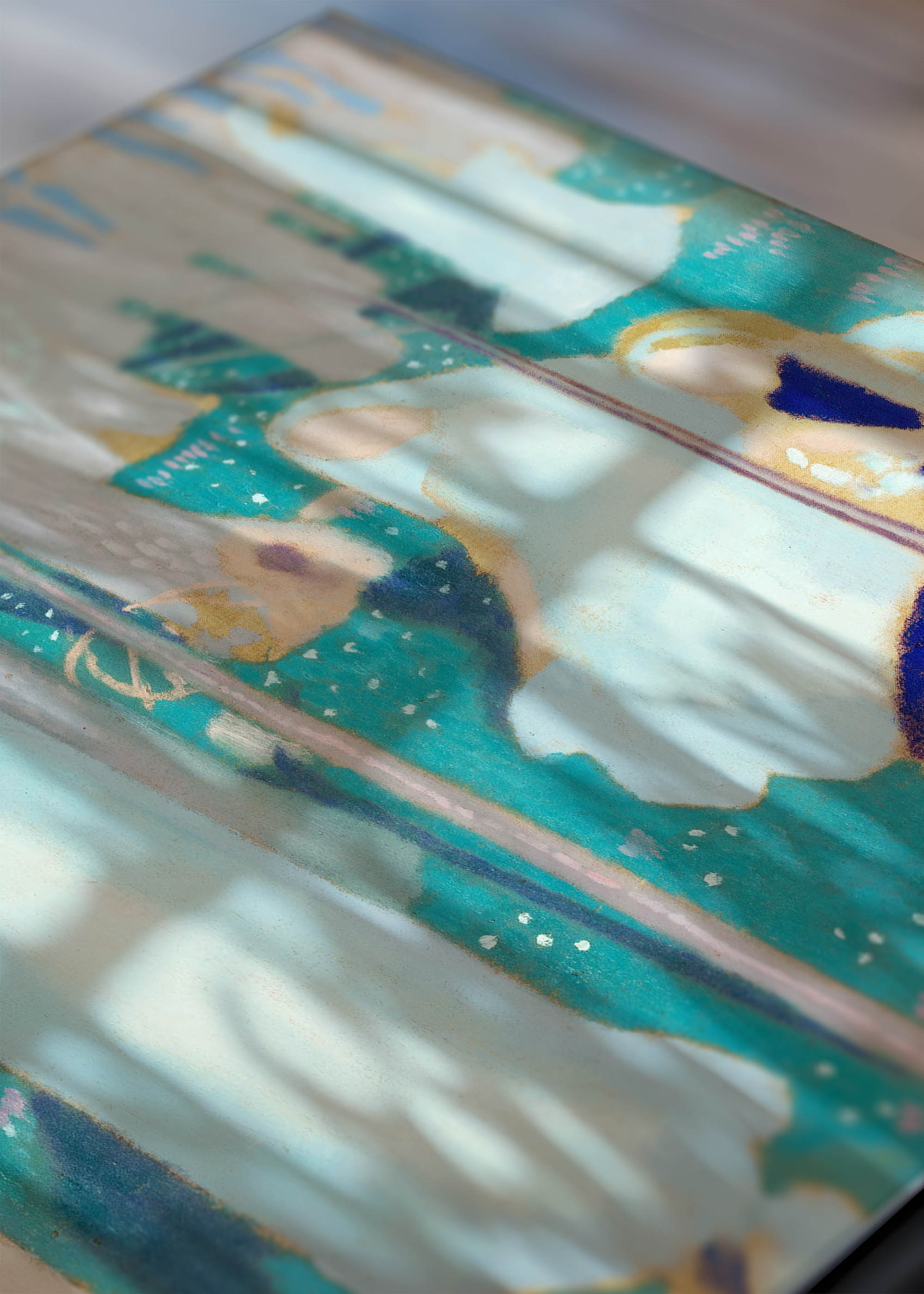 Scena przedstawia nastrojowe, niemal mistyczne przedstawienie postaci w przestrzeni przypominającej łaźnię czy antyczny termy. Sylwetki tonące w miękkiej, rozproszonej luminescencji tworzą poetycką opowieść o czystości i harmonii. Plakatello prezentuje ten wyjątkowy wzór jako idealny dodatek do wnętrz urządzonych w stylu skandynawskim, minimalistycznym czy klasycznym. Sprawdzi się doskonale w sypialni, łazience lub salonie, gdzie subtelna kolorystyka podkreśli spokojny, kontemplacyjny charakter pomieszczenia.