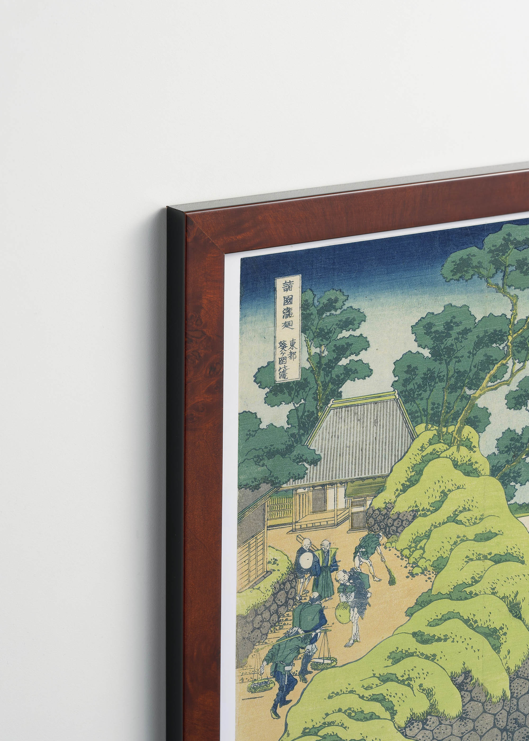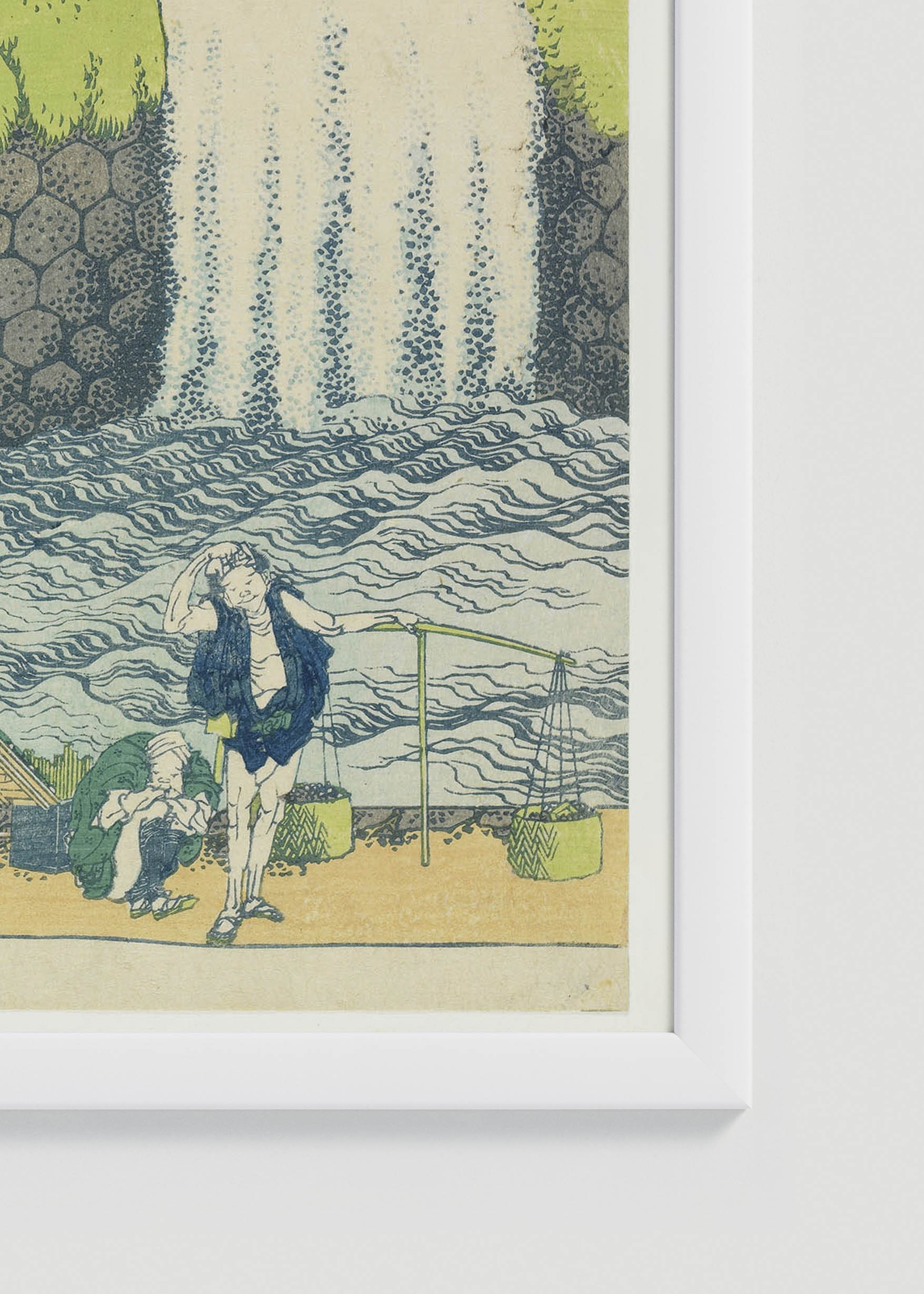 Plakat będący reprintem tego wzoru zachwyca charakterystyczną dla ukiyo-e paletą barw – dominują tu szmaragdowe zielenie gór pokrytych bujną roślinnością, które kontrastują z błękitem wody przechodzącym w granat u góry kompozycji. Ciepłe, piaskowe tony budynków i ścieżek wprowadzają harmonijny akcent, podczas gdy biel spienionego wodospadu dodaje dynamiki całości. Te barwy są zbliżone do tradycyjnych pigmentów używanych w japońskich drzeworytach – indygo, zieleni malachitowej i ochry.