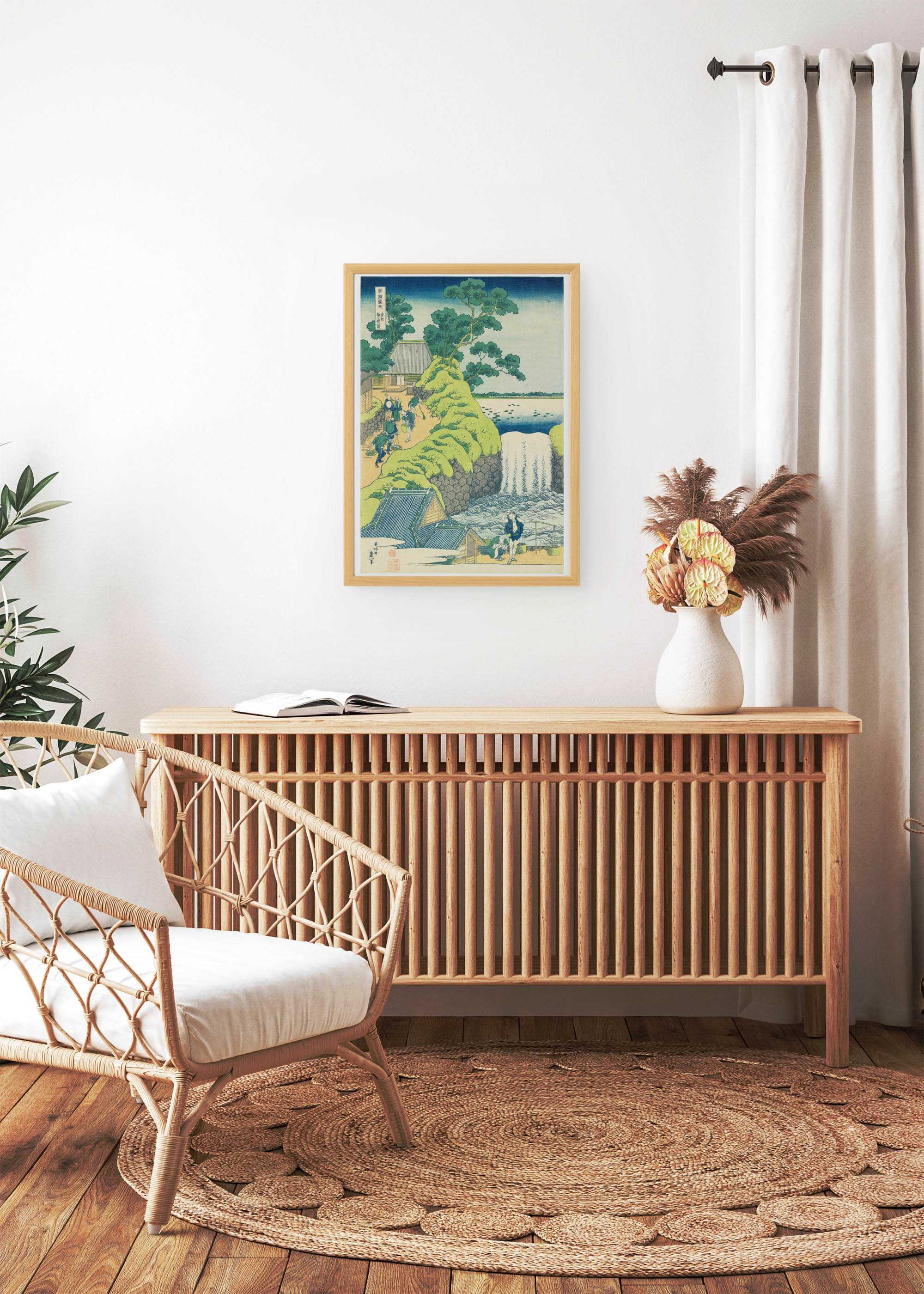 Przedstawiona scena ukazuje pielgrzymów wędrujących wzdłuż malowniczego szlaku, z widokiem na kaskadę spływającą po skalistym zboczu. Ta poetycka kompozycja idealnie wpasuje się w wnętrza urządzone w stylu japandi, minimalistycznym czy eklektycznym. Plakat Plakatello doskonale komponuje się z naturalnymi materiałami – drewnem, kamieniem czy lnem, a także z motywami roślinnymi i ceramiką w stonowanych barwach.